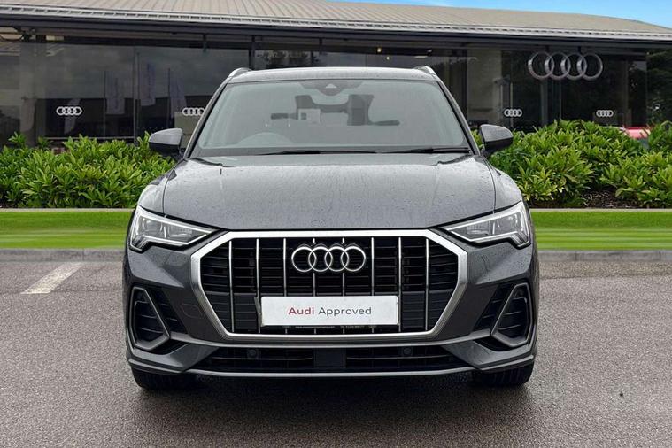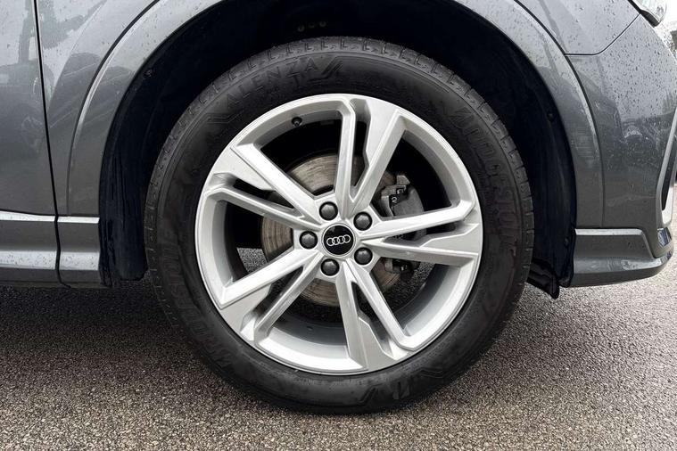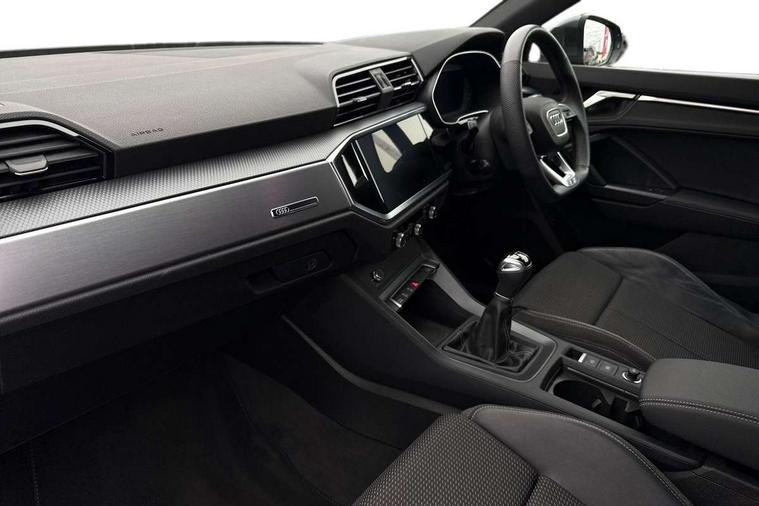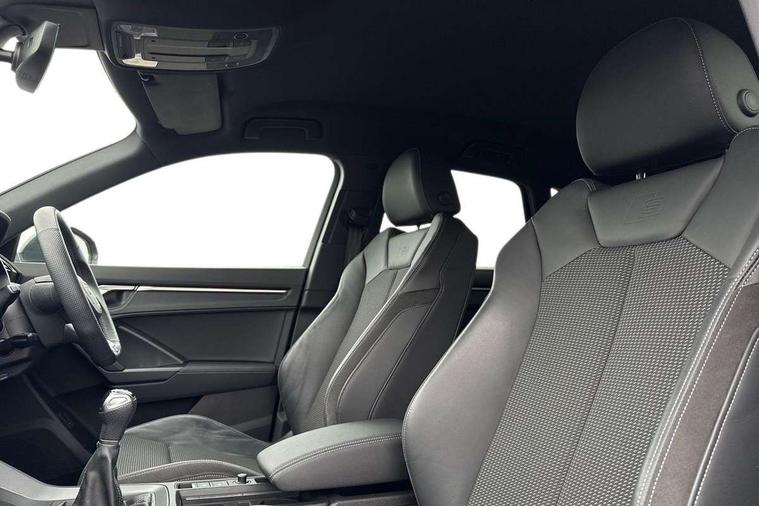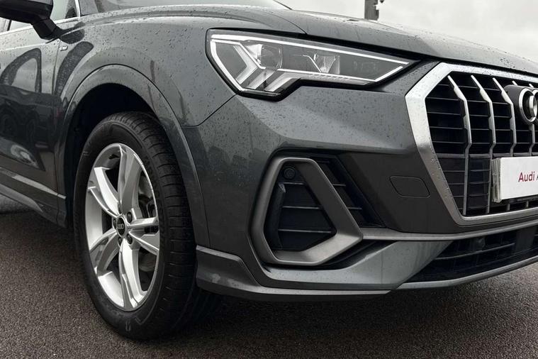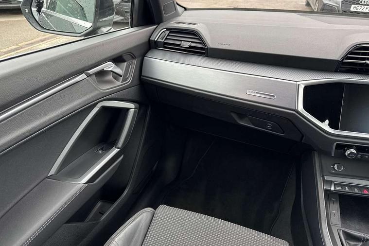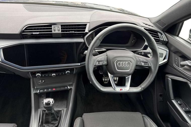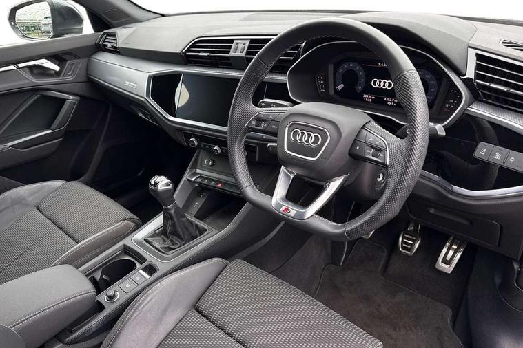 Amazon alexa Integration, Audi drive select, Audi lane departure warning, Audi Virtual Cockpit - 10.25" display, Bluetooth interface, Camera based traffic sign recognition, Cruise control + speed limiter, Legal emergency call, MMI Navigation Plus with high resolution 10.1 inch touchscreen colour display, Power operated tailgate, Progressive steering, Rear parking sensors, Service interval indicator, Smartphone interface includes wireless Apple carplay/Android Auto, Start stop system with recuperation, Voice control system with natural language interaction, Sports suspension, 2 USB-C ports with charge and data functions, 6 passive loudspeakers, DAB digital radio module, Acoustic windscreen, Aluminium roof rails, Aluminium window trim, Auto dimming frameless rear view mirror, Body colour front spoiler blade, Body coloured bumpers, Electrically folding, adjustable and heated door mirrors with integrated LED side indicators and kerb view function for passenger side, Front and rear electric windows, Front fog lights, Front side air inlets in matt platinum grey, Grille vertical bars in aluminium silver/Matt, High gloss black finish B and C pillars, LED Dynamic rear indicators, LED headlights with LED daytime running lights, LED rear lights, LED third brake light, Privacy glass dark tinted rear and rear-side windows (from B-pillar backwards), Rain and light sensors, Rear diffuser grille in grained matt black, Rear diffuser strip in matt titanium black, Rear side wing doors, Rear wiper, S line badges on front wings, S Line front and rear bumpers, Side skirt insert in matt Platinium grey, Titanium black radiator grille, Variable front intermittent wipers, 12V socket in rear centre console, 3 seat bench in 2nd row, 40:20:40 folding with manual adjustment for 60:40 forwards/backwards position and backrest angle, Adjustable rear seat bench/backrest with centre armrest and cupholder, Black cloth headlining, Dual zone electronic climate control, Front and rear black floor mats with contrast stitching in rock grey, Front and rear headrests, Front and rear roof module including reading lights, Front centre armrest, Glove compartment lighting, Height and reach adjustable steering wheel, Illuminated door sill trims with S logo, ISOFIX child seat mounting for front passenger with airbag deactivation and outer rear seat including top tether attachment point for outer rear seats, Luggage compartment light, Manual front seats with height adjustment, Perforated leather gearknob, Single front passenger seat, Stainless steel luggage compartment sill finisher, Stainless steel pedals, Ambient lighting pack - Q3, Non smoking pack - Q3, 3x3 point rear seatbelts, 6 airbags - Driver, front passenger, curtain and side windows, Audi pre-sense front with pedestrain and cyclist recognition, Electrically operated child locks on rear doors, Electromechanical parking brake, Electronic stabilisation control including ABS, ASR and EDL, Front seatbelt reminder, Hill descent control, Hill hold assist, Pre sense basic, Seatbelt monitoring, Tyre pressure warning, Warning triangle and first aid kit, Anti theft alarm, Anti theft wheel bolts, Immobiliser, Remote central locking, Dark matt brushed aluminium inlay, Detail dashboard around MMI touch colour display in glass look, black with surround in aluminium look, Leatherette door armrest,