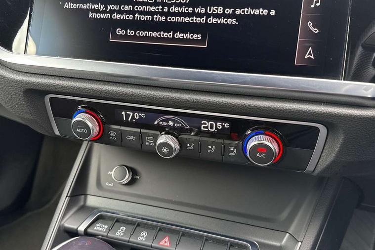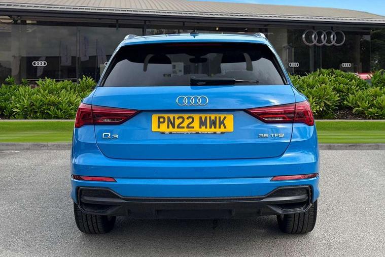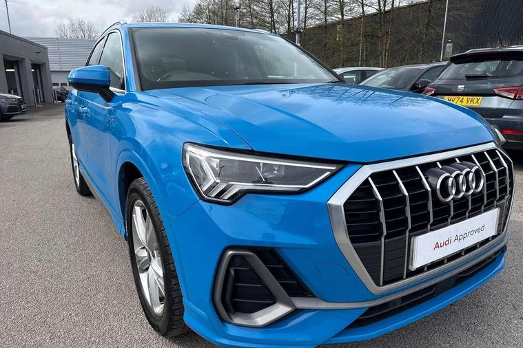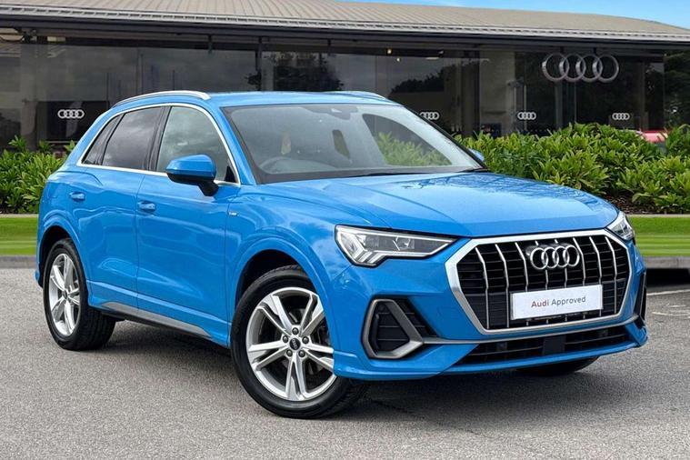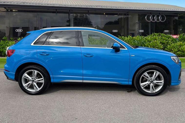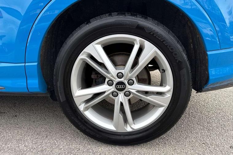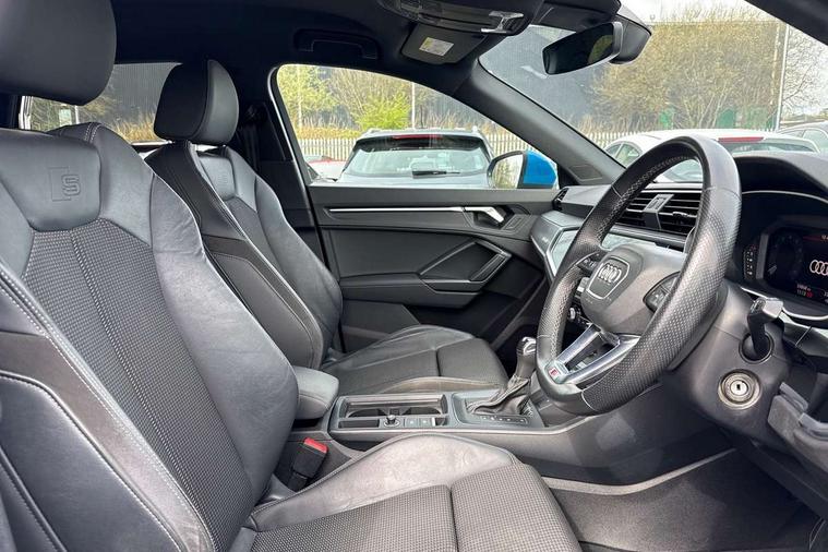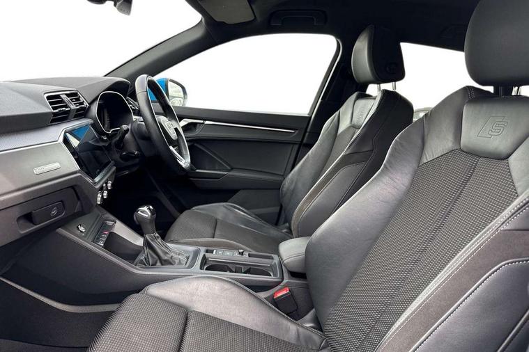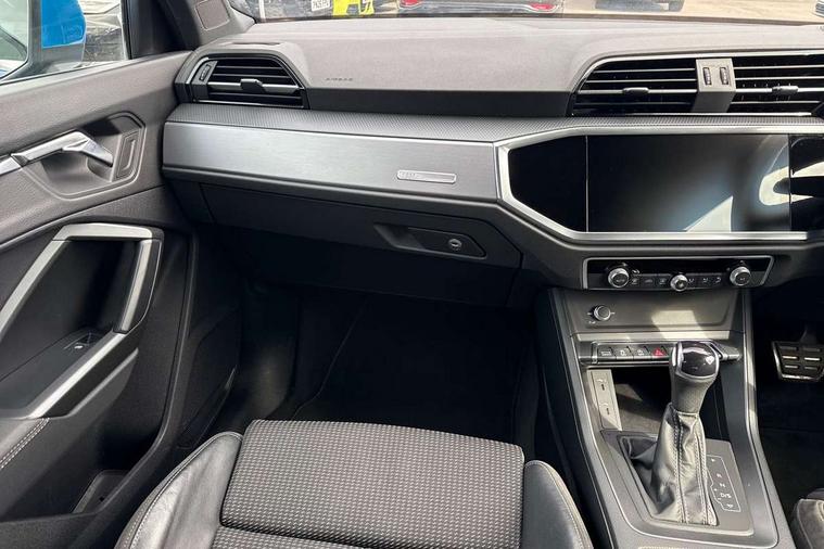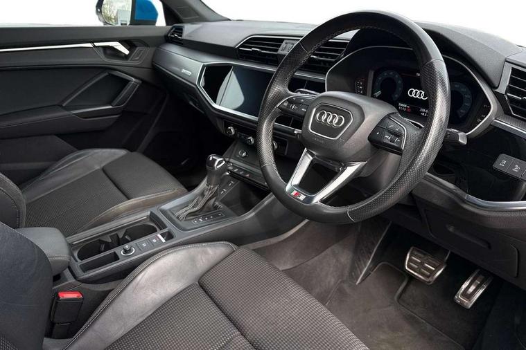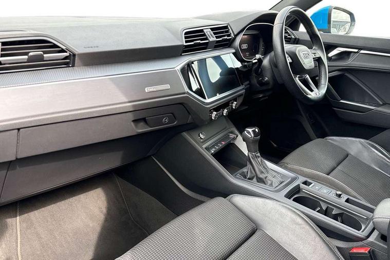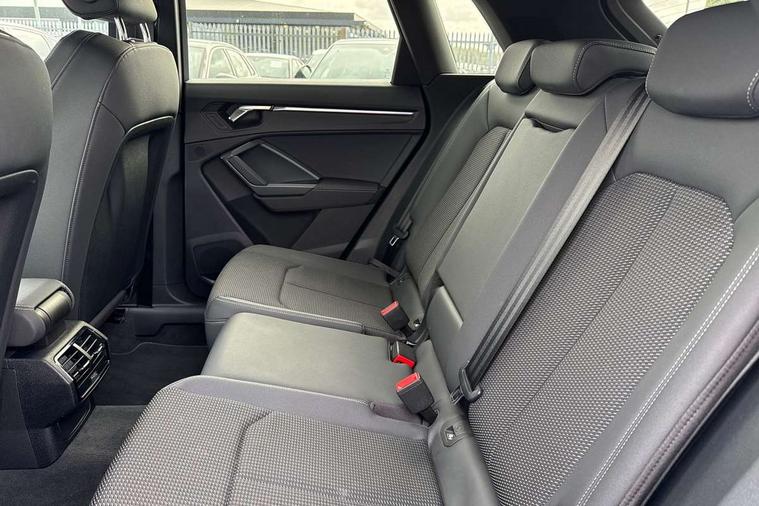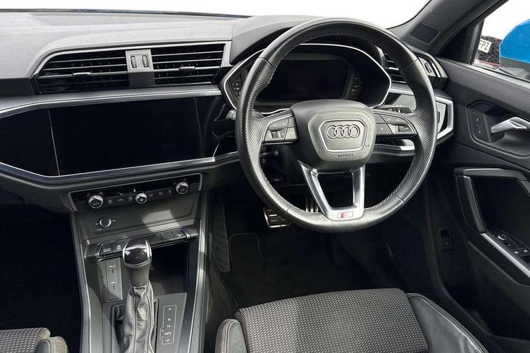 Amazon alexa Integration, Audi connect safety and service (e-call), Audi drive select, Audi lane departure warning, Audi Virtual Cockpit - 10.25" display, Bluetooth interface, Camera based traffic sign recognition, MMI Navigation Plus with high resolution 10.1 inch touchscreen colour display, Power operated tailgate, Progressive steering, Service interval indicator, Smartphone interface includes wireless Apple carplay/Android Auto, Start stop system with recuperation, Voice control system with natural language interaction, 48V Mild hybrid technology, Sports suspension, 2 USB-C ports with charge and data functions, 6 passive loudspeakers, DAB digital radio module, Acoustic windscreen, Aluminium roof rails, Aluminium window trim, Auto dimming frameless rear view mirror, Body coloured bumpers, Electrically folding, adjustable and heated door mirrors with integrated LED side indicators and kerb view function for passenger side, Front and rear electric windows, Front fog lights, Front side air inlets in matt platinum grey, Front spoiler blade in matt platinum grey, Grille vertical bars in aluminium silver/Matt, High gloss black finish B and C pillars, LED headlights with LED daytime running lights, LED rear lights, LED third brake light, Privacy glass dark tinted rear and rear-side windows (from B-pillar backwards), Rain and light sensors, Rear diffuser strip in matt titanium black, Rear side wing doors, Rear wiper, S line badges on front wings, S Line front and rear bumpers, Side skirt insert in matt Platinium grey, Silver chrome grille surround, Titanium black radiator grille, Variable front intermittent wipers, 12V socket in rear centre console, 3 seat bench in 2nd row, 40:20:40 folding with manual adjustment for 60:40 forwards/backwards position and backrest angle, Adjustable rear seat bench/backrest with centre armrest and cupholder, Black cloth headlining, Dual zone electronic climate control, Front and rear black floor mats with contrast stitching in rock grey, Front and rear headrests, Front and rear roof module including reading lights, Front centre armrest, Glove compartment lighting, Height and reach adjustable steering wheel, Illuminated door sill trims with S logo, ISOFIX child seat mounting for front passenger with airbag deactivation and outer rear seat including top tether attachment point for outer rear seats, Luggage compartment light, Manual front seats with height adjustment, Perforated leather gearknob, Single front passenger seat, Stainless steel luggage compartment sill finisher, Stainless steel pedals, Non smoking pack - Q3, 3x3 point rear seatbelts, 6 airbags - Driver, front passenger, curtain and side windows, Audi pre-sense front with pedestrain and cyclist recognition, Electromechanical parking brake, Electronic stabilisation control including ABS, ASR and EDL, Front seatbelt reminder, Hill descent control, Hill hold assist, Manual child lock in rear doors, Pre sense basic, Seatbelt monitoring, Tyre pressure warning, Warning triangle and first aid kit, Anti theft alarm, Anti theft wheel bolts, Immobiliser, Remote central locking, Dark matt brushed aluminium inlay, Detail dashboard around MMI touch colour display in glass look, black with surround in aluminium look, Leatherette door armrest, Tool kit, Tyre repair kit,