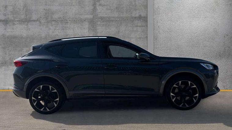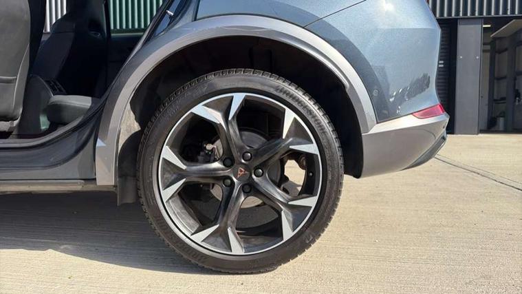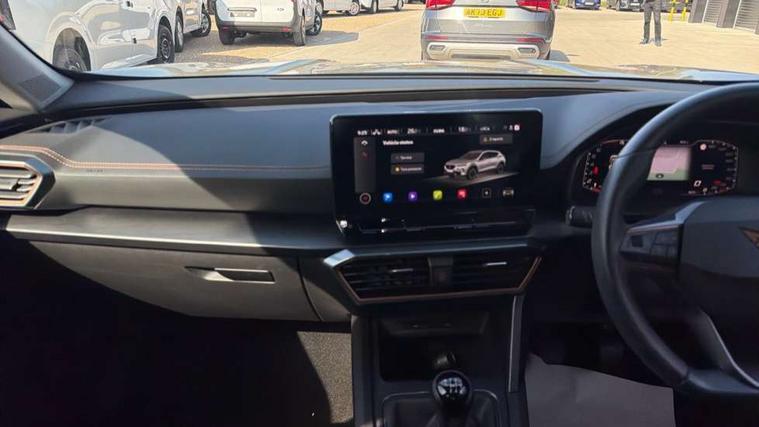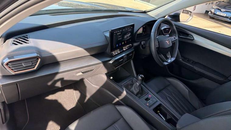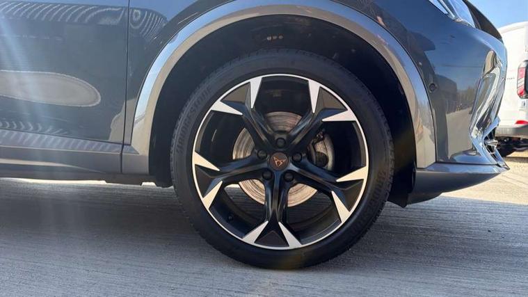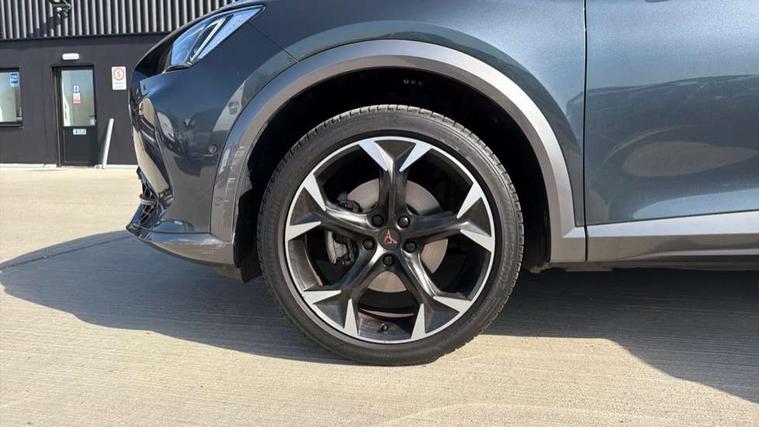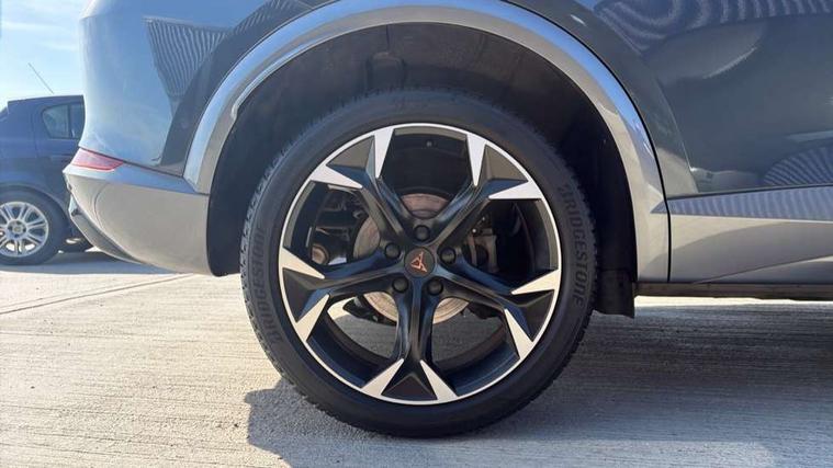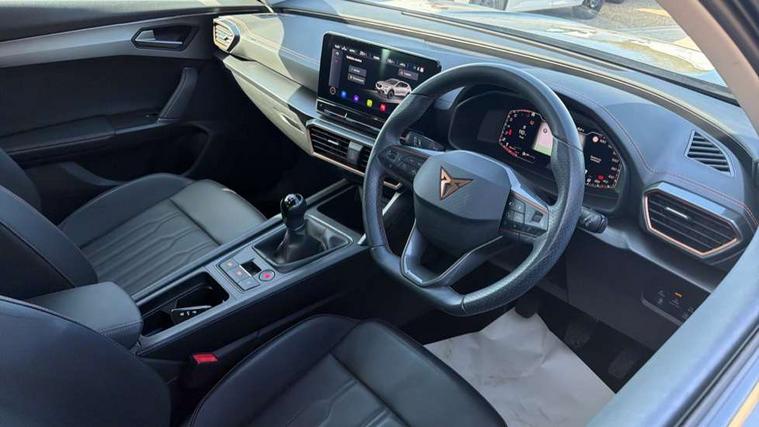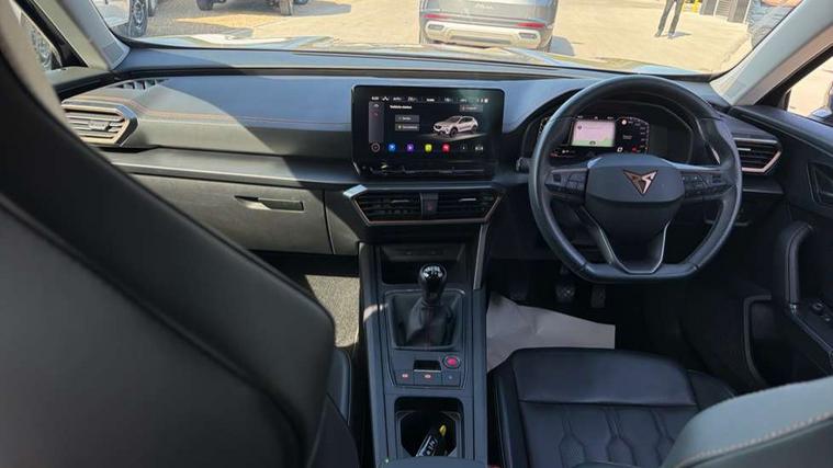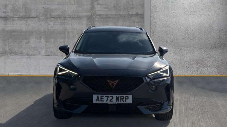 Digital cockpit and configurable dashboard, Driver alert system, Driving profile selection, E-call, Forward collision warning with automatic braking, Lane assist, Navigation system with 12'' Touchscreen Display, Park assist (inc front/rear parking sensors), PAS, Predictive adaptive cruise control with speed limiter, Rear view camera, RPM, trip computer, outside temp gauge, instrument light brightness, low fuel warning light, lights on reminder, gearshift indicator, Service interval indicator, Start/stop system with regenerative braking, Voice control system, Wireless apple carplay, Wireless phone charger, Electronic locking differential and dynamic traction support, Standard suspension, 2 front and 2 rear USB type C sockets, Auxiliary input socket, DAB radio, Auto dimming rear view mirror, Body colour door handles, Body coloured bumpers, Dark grey wing mirror, Daytime running light with automatic headlight control and coming home feature, Dynamic headlight range control, Electric front/rear windows, Electrically adjustable heated and folding door mirrors with memory function, Front fog lamps with cornering function, Gloss black roof rails and window surrounds, LED Headlights, LED Taillights with dynamic indicator, Rain sensing wipers, Rear diffuser with black simulated exhaust pipes, Rear side wing doors, Rear wash/wipe, Third brake light, Tinted rear windows, Welcome lights, 12v power supply in centre console, 12V socket, 12v socket in loadspace, 2 front and 2 rear reading lights, 230V socket, 3 seat bench in 2nd row, 60/40 split rear bench seat with armrest and mechanical seat release, Black headlining, Dust/pollen filter, Front and rear head restraints, Front centre armrest, Height/reach adjust steering wheel, Illuminated interior front door sills, Illuminated sunvisor with mirror, Isofix, Leather multi function steering wheel, Luggage tie-down hooks, Single front passenger seat, Three zone climate control with control panel in rear, Variable luggage/load compartment floor, Wraparound lighting, Genuine Nappa leather Pack - Cupra, Safety and driving pack (M) - Formentor, 3 point seatbelts on all rear seats, ABS, Brake control system - ESC and brake booster, Child proof door locks, Driver and front passenger airbags with front passenger airbag de-activation, Electronic parking brake, Front and rear disc brakes, Front side curtain airbags, Hill hold control, Seat belt reminder for front and rear seats, Tyre pressure monitoring system, Anti theft alarm system, Keyless entry and start system (KESSY), Locking wheel bolts, Copper and aluminium interior detailing, 19" 'Exclusive' machined sport matte black and silver alloy wheels,
