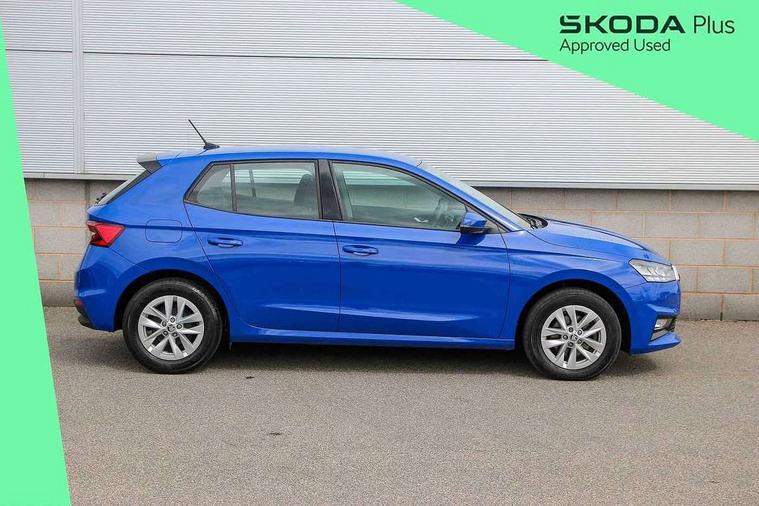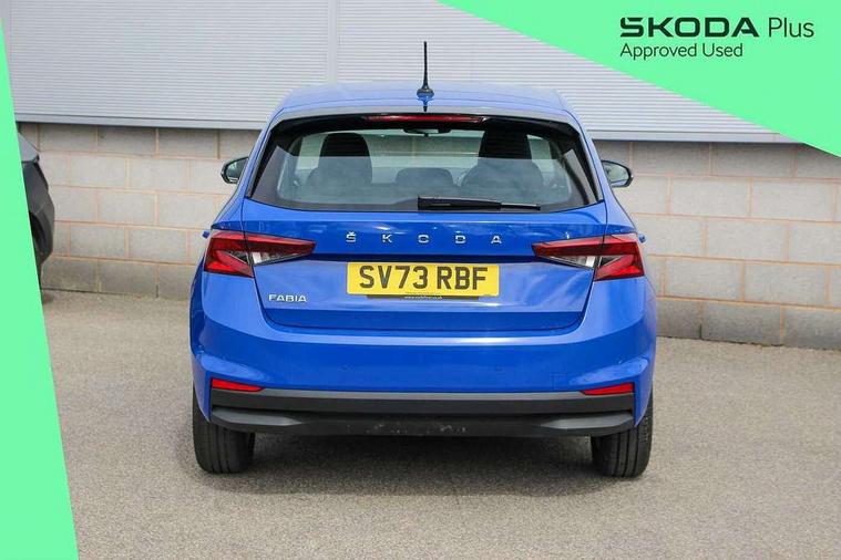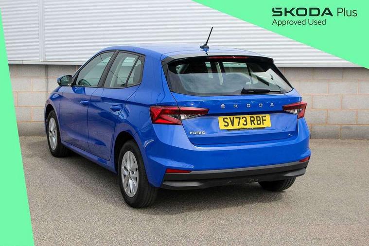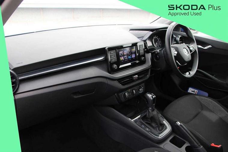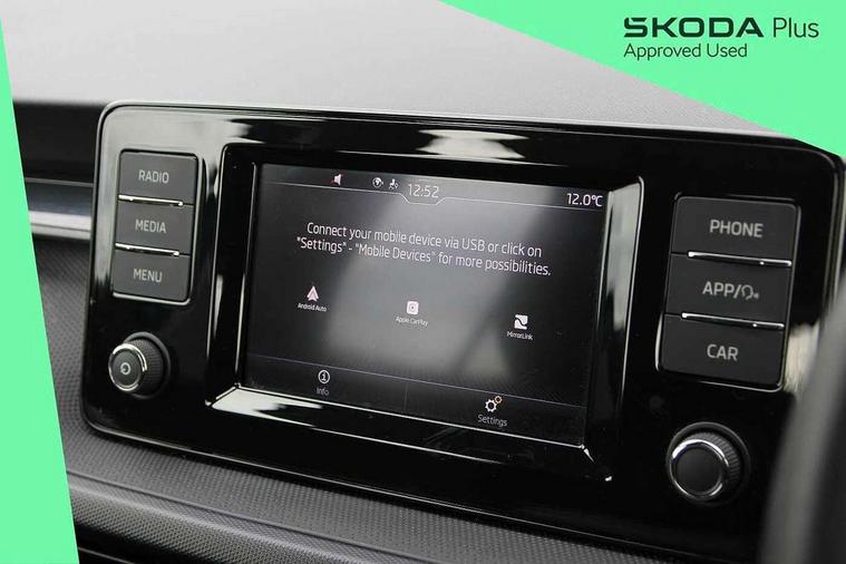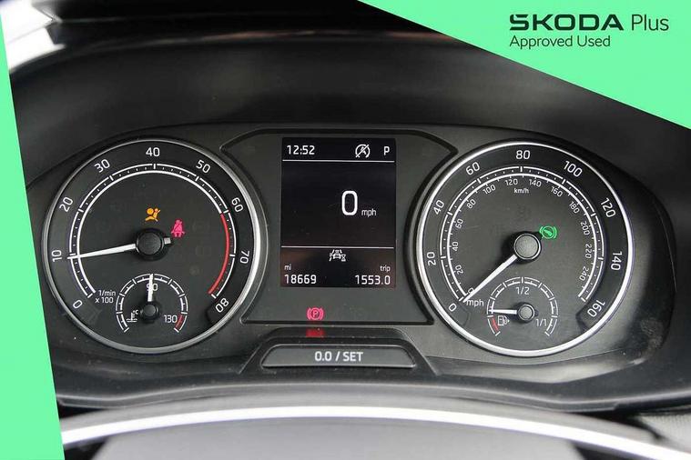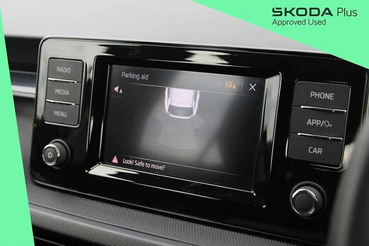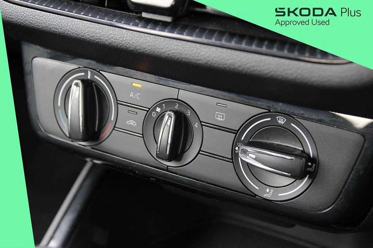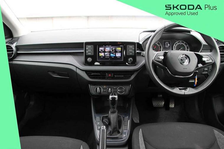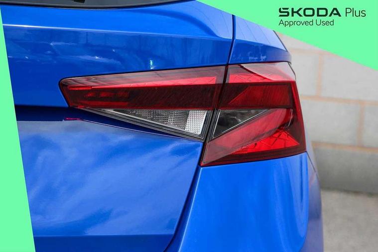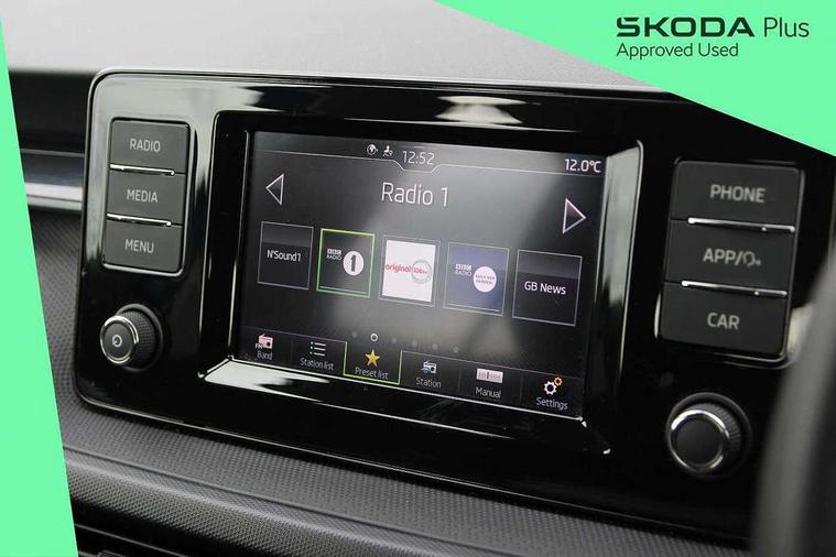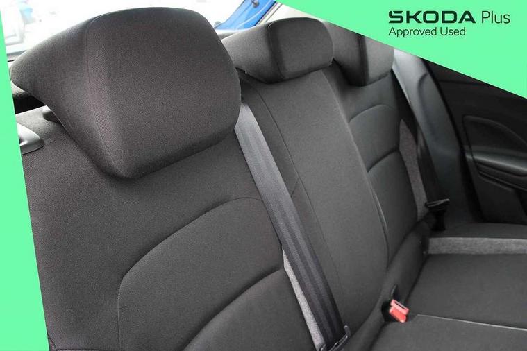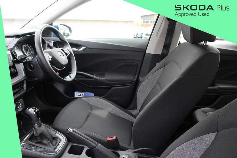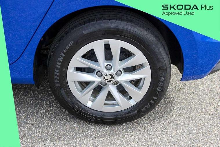 Bluetooth connection, Driver alert system - DAS, Electromechanical power steering, Exterior temperature gauge, Lane assist including road edge detection, Multifunction trip computer in black and white, Rear parking sensors, Service interval indicator, Speed limiter, 2x USB-C in the front (for data transmission and charging), 4 speakers in front, Auxiliary socket for external MP3 player, DAB digital radio reception, Radio Swing with 6.5" colour display, Basic LED Headlights, Basic rear lights, Body colour door mirrors, Body coloured bumpers, Dimming rear view mirror with black frame, Door mirror integrated indicators, Electrically adjustable and heated door mirrors, Electrically adjustable front windows with function auto up/down, Front fog lights, Front window wiper intermittent control, Headlight range control - Automatic, Ice scraper in fuel cap, LED daytime running lights with coming and leaving home feature, Mechanical adjustable rear windows, Rain sensor, Rear LED fog light, Rear side wing doors, Rear window wiper with washing nozzles, Roof mounted spoiler, SKODA tailgate lettering in chrome, Third brake light, 2 reading lights in front and 2 reading lights in rear, 2 spoke leather multifunction steering wheel, 3 rear headrests, Backrest split and folding, Central console with fixed cup holder and storage box, Chrome handbrake release button, Fabric upholstery, Gearshift knob/handle in leather, Grain satin black interior door handles, Hand brake lever handle in leather, Height adjustable front headrests, Height adjustable front seats, Height adjustable steering wheel, ISOFIX and TopTether anchorage points to the outer rear seats, ISOFIX and TopTether on the front passenger seat, Luggage compartment lighting, Manual air conditioning, Manually adjustable lumbar support in front seats, Pollen filter, Rear seat bench unsplit, Single front passenger seat, Storm grey headlining, Sun visors with mirror and airbag label on passenger side, Ticket holder, 3-point height adjustable front seats belts with pretensioner and force limiter, Automatic warning lights in case of crash, Driver and passengers airbag with switch off function, e-Call+, ESC including ABS, MSR, ASR, EDS, HBA and XDS, Front and rear seat belt warning, FRONT ASSIST (AEB City and AEB Inter Urban), Front side airbags, Head airbags, Hill hold assist, One tone horn, Pedestrian protection, Three rear 3-points safety seat belts with pretensioner and force limiter including stop function for outer rear seat belts, Tyre pressure monitoring system, Anti-theft alarm system including immobiliser, interior monitoring, backup horn, and towing protection, Central locking with radio remote control, interior controls, SAFE function and 2 foldable keys, Black painted air vents, Glossy black decorative trim, Grain satin black central console cover, Grain satin black lower decorative trim, Satin black door and side trim panel in front, Anti-theft wheel bolts protection, Super-low rolling resistance tyres,