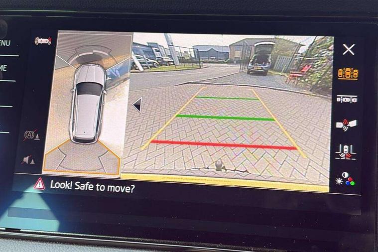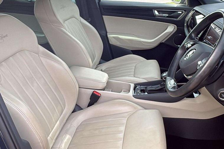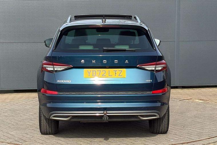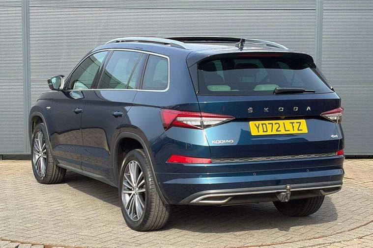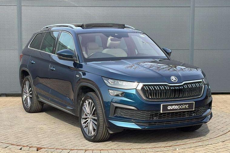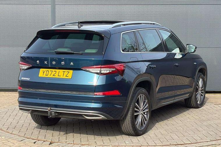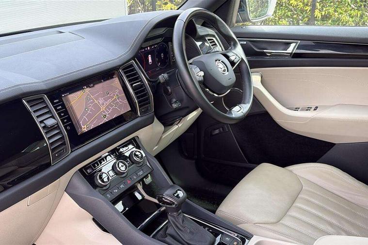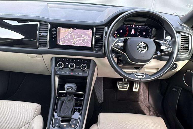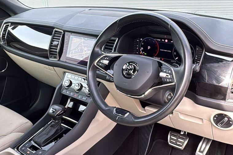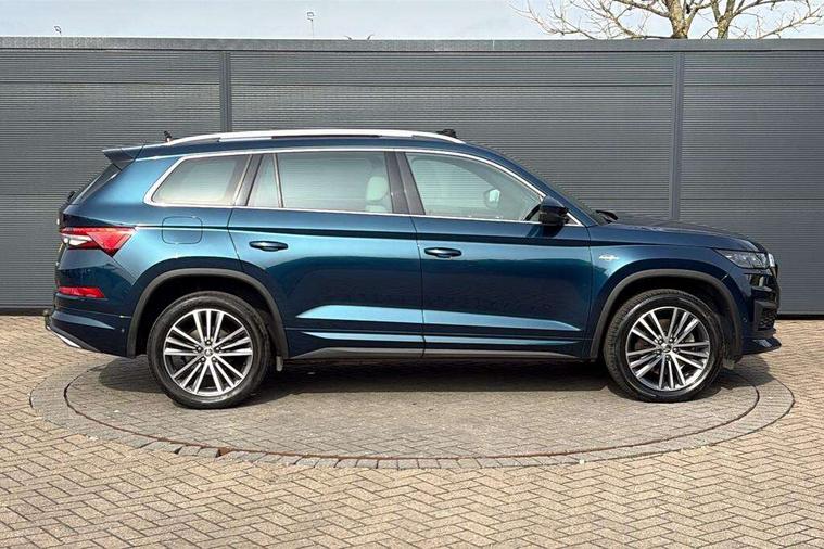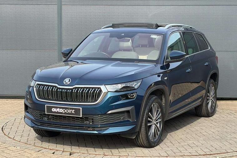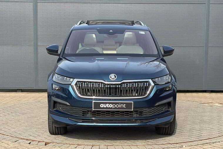 Area view, Blind spot detection system, Bluetooth system, Columbus satellite navigation with 9.2" touchscreen, integrated Wi-Fi, web radio, Digital voice enhancement, E-call, ECO Stop/start function, Exterior temperature indicator, Progressive steering, Smartlink wireless for apple carplay and wired for android auto, Speed limiter, Tailgate unlocking from outside, USB C Port x 2 in front centre console, Virtual Cockpit - 10.25" digital display, Wireless charging, Canton sound system, DAB Digital radio, Aero front windscreen wipers with intermittent function, Aero rear window wiper, Auto dimming rear view mirror, Black wheel arch surrounds, Body colour bumpers, Body colour door mirrors and handles, Body colour door panels, Chrome front grille, Chrome roof rails with chrome window surround, Electric adjustable/heated/folding door mirrors, driver side auto dimming with boarding sports and memory function, Electric front and rear windows, Extended rear spoiler with finlets in gloss black, Front fog lights, Full LED matrix headlights with AFS (adaptive front light system), cornering function and AWL (all weather lighting system), Headlight washers, Heated rear window, Invisible tailpipe, L&K front and rear bumpers including lower rear chrome strip, LED daytime running lights, LED rear fog light, LED third brake light in rear spoiler, Light assistant (coming/leaving home/tunnel light), Off-road style lower front bumper element, Panoramic sunroof, Privacy glass, Rain and light sensors, Rear LED lights (high functionality) with welcome effect and dynamic indicators, Rear side wing doors, Safety reflectors on front and rear doors, Window control switches with black trim, Without engine designation, 12V socket in boot, 2 rails with 2 hooks, 2 seat bench in 3rd row, 3 seat bench in 2nd row, 4 foldable roof handles with rear coat hooks, 60:40 foldable rear seat with sliding adjustment and backrest angle adjustment, Aluminium pedals, Bottle holders in door panel in the 1.5 litre front and 1 litre rear, Cargo storage compartments, Chrome headlight control button, Chrome interior door handles, Coat hooks on B pillar, Covered storage compartment on driver side, Front centre armrest with storage compartment, cup holder and 12V socket, Front courtesy lights, Gear shift lever with chrome frame and black gloss insert, Grey stitching in front and rear armrests and door armrests + door inserts, Height adjustable front headrests, Illuminated and cooled glovebox, Illuminated luggage compartment, Isofix child seat fittings in outer rear seats with top tether, Manually adjustable steering column, Net programme in boot (1x horizontal Net, 2x vertical Nets), Overhead glasses storage compartment, Pollen filter, Rear centre armrest with cupholders, Single front passenger seat, Sliding trunk cover, Small Bags on the inner sides of the front backrests, Sunvisors with illuminated vanity mirrors, Three rear height adjustable headrests, Ticket holder on A Pillar, Umbrella in door panel, Variable boot floor, LED Interior light pack - Kodiaq, Auto door release and activation of warning lights in the event of an accident, Child locks on rear doors, Driver and front passenger airbag with knee airbag and front passenger airbag deactivation, Electronic parking brake with hill start assist, Emergency rear braking signal, ESC (incl. ABS+MSR+ASR+EDS+HBA+DSR+RBS+MKB), Front assist with autonomous emergency braking, Front side airbags with curtain airbags, Fuel cut off safety device, Height adjustable front 3 point seatbelts + pretensioners, Hill hold control, Rear disc brakes, Safety vest holder in door, Seat belt reminder for all seats, Three point rear seat belts, Two tone horn, Tyre pressure monitor, Alarm with interior monitoring and tilt sensor with safe function, Anti-theft wheel bolts, Immobiliser, Keyless entry and start system (KESSY), Remote central locking with 2 keys, Grey stitching in dashboard, Piano black decorative inserts, Plaquette L&K front fenders, Temporary spare wheel (space saver),