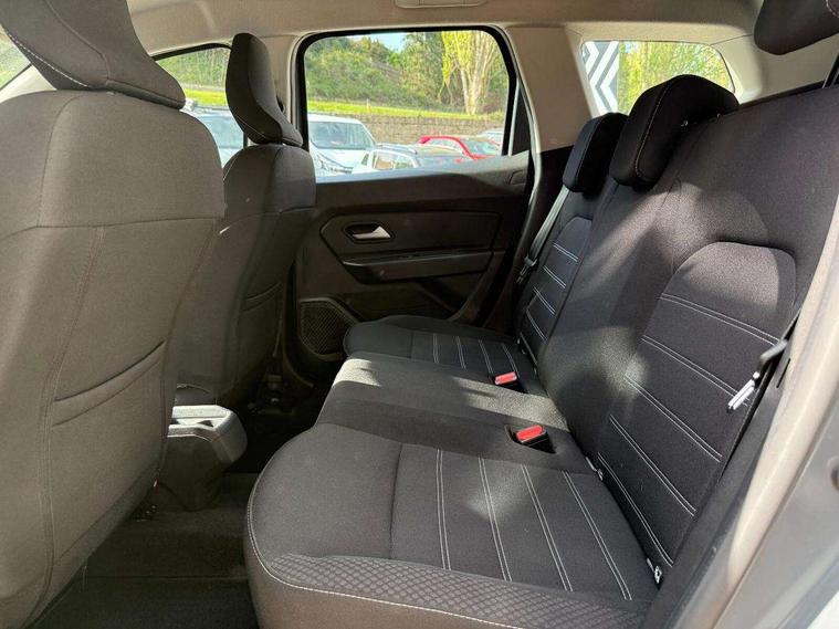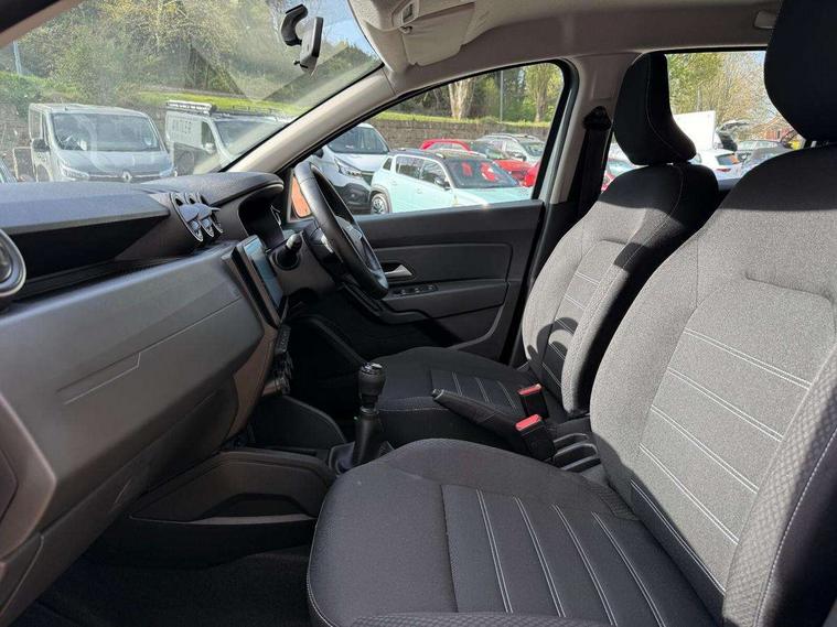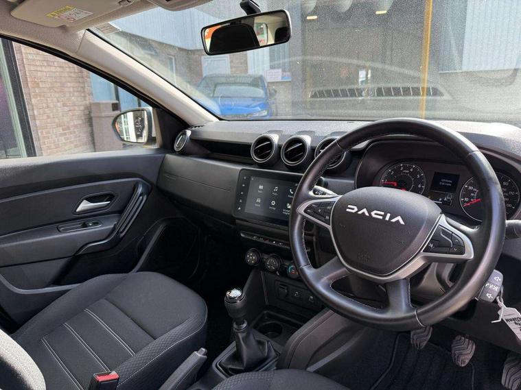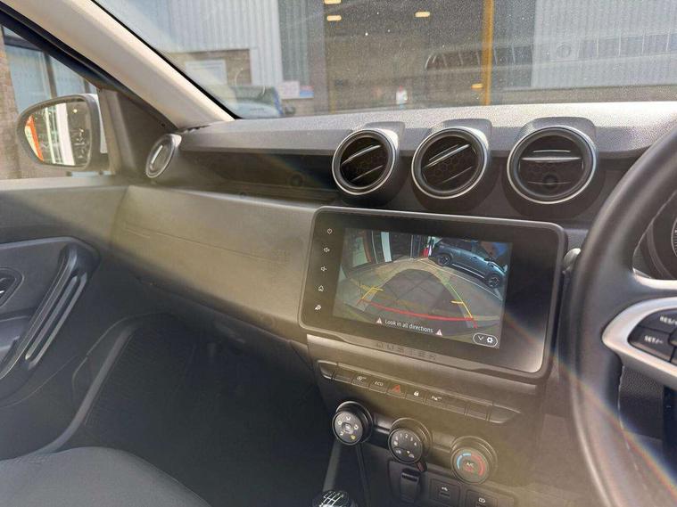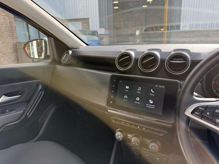 Cruise control and speed limiter, eCall emergency system, Eco mode, Electric power assisted steering, On board computer, odometer, trip computer, average fuel consumption, average speed, service indicator, outside temperature gauge, Rear parking sensors, Rev counter, Reversing camera, Stop/start system, 8" Media display with smartphone replication, 2 usb sockets and 6 speakers, Dacia plug and radio/MP3/USB/bluetooth/DAB/steering wheel control, 3 speed windscreen wipers, Black longitudinal roof bars with Duster inscription, Black side sills, Black/satin chrome tailgate trim with Duster inscription in black background and lettering, Body coloured door handles, Chrome front grille with hot stamping, Chrome logo surround on steering wheel, Daytime running lights, Drivers window one touch up/down, Dusk sensor, Electric adjustable/heated door mirrors, Electric front windows, Electric rear windows, Front and rear body coloured bumpers, Front door sill protection strip, Front fog lights, Heated rear window, High level third rear brake light, Rain sensor, Rear side wing doors, Rear spoiler, Rear wash/wipe, Satin chrome door mirrors, Tinted windows, Underbody protection skid plates, Y shaped LED headlights with rear LED lights, 3 rear height adjustable headrests, 3 seat bench in 2nd row, 60/40 split folding rear seat, Backlighted steering wheel buttons, Boot light, Driver seat lumbar adjustment, Fabric decorative insert on door panels, Fabric upholstery, Front head restraints, Front passenger reading light, Gear shift indicator, Height adjustable driver seat, Height adjustable front and rear headrests, Height and depth adjustable steering wheel, High centre console with driver armrest, Isofix points for child seats in both outer rear seats, Manual air conditioning, Map pocket on front seat backs, Passenger sunvisor with vanity mirror, Rear passenger reading light, Satin chrome interior door handles, Satin chrome lower steering wheel insert, Single front passenger seat, Soft feel leather steering wheel, 3x3 point rear seatbelts, ABS and Emergency brake assist, ASR traction control with Electronic stability control, Child locks on rear doors, Door open visual and audible warning, Driver airbag, Driver and passenger seatbelt not fastened - visual and audible warning, EBD - Electronic brakeforce distribution, Front passenger airbag, Front passenger airbag deactivation, Front seatbelt pretensioners, Front side airbags, Height adjustable front seatbelts, Hill start assist, Tyre pressure monitor, Remote central locking, Thatcham approved engine immobiliser, Charcoal grey central console surround, Matt black central console fascia, Piano black decorative insert on front door panels, Satin chrome air vent surround, Satin chrome instrument dial surrounds, 16" alloy wheels,
