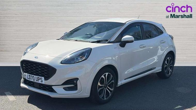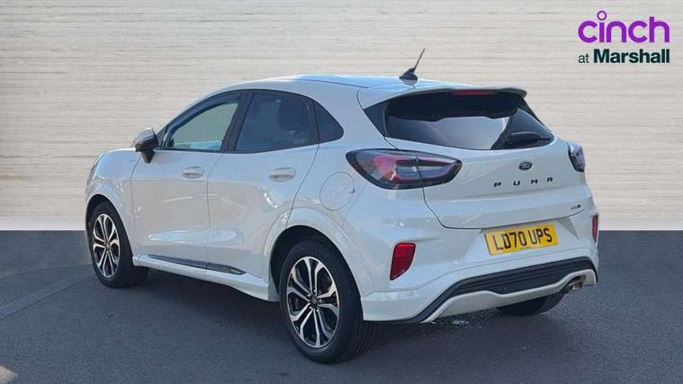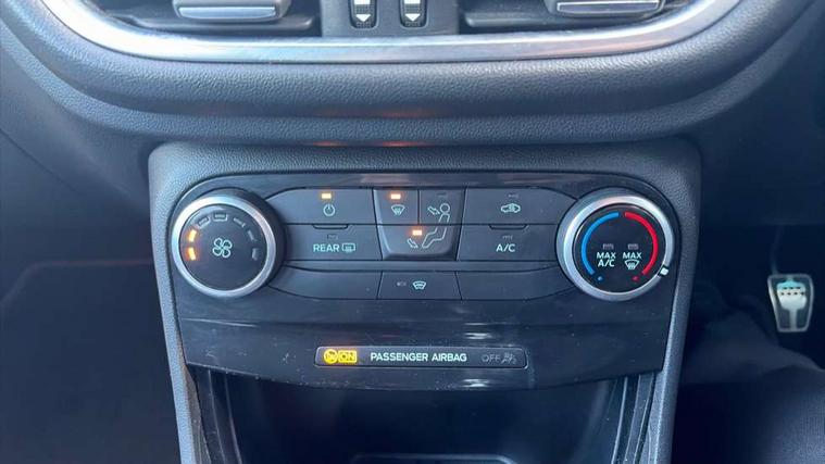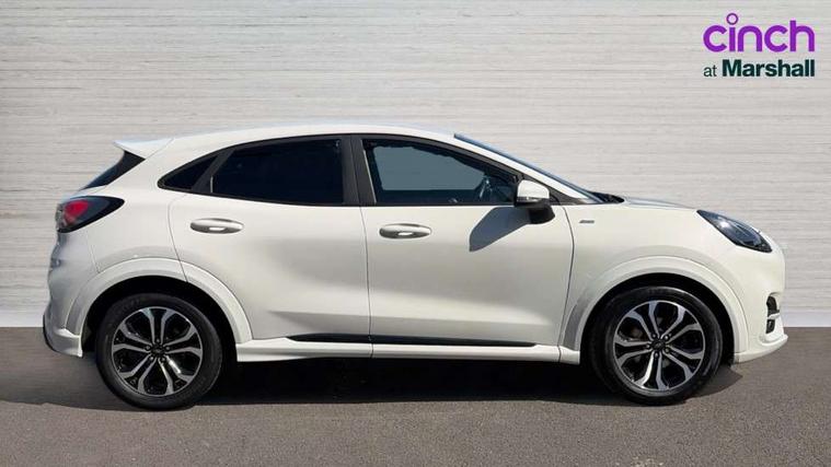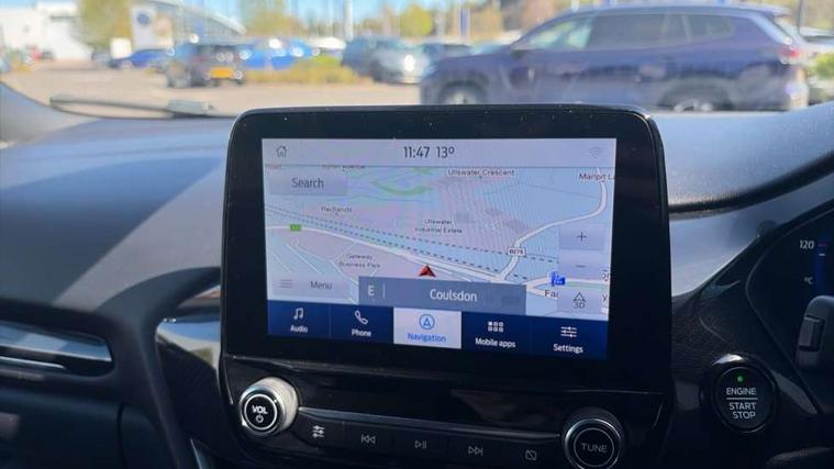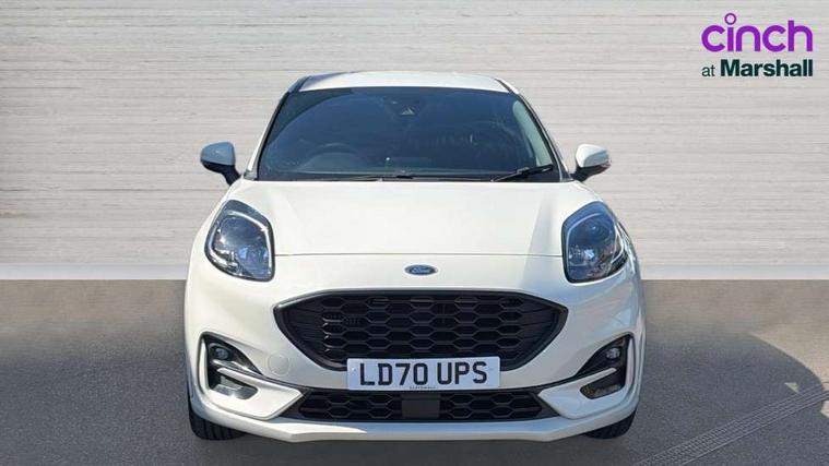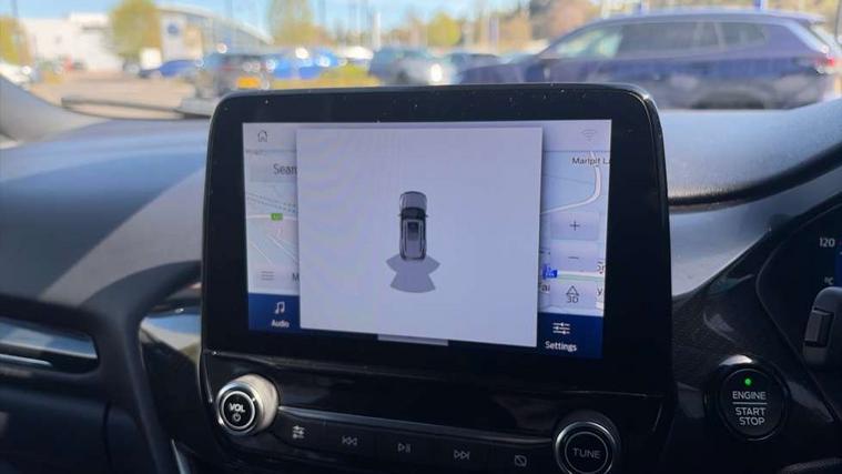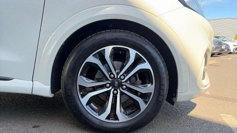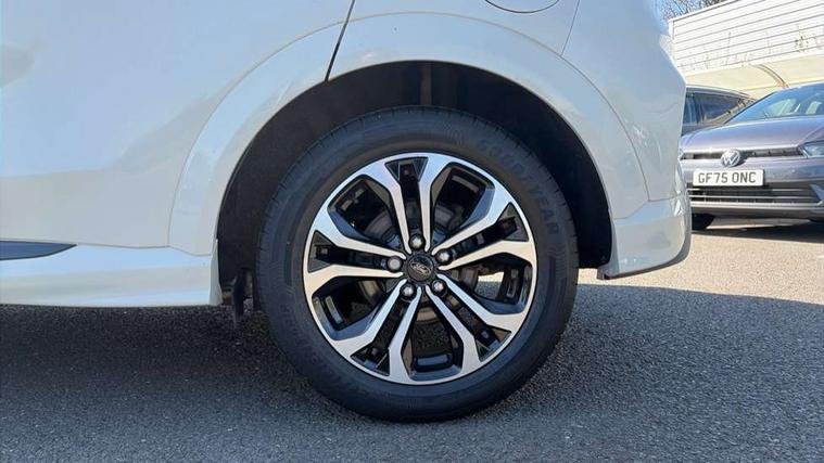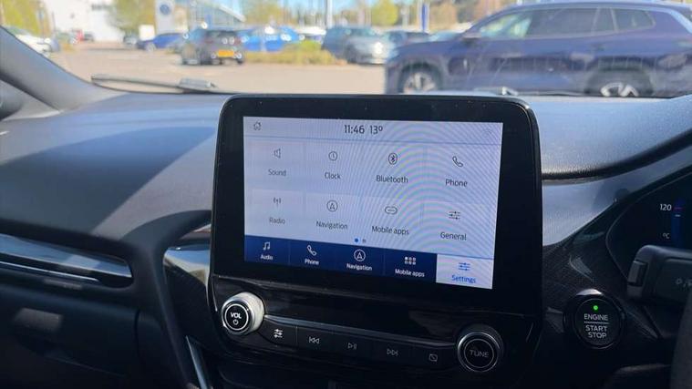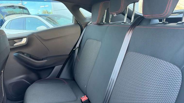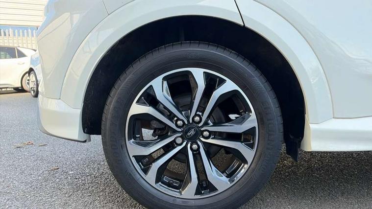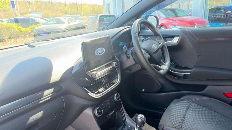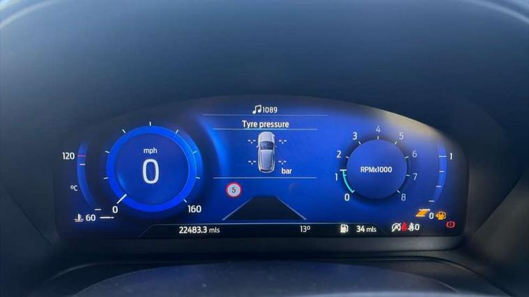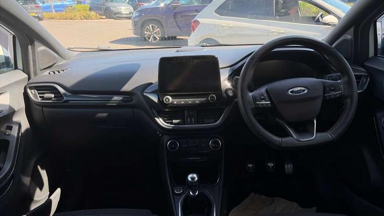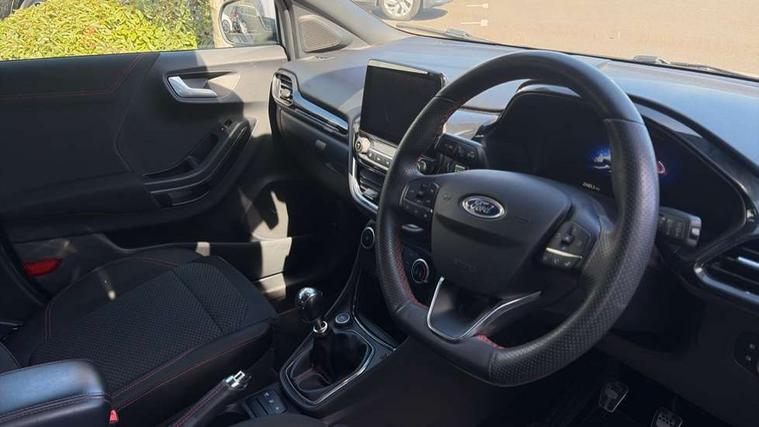 Ford easy fuel, Full digital 12.3" instrument cluster, Lane keeping aid with lane departure warning, Power assist steering, Rear parking sensor, Selectable drive modes(Normal, sport, Eco, trail, slippery), Wireless charging pad, Automatic headlights with rain sensing wipers and auto high beam, Body coloured door mirrors, Front fog lights with cornering lights and LED rear lamps, Power foldable heated door mirrors with puddle lamps, Quickclear heated windscreen, Rear wiper, ST-Line body kit with large rear spoiler wth sports suspension, Alloy sports pedals, Centre console with armrest and stowage, Court cloth upholstery with belgrano bolsters, Driver seat height/lumbar adjust, Ford megabox extended bootspace, Front and rear floor mats, Front and rear head restraints, Manual air conditioning, ST-Line flat bottomed sensico leather steering wheel with leather handbrake and aluminium gear knob, 3 rear seatbelts, Electronic stability control (ESC) and hill start assist, Pre-collision assist with autonomous emergency braking, pedestrian/cyclist detection & post-collision braking, Tyre pressure monitoring system (TPMS), Thatcham alarm, Tyre inflation kit,