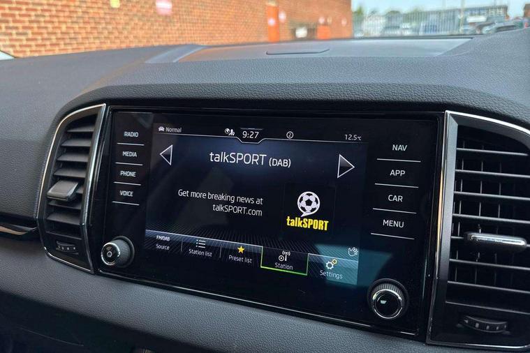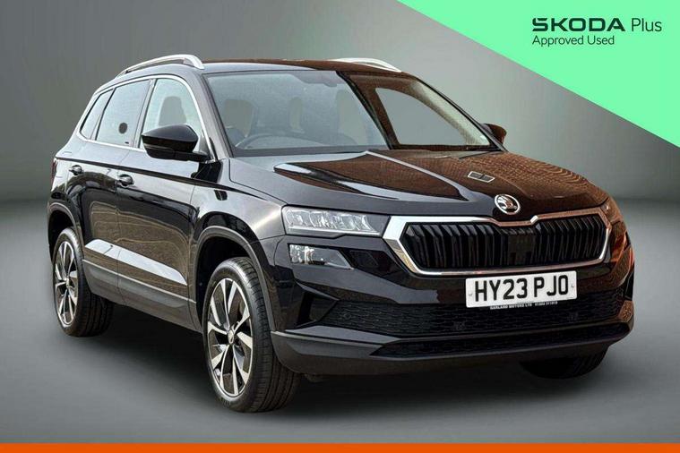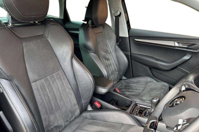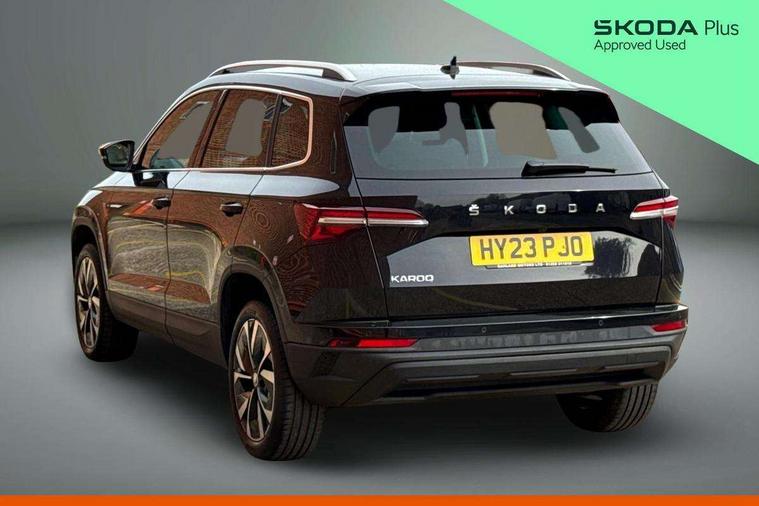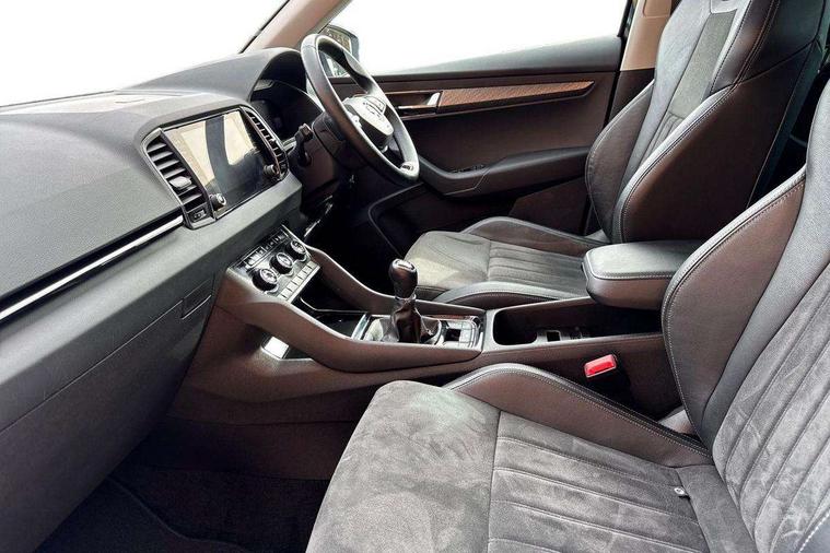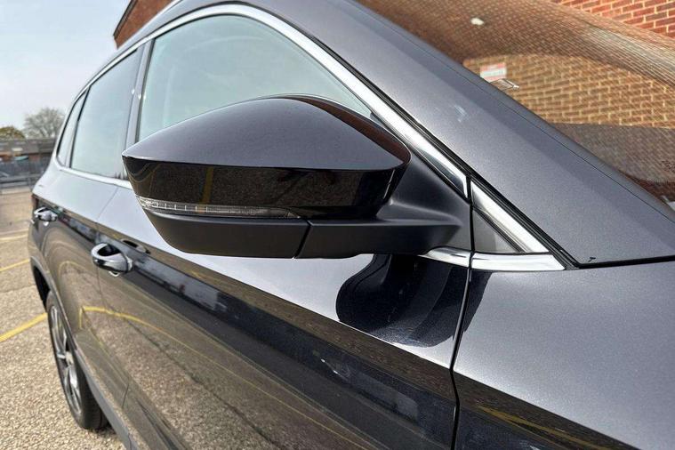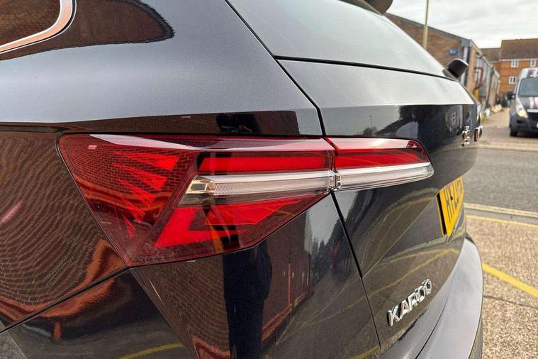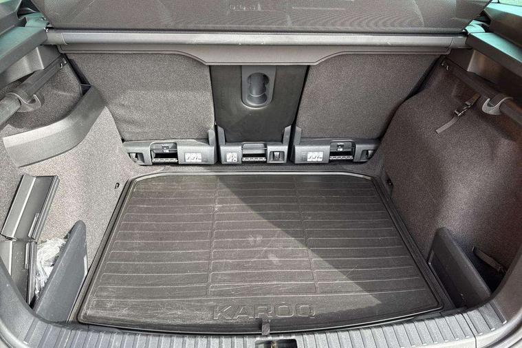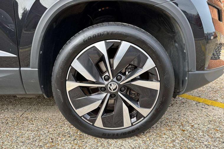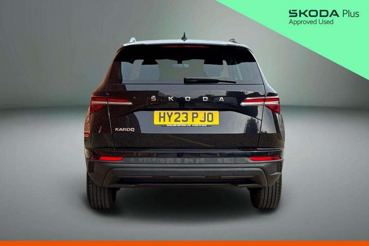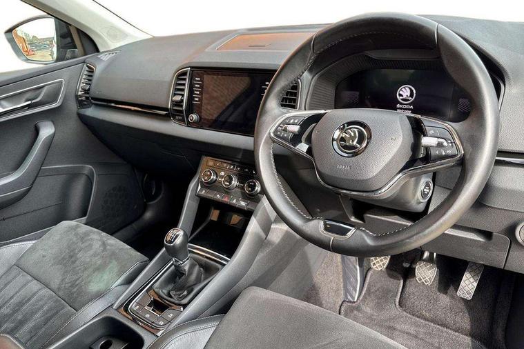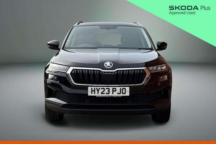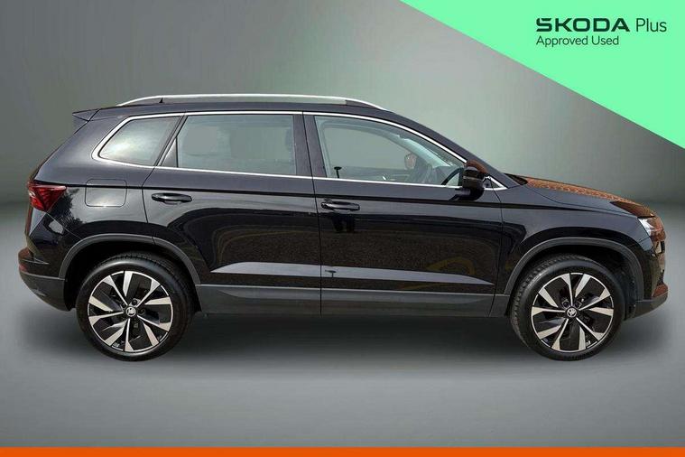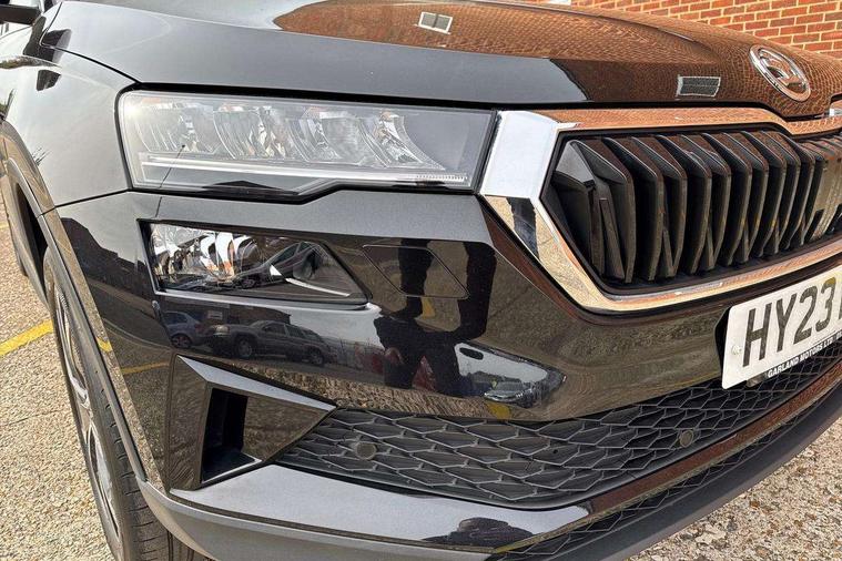 8" Digital display, Care connect, Drive mode selector, Driver fatigue sensor, Electro-mechanical PAS, Emergency services call system, Outside temperature gauge, Service interval indicator, SmartLink wireless for Apple and wired for Android, Start/stop system with regenerative braking, USB C Port x 2 in front centre console, 8 Speakers, DAB radio with Bluetooth, USB connection, Acoustic glass, Aero front windscreen wipers with intermittent function, Auto dimming rear view mirror with light and rain sensors, Black electric window control buttons, Body colour door mirrors and handles, Dynamic headlight range control with cornering light function, Electric front and rear windows with child proof lock, Heated rear windscreen, LED daytime running lights, LED rear lights with high functionality welcome effect and dynamic indicators, Light assistant (coming/leaving home/tunnel light), Plastic scuff plates, Privacy glass, Rear side wing doors, Rear spoiler, Rear window wiper with washer system and intermittent control, Safety reflectors on front doors, Third brake light, 1.5 litre bottle holders in driver and front passenger door panels, 12V socket in boot, 12v socket in front centre armrest with storage compartment and rear air vents, 2 Folding hooks and nets in boot, 2 spoke leather heated multifunction steering wheel, 2 x Tablet holder, 3 rear height adjustable headrests, 3 seat bench in 2nd row, 4 foldable roof handles with rear coat hooks, Black floor carpet, Chrome inner door handles, Decorative door sills with KAROQ badging, Double sided boot floor, Foldable hooks in the boot, Front head restraints, Height adjustable front three point seats belts with tensioners, Height/reach adjust steering wheel, Ice scraper, Illuminated glovebox, Illuminated luggage compartment, Isofix child seat preparation for front passenger seat, Isofix child seat preparation outer rear, Manual lumbar support for front seats, Pen holder, Pollen filter, Rear boot cover, Rear reading lights, Rubbish bin door, Safety vest holder, Single front passenger seat, Storage box in upper central dashboard closed, Sunvisors with illuminated vanity mirrors, Textile floor mats, Ticket holder, VarioFlex seats with standard rear seat release, Chrome roof rails + chrome pack - Karoq, Parking pack - Karoq, Automatic door unlocking in case of crash, Automatic fuel cut off in case of crash, Child locks on rear doors, Driver airbag, Electronic parking brake with auto hold function, Emergency rear braking signal, ESC including ABS, MSR, ASR, EDS, HBA, DSR, RBS, MKB and traction control, Front side airbags, Hill hold control, Knee airbags, Passenger airbag with switch-off function, Pedestrian monitor, Seatbelt reminder signalisation and pretensioner for all seats, Three point seatbelts rear, Two tone horn, Tyre pressure display, Tyre pressure monitor, Alarm with interior monitoring, back up horn and tilt sensor with safe function, Electronic engine immobiliser, Keyless entry and start/stop, Remote central locking with 2 remote folding keys, Chrome framed air vents, 18" Procyon silver alloy wheels with anthracite aero inserts, Anti-theft wheel bolts protection, Storage on wheel cover, Tool kit,