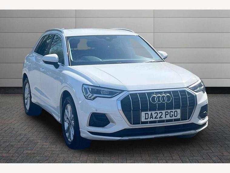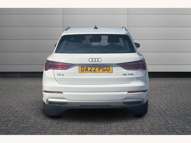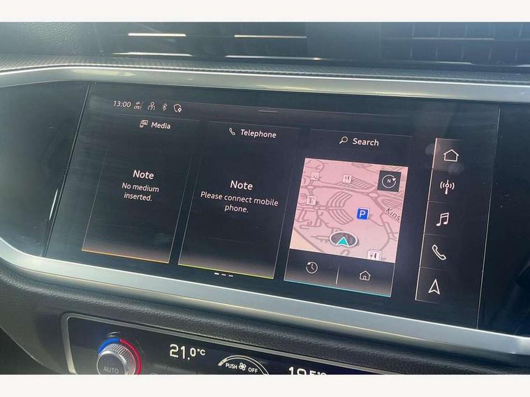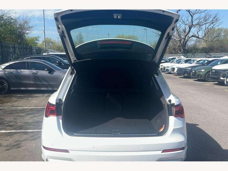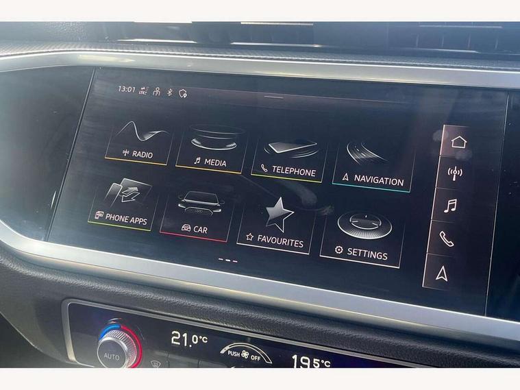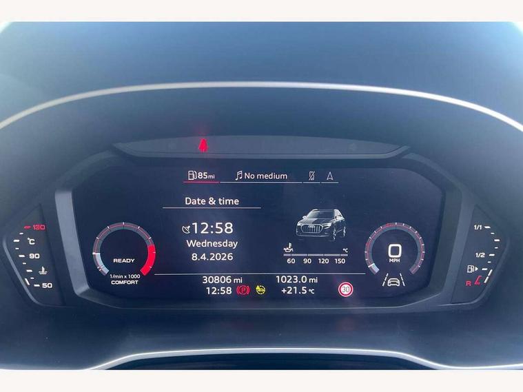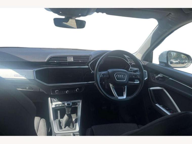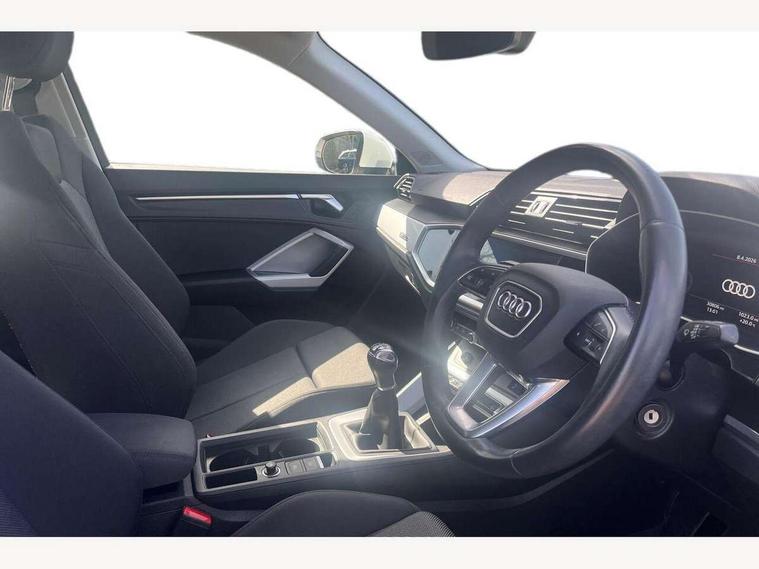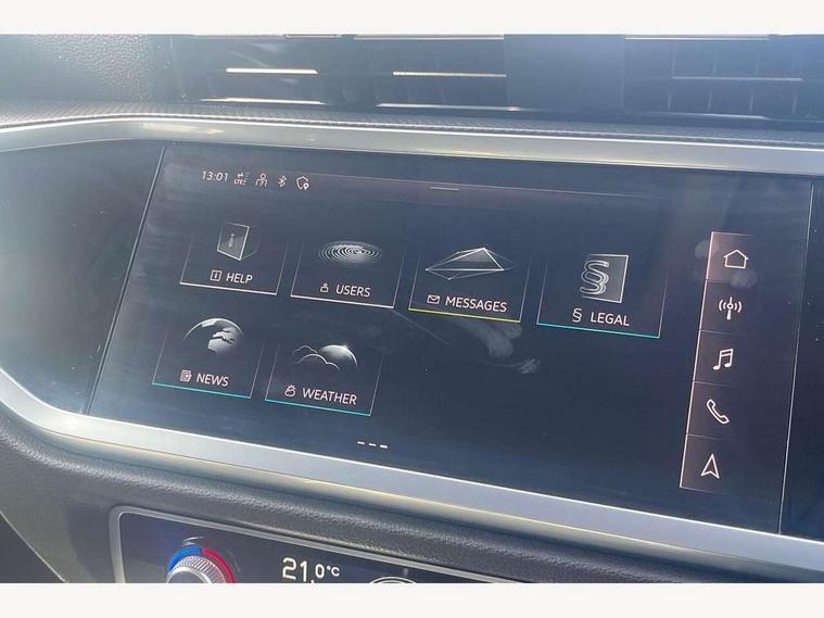 Amazon alexa Integration, Audi drive select, Audi lane departure warning, Audi Virtual Cockpit - 10.25" display, Bluetooth interface, Camera based traffic sign recognition, Cruise control + speed limiter, Legal emergency call, MMI Navigation Plus with high resolution 10.1 inch touchscreen colour display, Power operated tailgate, Progressive steering, Rear parking sensors, Service interval indicator, Smartphone interface includes wireless Apple carplay/Android Auto, Start stop system with recuperation, Voice control system with natural language interaction, Standard suspension, 2 USB-C ports with charge and data functions, 6 passive loudspeakers, DAB digital radio module, Acoustic windscreen, Aluminium roof rails, Aluminium window trim, Auto dimming frameless rear view mirror, Body coloured bumpers, Electrically folding, adjustable and heated door mirrors with integrated LED side indicators and kerb view function for passenger side, Front and rear electric windows, Front fog lights, Front side air inlets in matt selenite silver, Front spoiler in matt selenite silver, Grille vertical bars in aluminium silver/Matt, High gloss black finish B and C pillars, LED headlights with LED daytime running lights, LED rear lights, LED third brake light, Rain and light sensors, Rear diffuser strip in matt selenite silver, Rear side wing doors, Rear wiper, Titanium black radiator grille, Variable front intermittent wipers, 12V socket in rear centre console, 3 seat bench in 2nd row, 3 spoke multi-function leather steering wheel, 40:20:40 folding with manual adjustment for 60:40 forwards/backwards position and backrest angle, Door sill trims with aluminium inlay, Dual zone electronic climate control, Front and rear floor mats, Front and rear headrests, Front and rear roof module including reading lights, Front centre armrest, Glove compartment lighting, Height and reach adjustable steering wheel, ISOFIX child seat mounting for front passenger with airbag deactivation and outer rear seat including top tether attachment point for outer rear seats, Luggage compartment light, Lunar silver cloth headlining, Manual front seats with height adjustment, Single front passenger seat, Stainless steel luggage compartment sill finisher, Non smoking pack - Q3, 3x3 point rear seatbelts, 6 airbags - Driver, front passenger, curtain and side windows, Audi pre-sense front with pedestrain and cyclist recognition, Electromechanical parking brake, Electronic stabilisation control including ABS, ASR and EDL, Front seatbelt reminder, Hill descent control, Hill hold assist, Manual child lock in rear doors, Pre sense basic, Seatbelt monitoring, Tyre pressure warning, Warning triangle and first aid kit, Anti theft alarm, Anti theft wheel bolts, Immobiliser, Remote central locking, Detail dashboard around MMI touch colour display in glass look, black with surround in aluminium look, Micrometallic silver inlay,
