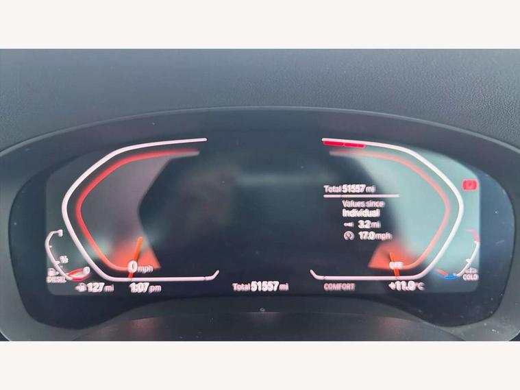 20GB hard disc drive (HDD) memory, Active Guard incl speed limiting and lane departure functions with auto steering, and front collision warning with brake intervention, Average speed gauge, BMW Live Cockpit Professional sat nav system including 10.25" high resolution display and Intelligent Voice Assistant, BMW Online services, BMW remote services, BMW Teleservices, Brake force display, Control display - 10.25" colour touch sensitive display screen, Fuel consumption and range, iDrive touch controller with shortcut buttons, Journey computer, Multifunctional instrument panel, Navigation System Professional Multimedia, Oil sensor for level and grade, On board computer, On-board diagnosis - OBD, Outside temperature display, Personal Profile, Real time traffic information, Service interval indicator, Speed limiting function, Voice control system, Anti roll bar front and rear, Automatic transmission with gearshift paddles, Diesel particulate filter, Drive performance control with ECO PRO comfort + sport mode, Variable vane geometry, Auxiliary input socket, Bluetooth audio streaming, BMW professional radio/CD/MP3, DAB Digital radio, Favourite buttons, Acoustic glazing, Active air stream kidney grille, All round anti-corrosion system, Auto dimming rear view mirror, Body colour door handles, Body coloured bumpers, Body coloured door mirrors, Body coloured side sills, Door handle illumination, Dynamic brake lights with LED technology, Electric front and rear windows with fingertip open/close + anti-trap facility and comfort closing function, Electrically adjustable and heated exterior mirrors includes integrated direction indicators, Follow me home headlights, Heated windscreen washer jets, Interior rear view electrochromatic mirror with automatic anti dazzle function, LED daytime running lights, Left and right single chrome exhaust tailpipes, Rain sensor with automatic headlight activation, 12V power socket in front and rear, 12V power socket in rear, Ambient interior lighting with 6 selectable light designs, Battery in luggage with jump start facility, Door sill finishers with BMW designation, Front and rear armrests integrated in door trim + centre console includes storage compartment and rear centre armrest includes 2 cupholders, Front and rear cupholders x 2, Front and rear footwell lights, Height and length adjustable steering column and activation via lateral lever on the steering column, Lockable glove compartment with light, Multi-function controls for steering wheel, Rear headrests, Three spoke sport leather steering wheel, Velour floor mats, 3x3 point rear seatbelts, Anti-lock braking system (ABS), Automatic Stability Control (ASC), BMW emergency call, Brake assist function, Brake energy regeneration, Child seat ISOFIX attachment rear outer seats, Cornering brake control (CBC), Crash Sensor - activation of central locking release, hazard warning light and interior lighting, Deformation zones front and rear with door reinforcements and bumpers that regenerate, Driver/front passenger, rear and side airbags, Driver/Passenger airbags (Impact dependent), DSC - Dynamic Stability Control, Dynamic brake control, Dynamic Traction Control - DTC, Electromechanical parking brake with automatic drive away release and auto hold function, Electronic brake force distribution, Engine drag torque control, Front head restraints with anti-whiplash, Front passenger airbag deactivation, Head airbags for first and second row seats, Hill start assist, Seat belts front inertia reel with pyrotechnical belt latch tensioner, belt force limiter and belt restrainer, Side impact protection, Three inertia reel rear seatbelts, Two tone horn, Tyre pressure monitoring system, Warning triangle and first aid kit, Alarm system with remote control and engine immobiliser, Locking wheel bolts, Remote central locking,