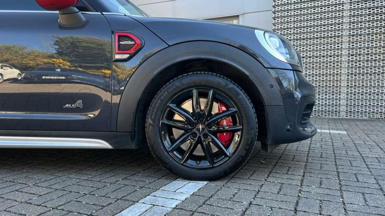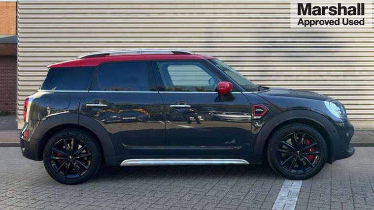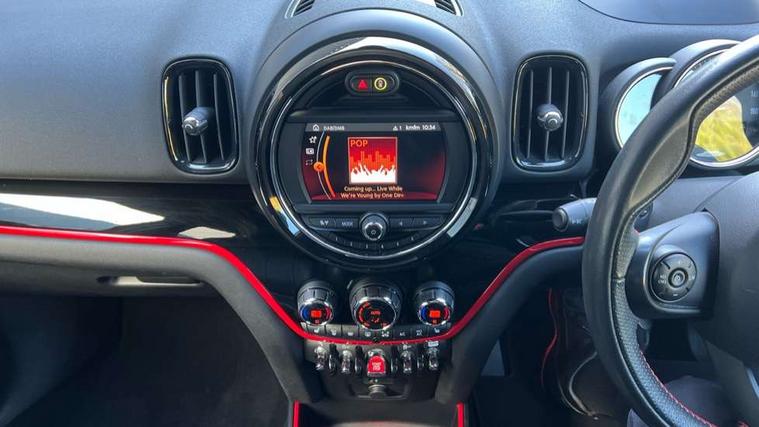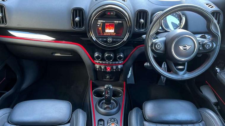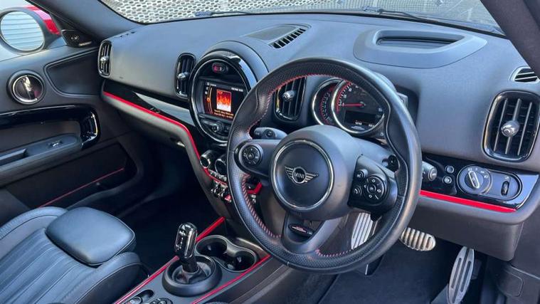 Active Guard incl speed limiting and lane departure functions with auto steering, and front collision warning with brake intervention, Automatic start/stop function with brake energy recuperation, Compatible mobile phone bluetooth with audio streaming, Electro-mechanical speed dependant steering assistance, Instrument cluster, MINI Driving Modes - centre toggle switch to control driving setting (sport, mid and green), Mini E-call, MINI TeleServices, On board computer, Double Vanos system, Fully variable valve control, High precision injection, Performance Control, Sport automatic transmission with steering wheel paddles, FM tuner and DAB digital radio, Body colour fuel filler cap, Day time driving lights, Door sill strips, Dynamic brake lights, Electric windows, Heated rear window, Heated windscreen washer jets, John Cooper Works - aerodynamic kit (front and rear apron, spoiler), front and rear sport bumpers and part-painted side sills with door sill finishers, John Cooper Works Logo, John Cooper Works rear spoiler, LED headlights with cornering lights and LED fog lights, Left exhaust tailpipe with chrome finisher, Model logo, Model logo on Tailgate, Piano black border honeycomb radiator grille in matt black with John Cooper Works logo strut in chilli red, Piano black exterior, Rain sensor with auto headlights, Rear fog lights, Rear window wiper, Side scuttle with MINI John Cooper Works logo in black high-gloss with red border, Split rear doors, Sun/heat protection glass, White indicator lenses, 12V Accessory socket in centre console, 360L luggage compartment capacity, 4 lashing eyes in luggage compartment, 40:20:40 split folding rear seats, Anthracite headlining with grab handles and clothes hooks, Chrome interior highlights, Cupholders, English handbook, Front headrests, Glove compartment, Height and length steering column adjustment, Interior lighting with 12 basic colours selectable via toggle switch in roof, Isofix rear child seat preparation, John Cooper Works perforated leather steering wheel with contrast stitching in chilli red and John Cooper Works logo, Leather gearshift lever and handbrake gaiters, LED reading lights, vanity mirror lights, front foot well light and spotlight on front seats, Mechanical seat adjustment, driver seat height adjust, forward/back and front seats backrest, Multifunction steering wheel, Rear headrests, Rubberised stainless steel pedals, Storage compartments in doors, Sunvisors with vanity mirrors, Tool kit, Comfort plus pack - Countryman, Excitement pack - Countryman, Navigation pack - Countryman, 17" front sport brake with 4 piston fixed calliper, 2 tone horn, 3 point seatbelts on all seats, 6 Airbags - front, side, head and seat belt tensioners, Anti-lock braking system (ABS), DSC - Dynamic Stability Control, Electronic handbrake, Front and rear disc brakes, Hill start assist, Red brake callipers with John Cooper Works logo, Torsen mechanical limited slip differential, Tyre pressure monitoring system, Alarm system with tilt sensor, monitoring doors, bonnet interior and tailgate, Auto drive away locking, Comfort access system, Deadlocking function, Electronic vehicle immobiliser, Locking wheel bolts, Start/stop toggle with keyless go,
