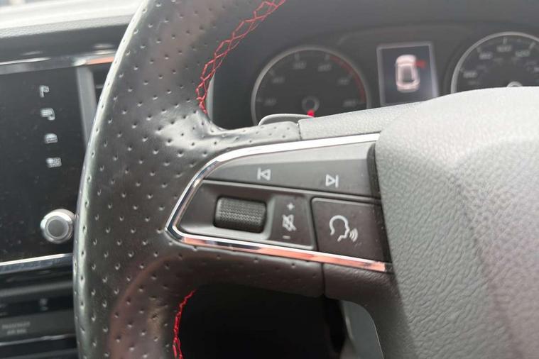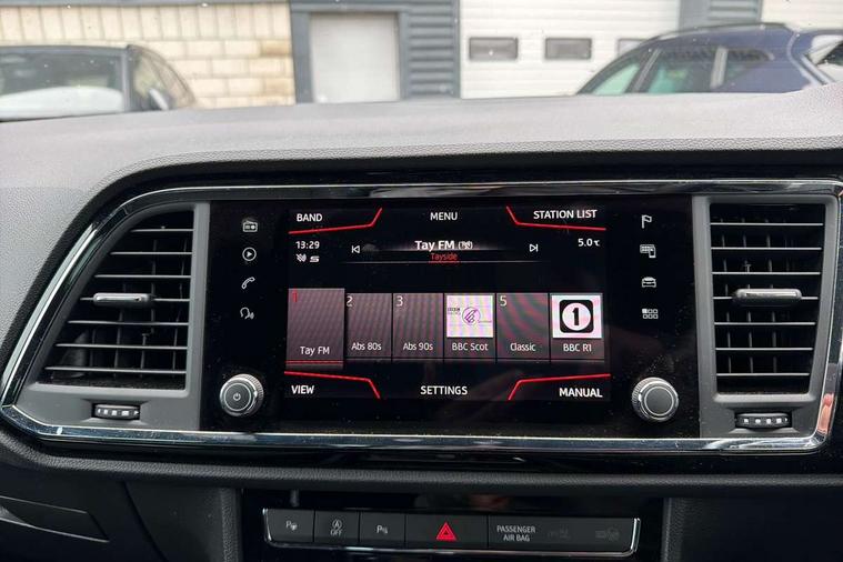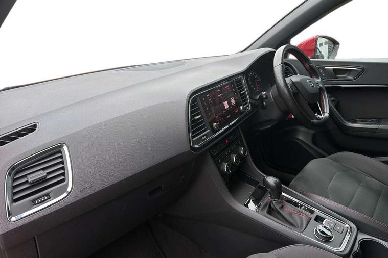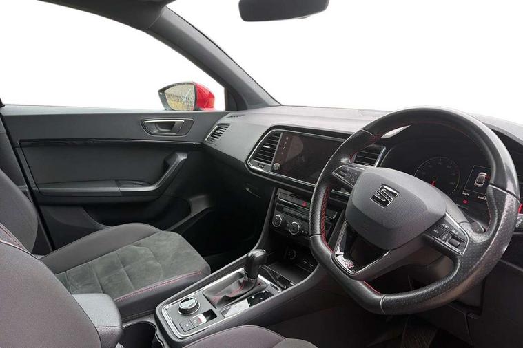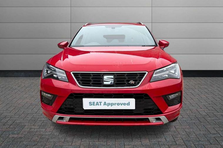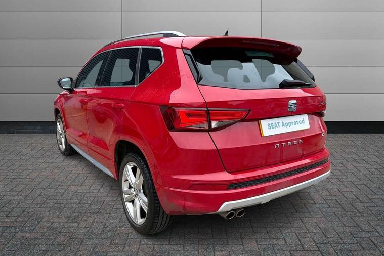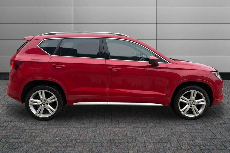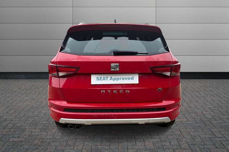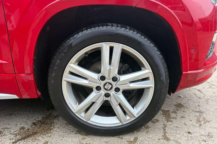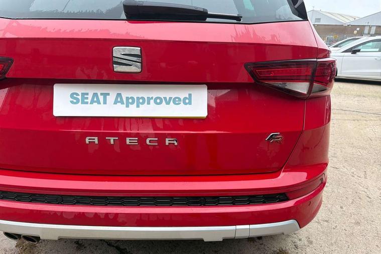 'Lights On' Reminder warning buzzer, 3.5" driver's display, Cruise control, Digital clock, Driver alert system, Front assist city emergency braking and pedestrian protection, Full Link Smartphone Integration with Mirror Link, Apple Car Play, Google Android Auto, Low fuel warning light, Multi function display, Outside temperature gauge, Power assist steering, Remote fuel flap release, RPM counter, Satellite navigation system, SEAT drive profile with driving experience button, SEAT logo boot release, Self parking functionality (includes front and rear parking sensors), Trip computer, Comfort suspension, XDS electronic differential lock, SEAT USB media cable, Steering wheel mounted audio/phone controls, Aluminium front door sills, Armrest with air outlet in rear, Auto dimming rear view mirror, Auto headlights with automatic coming and leaving home function, Body colour bumpers, Body colour door handles, Body colour door mirrors, Body coloured wheel arches, Chrome front grille frame, Chrome roof rails, Chrome side window trim, Dark tinted rear windows, Door mirrors with welcome light silhouette, Electric adjustable/heated/folding door mirrors, Frameless interior mirror, Front and rear electric windows, Front grille in glossy black, Full LED headlights, Illuminated aluminium front door sill with trim logo, LED daytime running lights, LED front fog lights, Rear fog lights, Rear LED tail lights, Rear spoiler, Rear wash/wipe, Twin chromed exhaust pipes, Visible dual exhaust pipes, 12v socket in front, 4 Lashing eyes in boot, 60/40 split folding rear seat, Adjustable front armrest with storage compartment, Aluminium pedals, Ambient spot lighting and front footwell illumination, Black roof lining, Driver and passenger seats, height-adjustable, with lumbar adjustment and height-adjustable headrests, Driver and passenger sun visor, covered and illuminated mirror, driver sun visor with card holder, Dual zone climate control, Front and rear head restraints, Front courtesy lights, Front cupholders, Front reading lights, Front seat back storage pockets, Gear shift indicator, Illuminated boot, Illuminated glovebox, Instrument lighting with brightness control, ISOFIX points in outer rear seats with top tether anchorage points, Leather steering wheel and gear knob, Microsuede upholstery with front sports seats, Multicoloured ambient lighting with LED interior illumination, Rear armrest and easy back seat release mechanism from boot, Rear reading lights, Steering wheel gearshift paddles, Storage box under drivers seat, Convenience pack - Ateca, Navigation system pack - Ateca, 3x3 point rear seatbelts, ABS, Automatic post collision braking, Driver/Front Passenger airbags, Drivers knee airbag, Electronic parking brake with auto hold, Electronic stability control, ESP+EBA, Front and rear seatbelt reminder, Front passenger airbag deactivation, Front side airbags, Hill hold control, Tiredness recognition system, Traction control, Twin curtain airbags, Tyre pressure monitoring system, 2 folding remote keys with window open/close function, Immobiliser, Locking wheel bolts, Remote central locking, Volumetric alarm with back up horn, Chrome interior detailing, 18" Performance alloy wheels,
