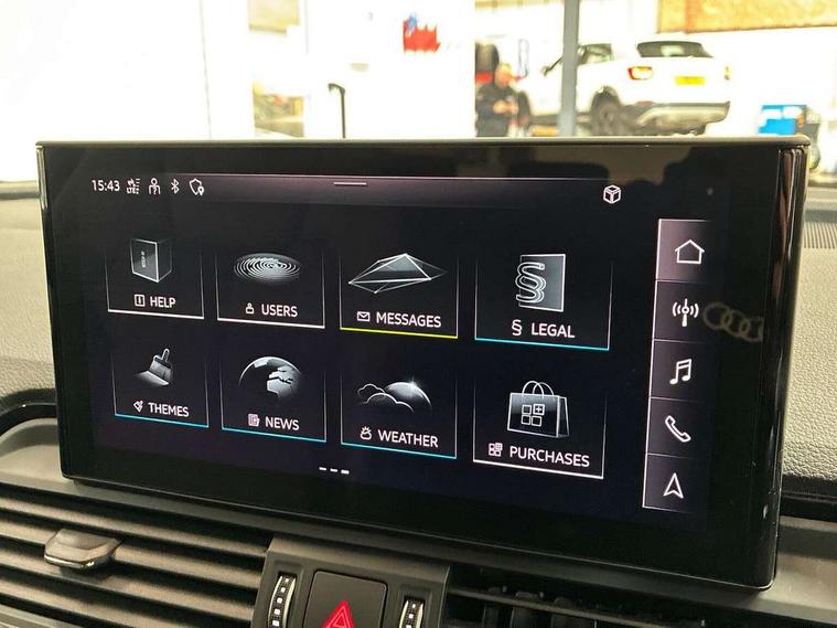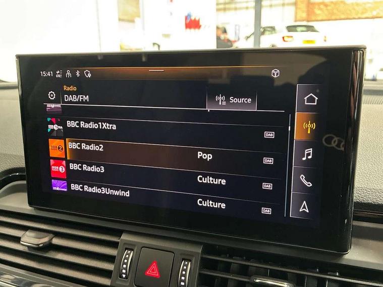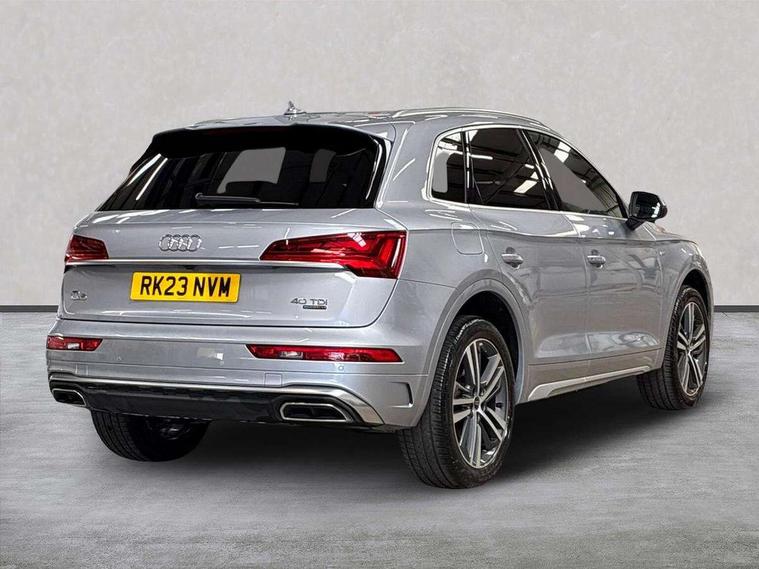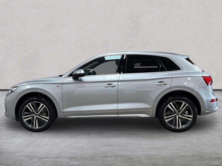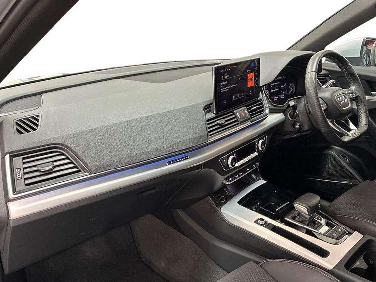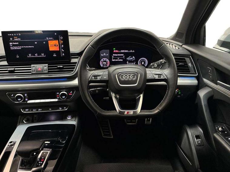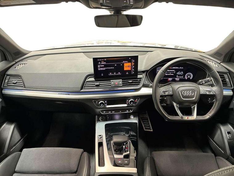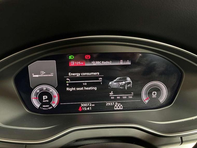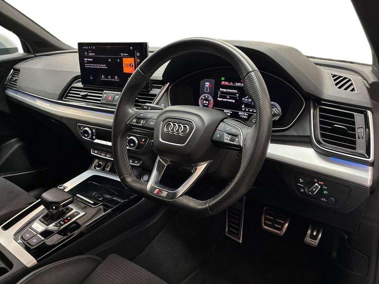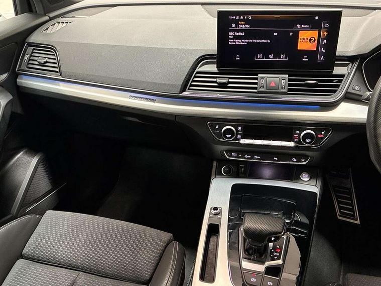 Aluminium rhombus inlay, Extended LED Interior multi coloured Lighting Pack - Q5, High gloss pack - Q5, Anti theft alarm, Anti-theft wheel bolts, Keyless Go access/ignition system, Bang + Olufsen sound system, DAB Digital radio, 3 point seatbelts on all seats, 6 airbags - Driver, front passenger, curtain and side airbags, Electrically operated child locks on rear doors, Electromechanical parking brake, Electronic stabilisation control including ABS, ASR and EDL, Front passenger airbag deactivation, Hill descent control, Hill hold assist, Multi collision brake assist, Pop-up bonnet for pedestrian protection, Pre sense city, Seat belt force limiter, Seatbelt monitoring, Tyre pressure warning, Warning triangle and first aid kit, Acoustic windscreen, Air inlets in matt titanium black with blades in matt aluminium silver, Aluminium roof rails, Auto dimming rear view mirror, Automatic headlight adjustment, Automatic headlights and windscreen wipers, Body colour bumpers, Body colour door mirrors, Chrome plated exhaust trims, Electric adjustable/heated/folding door mirrors, Front and rear electric windows, LED headlights and LED tail lights, Matt selenite silver underbody protection, Matt twilight grey radiator grille with chrome vertical struts, Rear chrome trim strip below lights, Rear diffuser strip in selenite silver, Rear spoiler, Rear wiper, Roof bars, Side skirts in matt selenite silver, 2 x USB charging port with aux input socket, 3 rear headrests, 3 spoke high multi-function leather steering wheel with shift paddles, 40:20:40 split folding rear seat with rear centre armrest, Deluxe 3 zone electronic climate control, Door sills trims with aluminium inlays, Front centre armrest, Front/rear floor mats, Heated front seats, Height adjustable front head restraints, Height/reach adjustable steering column, ISOFIX child seat mounting and top tether, Manual seat adjustment with 4-way electric lumbar support, Removable luggage compartment floor, Silver cloth headlining, Sunvisors with vanity mirrors, Tool kit, Trunk roller cover, Twin leather upholstery + front sports seats, Advanced key with electric hands free boot opening system, Amazon alexa Integration, Audi connect safety and service (e-call), Audi drive select, Audi virtual cockpit plus with 12.3" screen and three different layout designs, Audi wireless smartphone interface, Automatic start-stop system with coasting functionality and efficiency programme, Cruise control + speed limiter, Electro - mechanical power assisted steering, MMI navigation plus with 10.1" touch screen, Mobile telephone preparation - bluetooth interface, Power tailgate, Service interval indicator, Voice control system with Audi hotword activation "Hey Audi", Diesel particulate filter, Dynamic suspension, Quattro on demand,