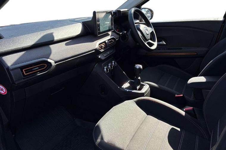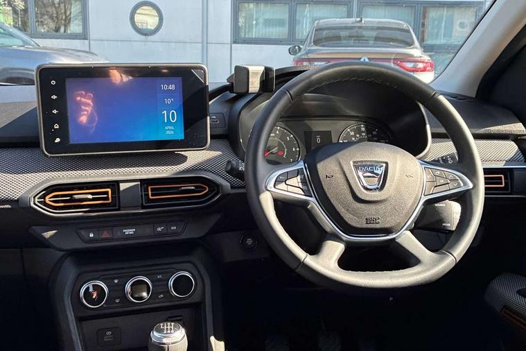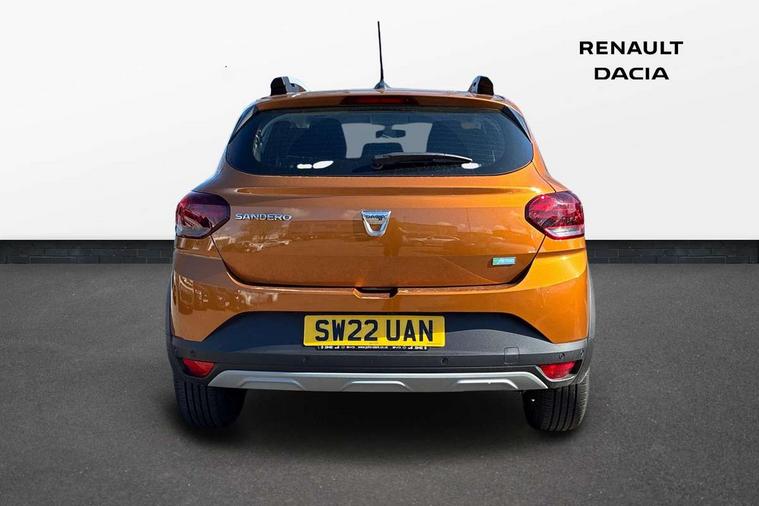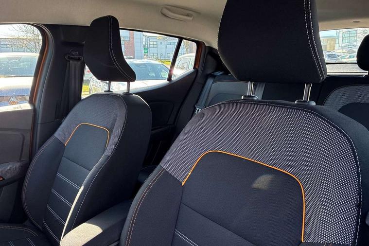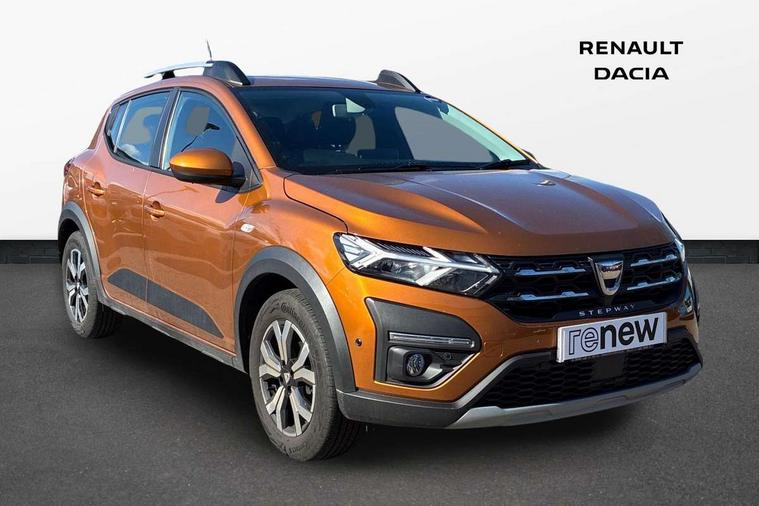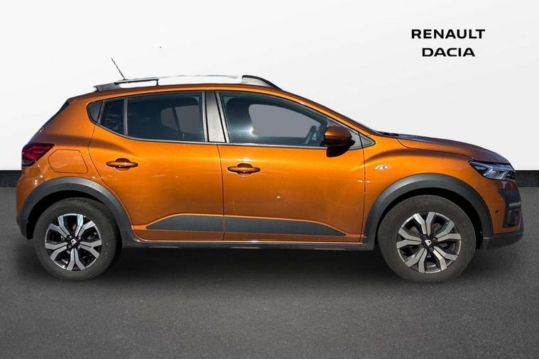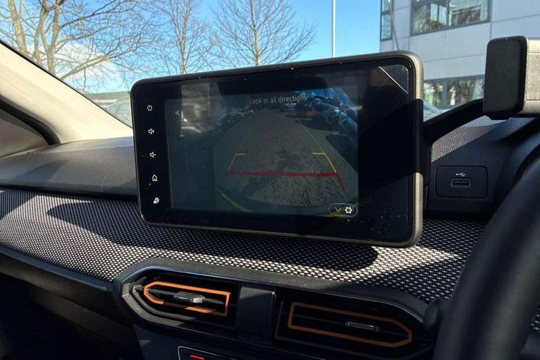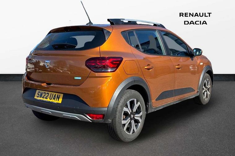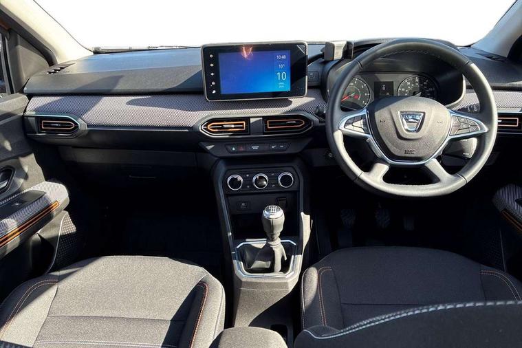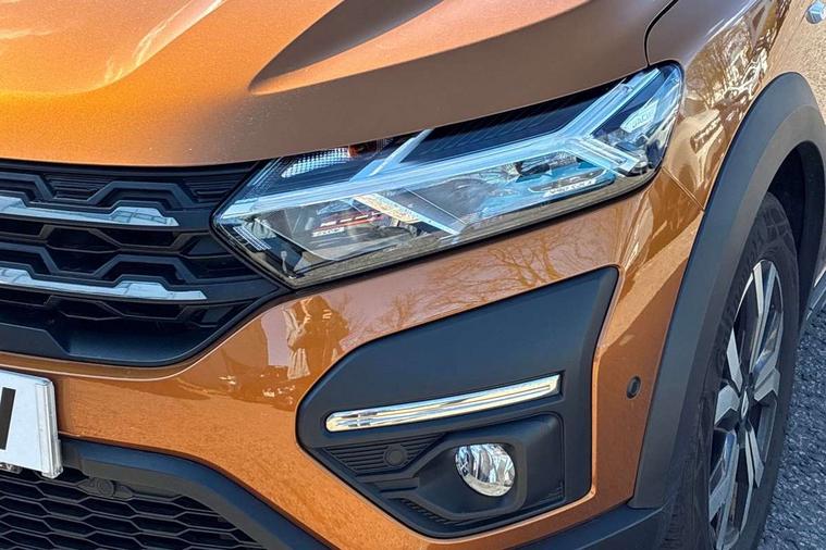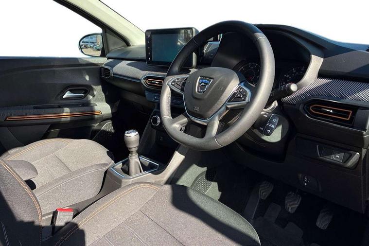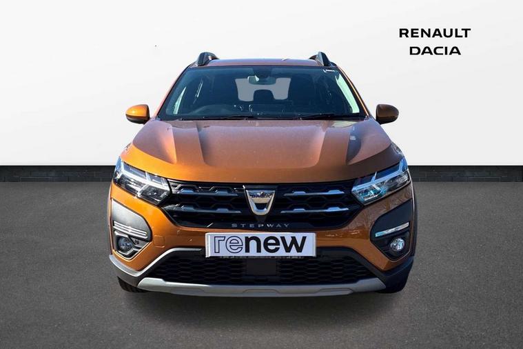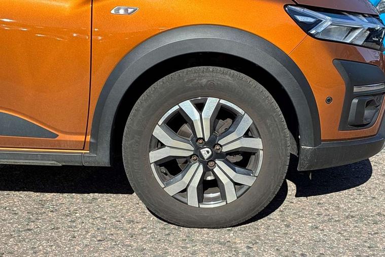 3.5" TFT instrument panel with on-board computer, Blind spot warning, Cruise control with speed limiter, eCall emergency call system, Eco mode, Electric power assisted steering, Front parking sensors, Rear parking sensors, Rev counter, Reversing camera, Stop/start system, 8" MediaNav - DAB Radio, Wifi smartphone replication, Bluetooth, 6 speakres, Apple CarPlay and Android Auto, USB connection for data transfer and charging, USB socket, 3 speed windscreen wipers, Auto lighting, Automatic wipers, Body colour door handles, Body colour door mirrors, Body coloured bumpers, Chrome longitudinal roof bars, Chrome radiator grille, Electrically adjustable and heated door mirrors, Front fog lights, Heated rear window, High level third brake light, LED automatic daytime running lights, LED Y-shape Dacia signature lighting, Modular roof bars, One touch electric front windows, Rear electric windows, Rear side wing doors, Rear wash/wipe, Stepway inscription on radiator grille and roof bars, Tinted windows, 1/3 to 2/3 split folding rear seats, 12 volt front socket, 12 volt rear socket, 3 height adjustable rear headrests, 3 seat rear bench, Automatic air conditioning, Driver + passenger vanity mirrors, Fabric upholstery, Fixed smartphone holder on dashboard, Gear shift indicator, Height adjustable driver seat, Height adjustable front headrests, Height/depth adjustable steering wheel, High central armrest with console storage, Isofix points for child seats in both outer rear seats, Satin chrome interior door handles, Satin Chrome/Copper orange air vents, Single front passenger seat, Soft feel steering wheel, Steering wheel controls, 3x3 point rear seatbelts, ABS and Emergency brake assist, Automatic emergency braking system, Child locks on rear doors, Door open warning, Driver airbag, Electronic parking brake, ESC (Electronic Stability Control), ESP + Hill Start Assist, Front curtain airbags, Front seatbelt pretensioners, Front side airbags, Height adjustable front seatbelts, Passenger airbag, Seatbelt reminder for driver and front passenger, Tyre pressure monitor, Automatic central locking, Immobiliser, Keyless entry, Remote central locking, Decopart on instrument panel and door with textile, 16" Diamond-effect alloy wheels, Tyre inflation kit,