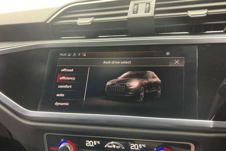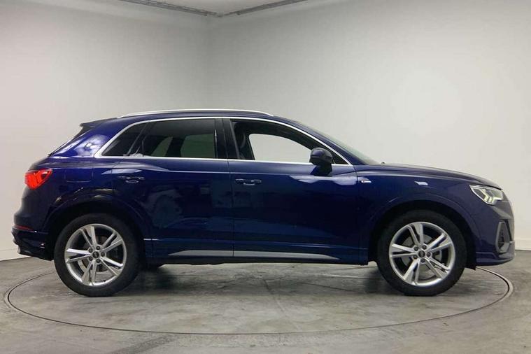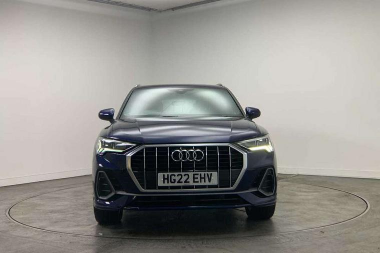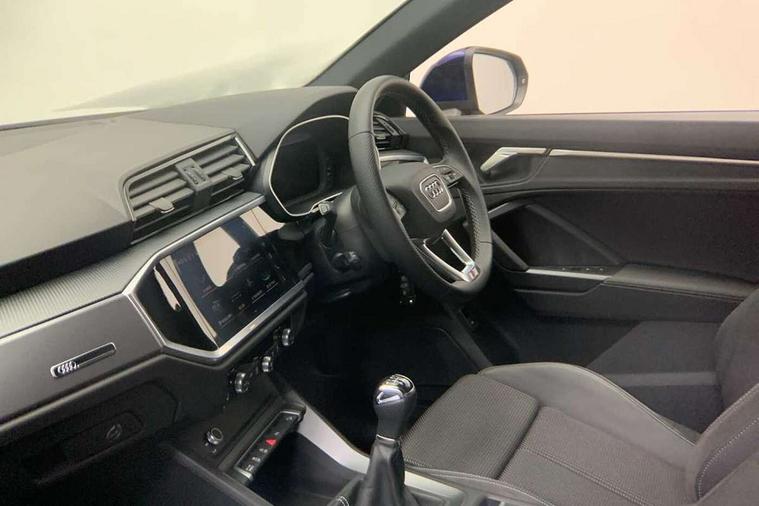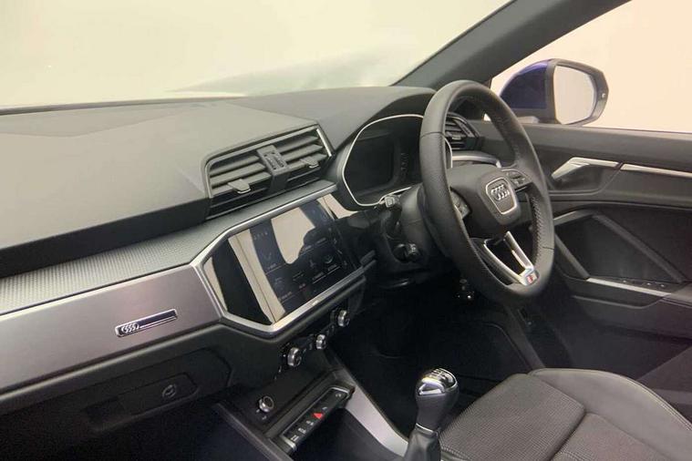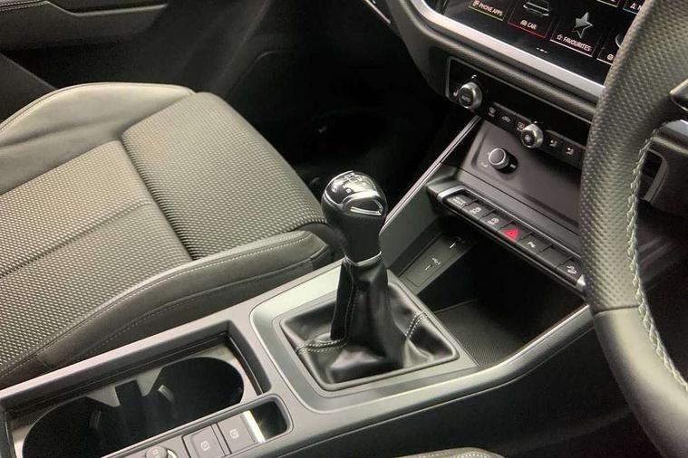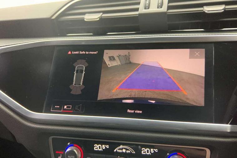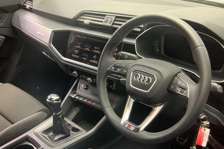 Amazon alexa Integration, Audi drive select, Audi lane departure warning, Audi Virtual Cockpit - 10.25" display, Bluetooth interface, Camera based traffic sign recognition, Cruise control + speed limiter, Legal emergency call, MMI Navigation Plus with high resolution 10.1 inch touchscreen colour display, Power operated tailgate, Progressive steering, Rear parking sensors, Service interval indicator, Smartphone interface includes wireless Apple carplay/Android Auto, Start stop system with recuperation, Voice control system with natural language interaction, Sports suspension, 2 USB-C ports with charge and data functions, 6 passive loudspeakers, DAB digital radio module, Acoustic windscreen, Aluminium roof rails, Aluminium window trim, Auto dimming frameless rear view mirror, Body coloured bumpers, Electrically folding, adjustable and heated door mirrors with integrated LED side indicators and kerb view function for passenger side, Front and rear electric windows, Front fog lights, Front side air inlets in matt platinum grey, Front spoiler blade in matt platinum grey, Grille vertical bars in aluminium silver/Matt, High gloss black finish B and C pillars, LED headlights with LED daytime running lights, LED rear lights, LED third brake light, Privacy glass dark tinted rear and rear-side windows (from B-pillar backwards), Rain and light sensors, Rear diffuser grille in grained matt black, Rear diffuser strip in matt titanium black, Rear side wing doors, Rear wiper, S line badges on front wings, S Line front and rear bumpers, Side skirt insert in matt Platinium grey, Titanium black radiator grille, Variable front intermittent wipers, 12V socket in rear centre console, 3 seat bench in 2nd row, 40:20:40 folding with manual adjustment for 60:40 forwards/backwards position and backrest angle, Adjustable rear seat bench/backrest with centre armrest and cupholder, Black cloth headlining, Dual zone electronic climate control, Front and rear black floor mats with contrast stitching in rock grey, Front and rear headrests, Front and rear roof module including reading lights, Front centre armrest, Glove compartment lighting, Height and reach adjustable steering wheel, Illuminated door sill trims with S logo, ISOFIX child seat mounting for front passenger with airbag deactivation and outer rear seat including top tether attachment point for outer rear seats, Luggage compartment light, Manual front seats with height adjustment, Perforated leather gearknob, Single front passenger seat, Stainless steel luggage compartment sill finisher, Stainless steel pedals, Non smoking pack - Q3, 3x3 point rear seatbelts, 6 airbags - Driver, front passenger, curtain and side windows, Audi pre-sense front with pedestrain and cyclist recognition, Electromechanical parking brake, Electronic stabilisation control including ABS, ASR and EDL, Front seatbelt reminder, Hill descent control, Hill hold assist, Manual child lock in rear doors, Pre sense basic, Seatbelt monitoring, Tyre pressure warning, Warning triangle and first aid kit, Anti theft alarm, Anti theft wheel bolts, Immobiliser, Remote central locking, Dark matt brushed aluminium inlay, Detail dashboard around MMI touch colour display in glass look, black with surround in aluminium look, Leatherette door armrest,