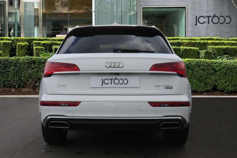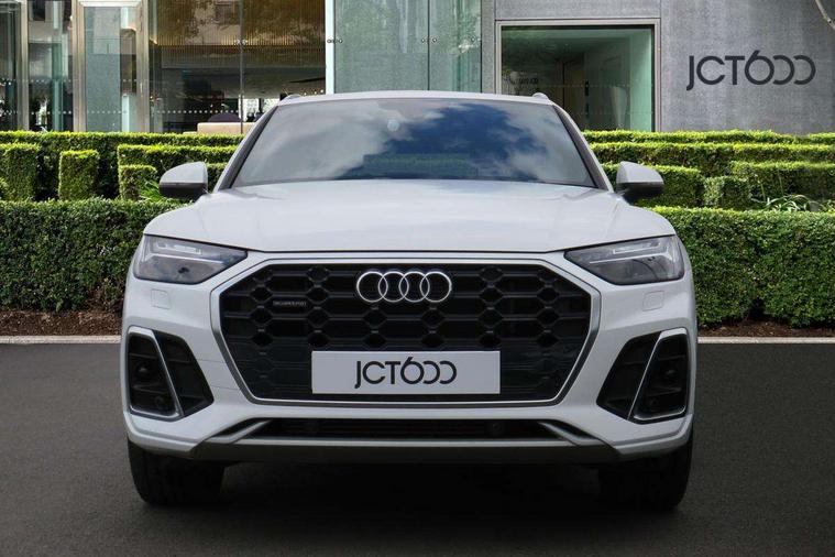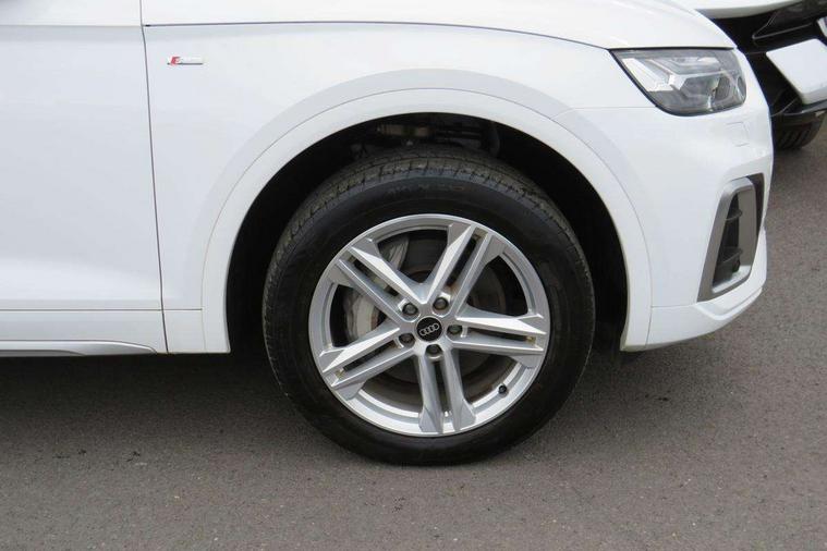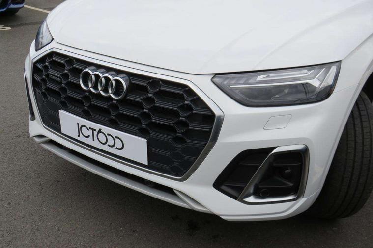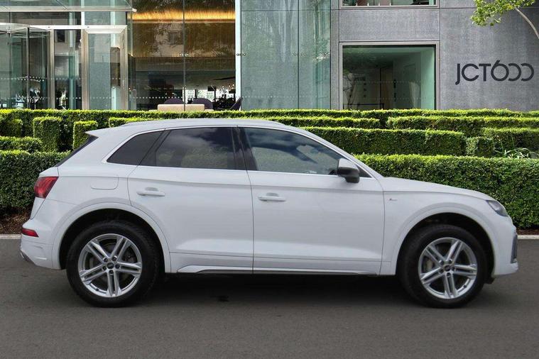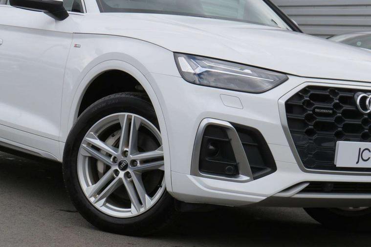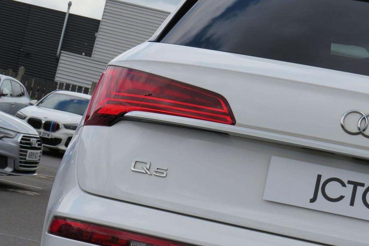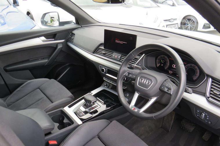 Acoustic front and rear parking sensor, Audi connect safety and service (e-call), Audi connect with Amazon Alexa Integration, Audi drive select, Audi virtual cockpit with 12.3" screen with specific display, Audi wireless smartphone interface, Automatic start-stop system with coasting functionality and efficiency programme, Bluetooth interface, Electro - mechanical power assisted steering, MMI navigation plus with 10.1" touch screen, Power tailgate, Reversing camera, Service interval indicator, Voice control system with Audi hotword activation "Hey Audi", 3 pin 10 amp domestic charging cable, 7.4 kW onboard charger, Dynamic suspension, Industrial connector CEE 32A, 230V, Quattro on demand, Type 2 mode 3 22kW 32 amp charging cable, Type 2 socket for AC charging, 2 x USB charging port with aux input socket, 8 loudspeakers, DAB Digital radio, 3rd brake light, Acoustic windscreen, Aluminium roof rails, Audi matrix LED headlights with dynamic front and rear indicators, Auto dimming door mirrors, Auto dimming frameless rear view mirror, Automatic headlight adjustment, Automatic headlights and windscreen wipers, Body colour bumpers, Body colour door mirrors, Body colour rear diffuser with matt aluminium silver surrounds, Body colour underbody protection, Chrome plated exhaust trims, Daytime running lights, Door sills in Selenite silver, Electric adjustable/heated/folding door mirrors, Front air inlet surrounds in aluminium, Front and rear electric windows, Front radiator grille in honeycomb design, Headlight washers, Lower bumpers painted in contrast Manhattan grey, Rear chrome trim strip below lights, Rear privacy glass and rear side windows, Rear side wing doors, Rear wiper, Roof bars, S Line badges on the front wings, S Line front and rear bumpers, S Line rear spoiler, S Line side skirts, 3 rear headrests, 3 seater rear seat bench, 3 spoke leather multifunction steering wheel with S badging perforated leather grips, Black cloth headlining, Comfort front centre armrest, Contrast stitching on seats, steering wheel and gear lever gaiter, Deluxe 3 zone electronic climate control, Front/rear floor mats, Gear lever in black leather, Heated front seats, Height adjustable front head restraints, Height/reach adjustable steering column, Illuminated door sill trims with S logo, Luggage compartment cover, Manual seat adjustment with 4-way electric lumbar support, Rear seat bench plus-adjust for forwards/backwards position/backrest angle, cupholders in the armrest, load through hatch and remote backrest release, Single front passenger seat, Sunvisors with vanity mirrors, Trunk roller cover, High gloss pack - Q5, LED interior light pack - Q5, 3 point seatbelts on all seats, 6 airbags - Driver, front passenger, curtain and side airbags, Electrically operated child locks on rear doors, Electromechanical parking brake, Electronic stabilisation control including ABS, ASR and EDL, First aid kit with warning triangle and vests, Front passenger airbag deactivation, Hill descent control, Hill hold assist, ISOFIX child seat mounting for front passenger seat and ISOFIX child seat mounting with Top Tether for outer rear seats, Multi collision brake assist, Pop-up bonnet for pedestrian protection, Pre sense city, Seat belt force limiter, Seatbelt monitoring, Tyre pressure warning, Anti theft alarm, Anti-theft wheel bolts, Keyless Go access/ignition system, Remote central locking, Air vents inserts and centre console in gloss black, Matt brushed aluminium inlays, Tool kit, Tyre repair kit,