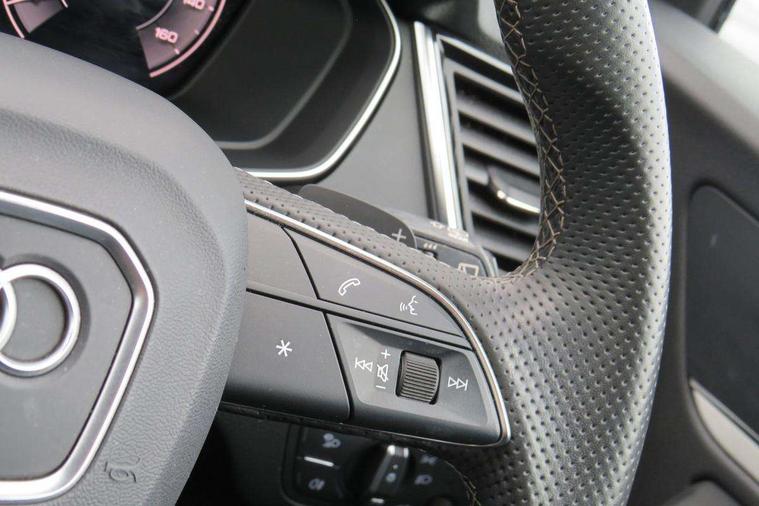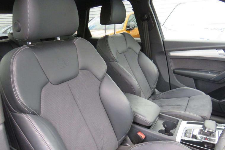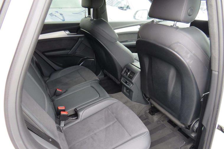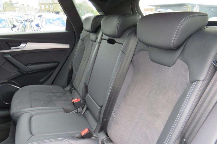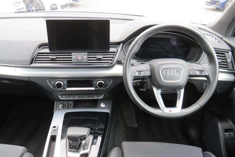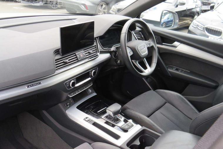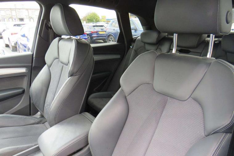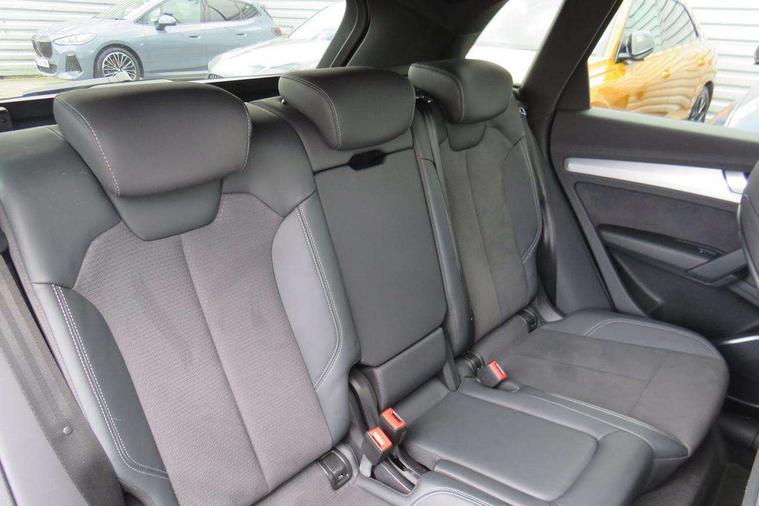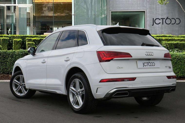 Acoustic front and rear parking sensor, Audi connect safety and service (e-call), Audi connect with Amazon Alexa Integration, Audi drive select, Audi virtual cockpit with 12.3" screen with specific display, Audi wireless smartphone interface, Automatic start-stop system with coasting functionality and efficiency programme, Bluetooth interface, Electro - mechanical power assisted steering, MMI navigation plus with 10.1" touch screen, Power tailgate, Reversing camera, Service interval indicator, Voice control system with Audi hotword activation "Hey Audi", 3 pin 10 amp domestic charging cable, 7.4 kW onboard charger, Dynamic suspension, Industrial connector CEE 32A, 230V, Quattro on demand, Type 2 mode 3 22kW 32 amp charging cable, Type 2 socket for AC charging, 2 x USB charging port with aux input socket, 8 loudspeakers, DAB Digital radio, 3rd brake light, Acoustic windscreen, Aluminium roof rails, Audi matrix LED headlights with dynamic front and rear indicators, Auto dimming door mirrors, Auto dimming frameless rear view mirror, Automatic headlight adjustment, Automatic headlights and windscreen wipers, Body colour bumpers, Body colour door mirrors, Body colour rear diffuser with matt aluminium silver surrounds, Body colour underbody protection, Chrome plated exhaust trims, Daytime running lights, Door sills in Selenite silver, Electric adjustable/heated/folding door mirrors, Front air inlet surrounds in aluminium, Front and rear electric windows, Front radiator grille in honeycomb design, Headlight washers, Lower bumpers painted in contrast Manhattan grey, Rear chrome trim strip below lights, Rear privacy glass and rear side windows, Rear side wing doors, Rear wiper, Roof bars, S Line badges on the front wings, S Line front and rear bumpers, S Line rear spoiler, S Line side skirts, 3 rear headrests, 3 seater rear seat bench, 3 spoke leather multifunction steering wheel with S badging perforated leather grips, Black cloth headlining, Comfort front centre armrest, Contrast stitching on seats, steering wheel and gear lever gaiter, Deluxe 3 zone electronic climate control, Front/rear floor mats, Gear lever in black leather, Heated front seats, Height adjustable front head restraints, Height/reach adjustable steering column, Illuminated door sill trims with S logo, Luggage compartment cover, Manual seat adjustment with 4-way electric lumbar support, Rear seat bench plus-adjust for forwards/backwards position/backrest angle, cupholders in the armrest, load through hatch and remote backrest release, Single front passenger seat, Sunvisors with vanity mirrors, Trunk roller cover, High gloss pack - Q5, LED interior light pack - Q5, 3 point seatbelts on all seats, 6 airbags - Driver, front passenger, curtain and side airbags, Electrically operated child locks on rear doors, Electromechanical parking brake, Electronic stabilisation control including ABS, ASR and EDL, First aid kit with warning triangle and vests, Front passenger airbag deactivation, Hill descent control, Hill hold assist, ISOFIX child seat mounting for front passenger seat and ISOFIX child seat mounting with Top Tether for outer rear seats, Multi collision brake assist, Pop-up bonnet for pedestrian protection, Pre sense city, Seat belt force limiter, Seatbelt monitoring, Tyre pressure warning, Anti theft alarm, Anti-theft wheel bolts, Keyless Go access/ignition system, Remote central locking, Air vents inserts and centre console in gloss black, Matt brushed aluminium inlays, Tool kit, Tyre repair kit,