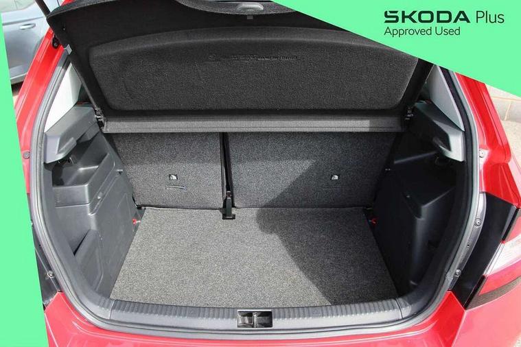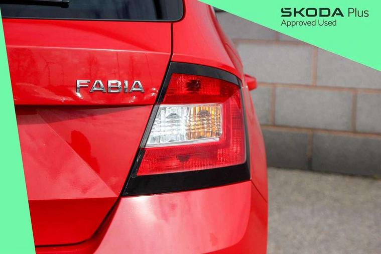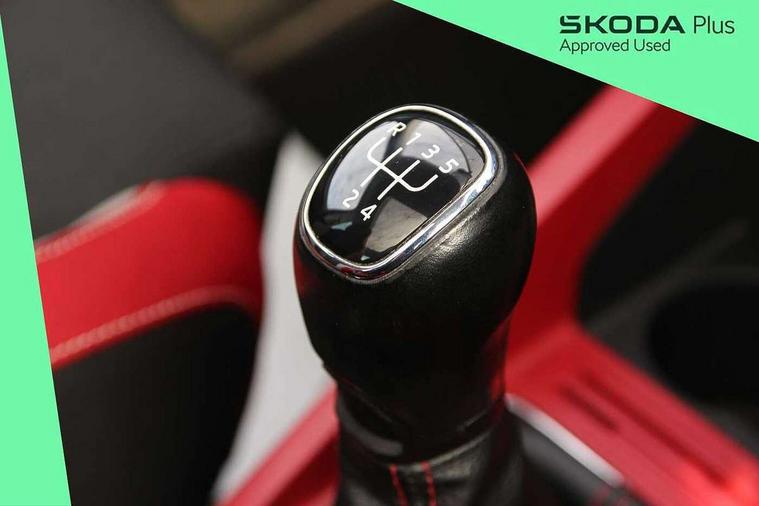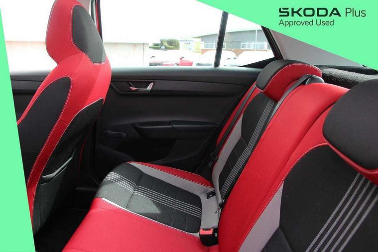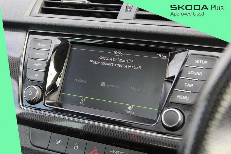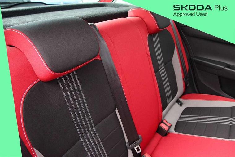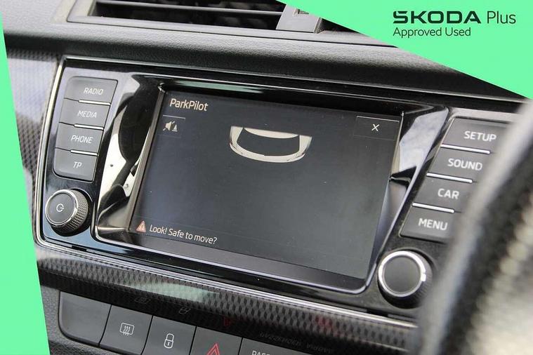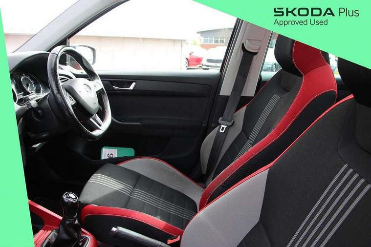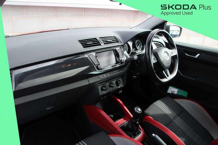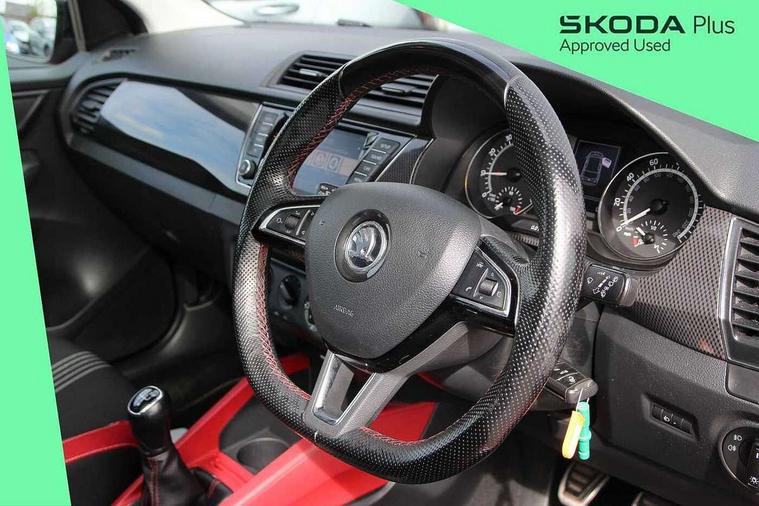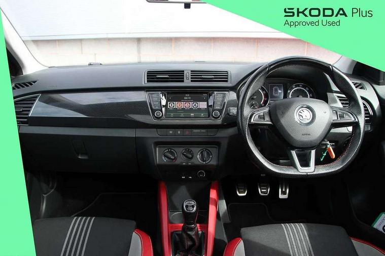 Bluetooth system, Exterior temperature gauge, Front assistant collision mitigation, Maxi dot trip computer, PAS, Service interval indicator, SmartLink, Auxiliary socket for external MP3 player, Bolero radio with telephone control, Mirror Link, USB and SD card, DAB Digital radio, Black door mirrors, Black radiator grille, Body colour bumpers, Body colour door handles, Body coloured rear spoiler, Electric front windows, Electrically adjustable and heated door mirrors, Heated rear window, Height adjustable headlamps, Illuminated door sill inserts, Intermittent rear wash/wipe, LED daytime running lights, Panoramic sunroof, Sunset glass from b-pillar back, Tinted rear windows, Tinted windscreen, 1.5L bottle holder in front door panels, 2 height adjustable rear headrests, 3 spoke leather multifunction sports steering wheel with red stitching, 60/40 split folding rear seat, Boot stowage box, Cargo area storage tray, Cloth upholstery, Driver + passenger vanity mirrors, Floor mats with red stitching, Folding grab handles, Front reading lights, Front sports seats, Height adjustable driver's seat, Height adjustable front headrests, Height adjustable passenger seat, Height/reach adjust steering wheel, Interior light with delay, Leather gearshift, Leather handbrake, Lower glovebox cover, Luggage load hooks, Parcel shelf, Pearl grey carpets, Pearl grey headlining, Pollen filter, Rear courtesy light, Rear storage trays, Storage compartment under front seats, Ticket holder, Two rear outer seat isofix location points, Arkamys surround sound pack - Fabia, Chrome Pack - Fabia, 3x3 point rear seatbelts, ABS, Curtain airbags, Driver and passenger airbags, Driver and passenger side airbags, EDS, ESC with ASR, Front seatbelt pretensioners, Hydraulic Brake Assist (HBA), Passenger airbag deactivate switch, Seatbelt warning, Tyre pressure monitor, Alarm with interior monitoring, Immobiliser, Locking wheel bolts, Remote central locking, Black cube decorative insert,