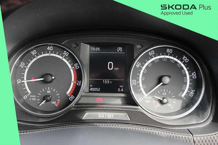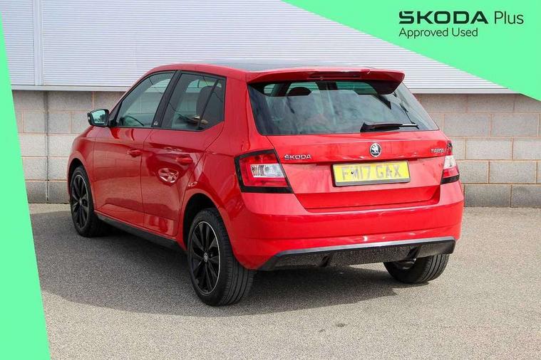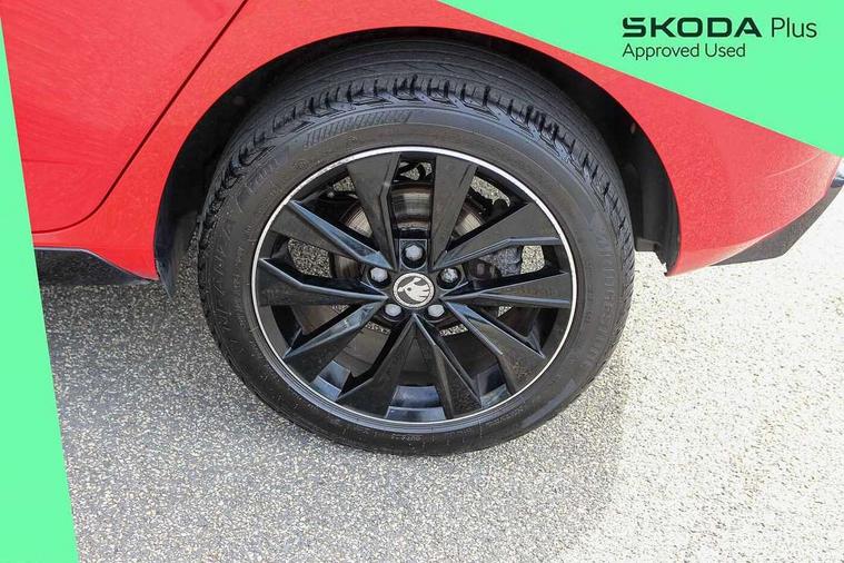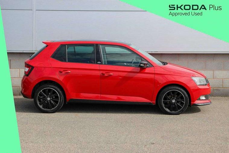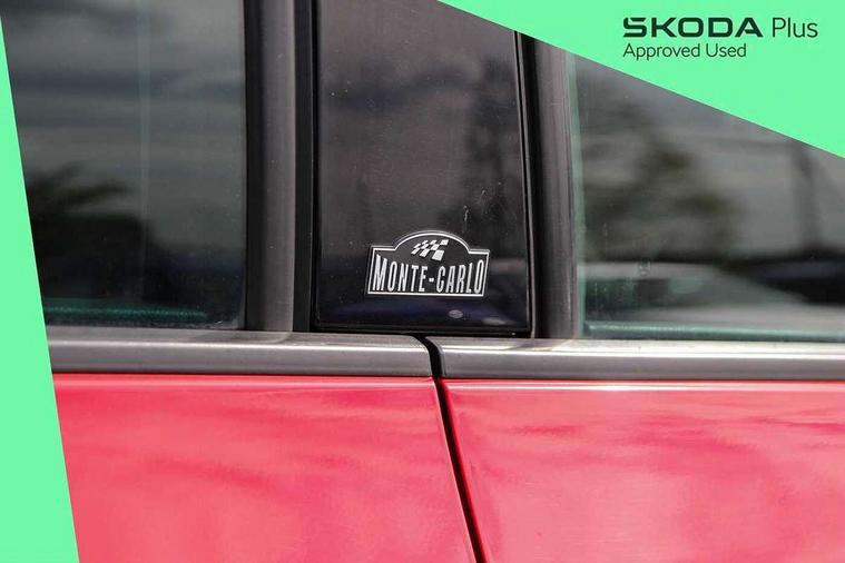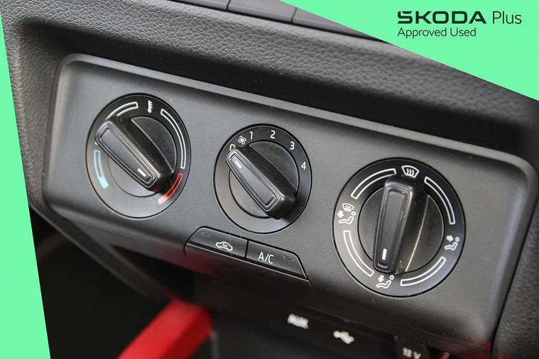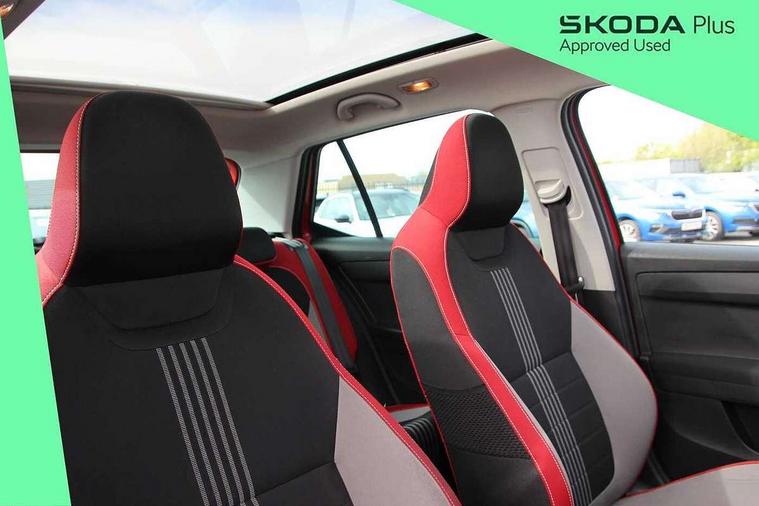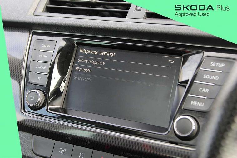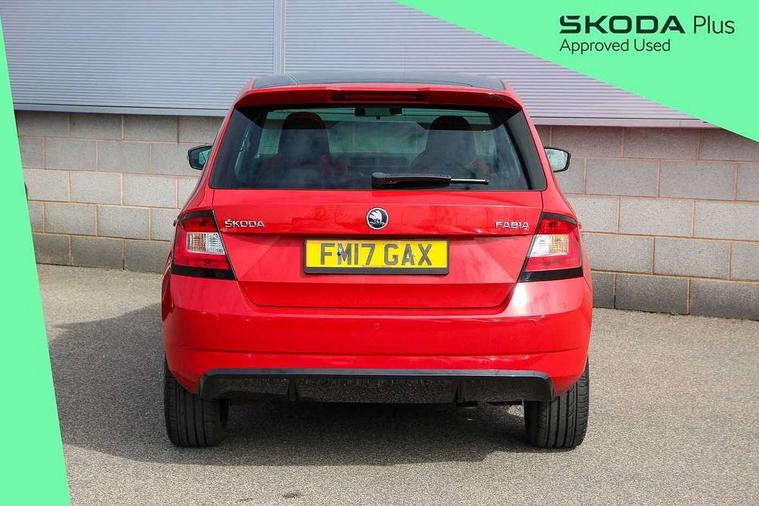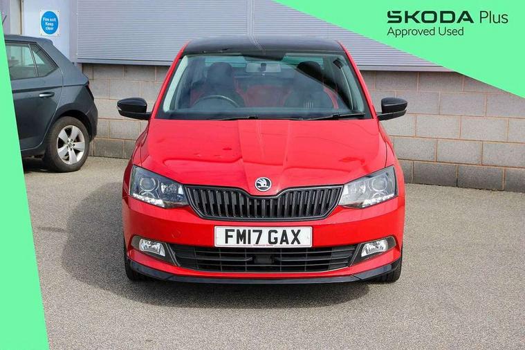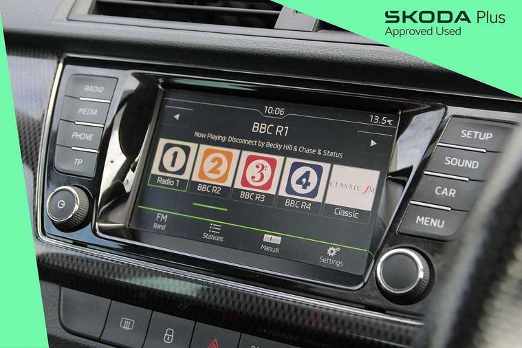 Bluetooth system, Exterior temperature gauge, Front assistant collision mitigation, Maxi dot trip computer, PAS, Service interval indicator, SmartLink, Auxiliary socket for external MP3 player, Bolero radio with telephone control, Mirror Link, USB and SD card, DAB Digital radio, Black door mirrors, Black radiator grille, Body colour bumpers, Body colour door handles, Body coloured rear spoiler, Electric front windows, Electrically adjustable and heated door mirrors, Heated rear window, Height adjustable headlamps, Illuminated door sill inserts, Intermittent rear wash/wipe, LED daytime running lights, Panoramic sunroof, Sunset glass from b-pillar back, Tinted rear windows, Tinted windscreen, 1.5L bottle holder in front door panels, 2 height adjustable rear headrests, 3 spoke leather multifunction sports steering wheel with red stitching, 60/40 split folding rear seat, Boot stowage box, Cargo area storage tray, Cloth upholstery, Driver + passenger vanity mirrors, Floor mats with red stitching, Folding grab handles, Front reading lights, Front sports seats, Height adjustable driver's seat, Height adjustable front headrests, Height adjustable passenger seat, Height/reach adjust steering wheel, Interior light with delay, Leather gearshift, Leather handbrake, Lower glovebox cover, Luggage load hooks, Parcel shelf, Pearl grey carpets, Pearl grey headlining, Pollen filter, Rear courtesy light, Rear storage trays, Storage compartment under front seats, Ticket holder, Two rear outer seat isofix location points, Arkamys surround sound pack - Fabia, Chrome Pack - Fabia, 3x3 point rear seatbelts, ABS, Curtain airbags, Driver and passenger airbags, Driver and passenger side airbags, EDS, ESC with ASR, Front seatbelt pretensioners, Hydraulic Brake Assist (HBA), Passenger airbag deactivate switch, Seatbelt warning, Tyre pressure monitor, Alarm with interior monitoring, Immobiliser, Locking wheel bolts, Remote central locking, Black cube decorative insert,