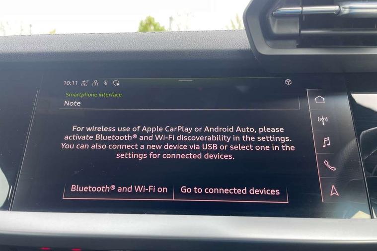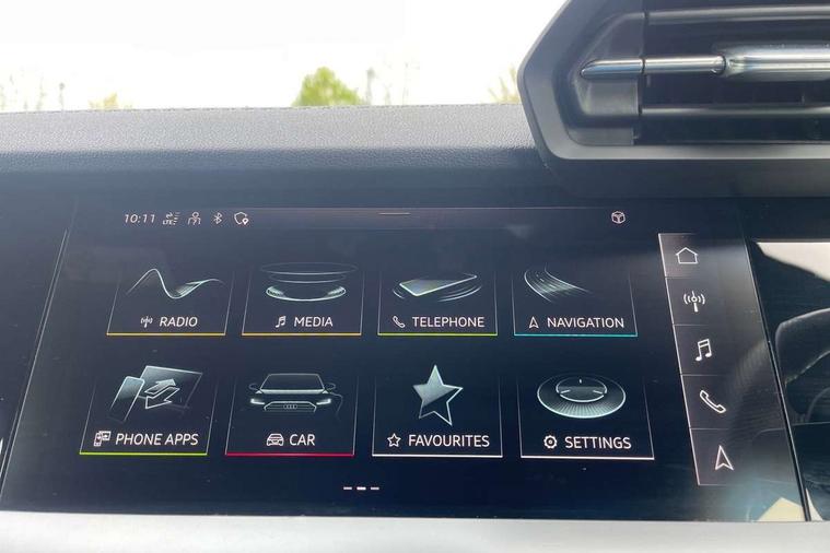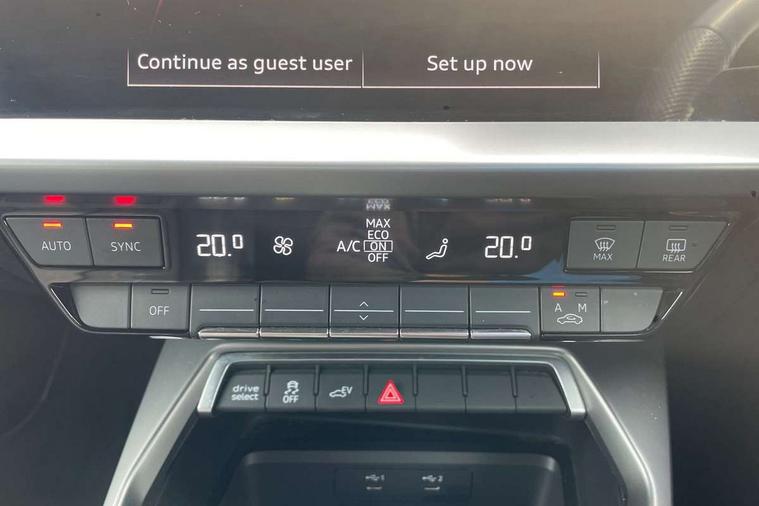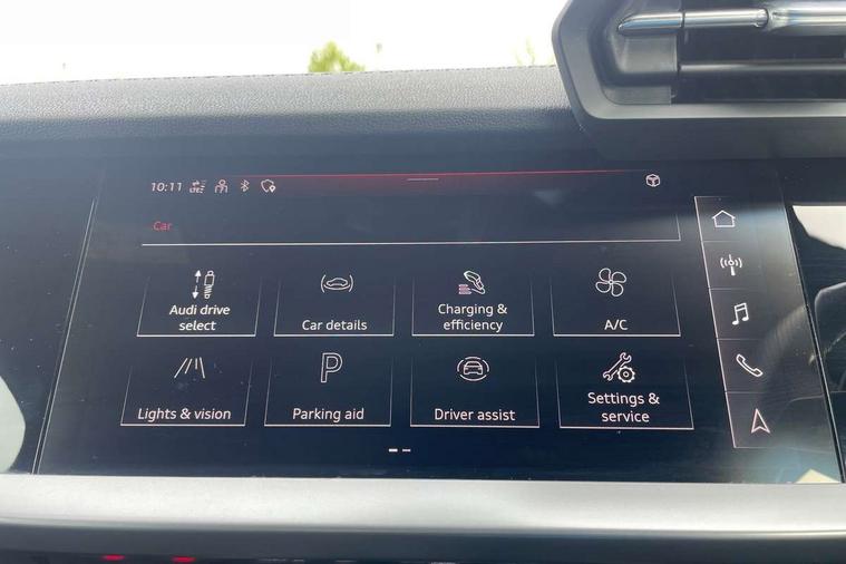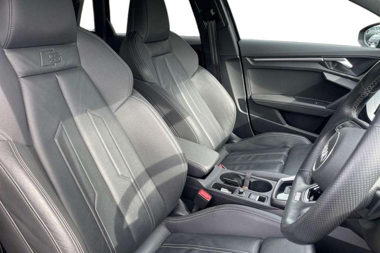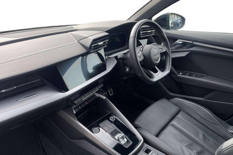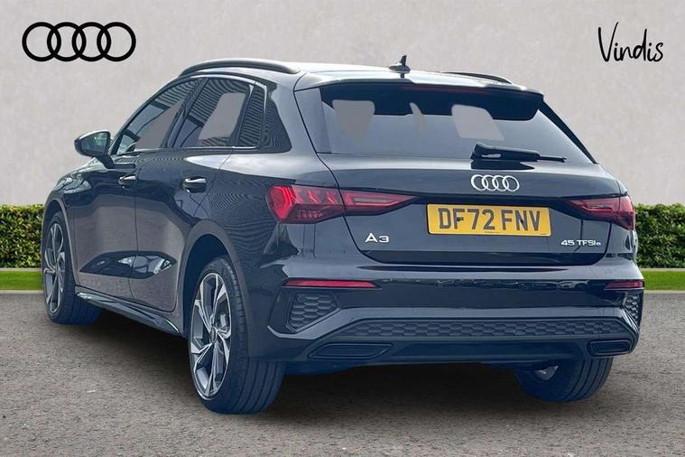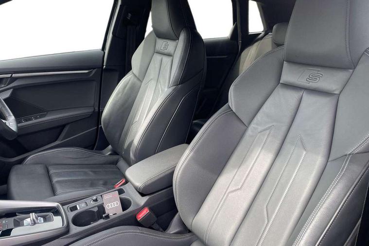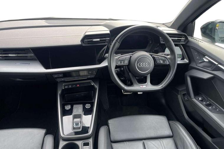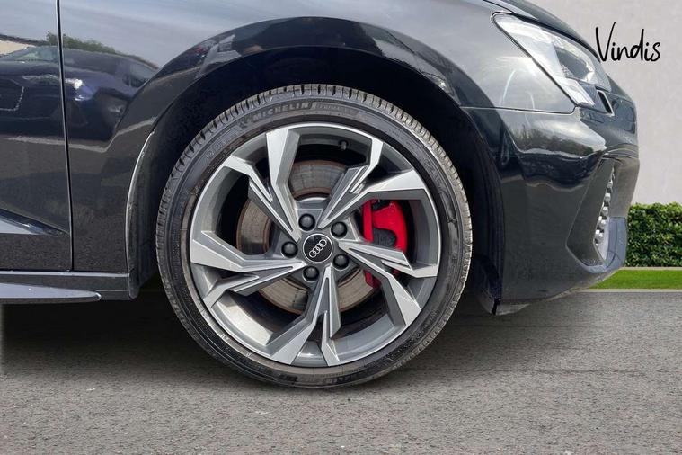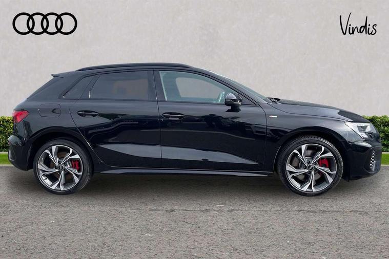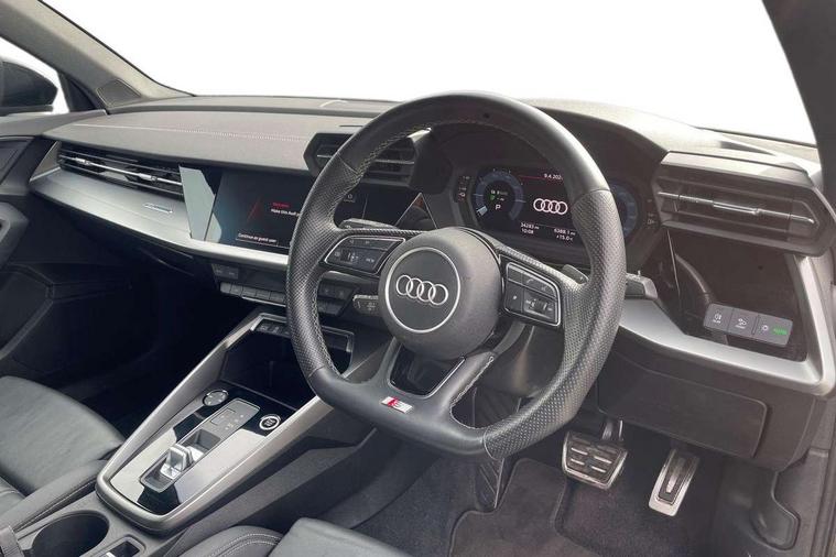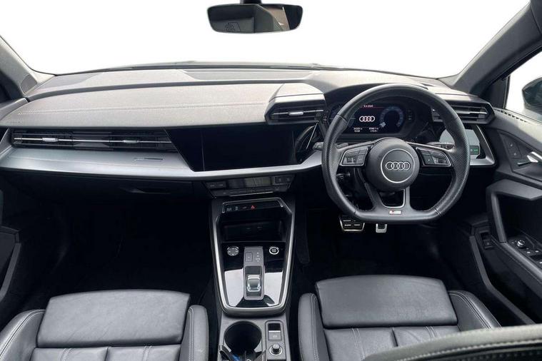 Audi drive select (Auto, Comfort, Dynamic, Efficiency and Individual), Audi smartphone interface, Audi Virtual Cockpit - 10.25" digital and colour instrument cluster, Automatic start/stop system with recuperation, Bluetooth interface, Collision avoidance assistant, e-Call (emergency call), Electromechanical power speed sensitive steering, Lane departure warning system, MMI Navigation Plus with high resolution 10.1" colour touch screen display, Service indicator, Trip computer, Voice control system with natural language interaction, 2.9 kW On-board charger, 3 pin 10 amp domestic charging cable, Standard suspension, Type 2 mode 3 32 amp charging cable, Type 2 socket for AC charging, 2xUSB-C connection with data and charging functions, 6 passive loudspeakers, DAB Digital radio, 3rd brake light, Acoustic glass windscreen, Aluminium window trim, Auto dimming frameless rear view mirror, Electrically adjustable/heated/folding/auto dimming door mirrors with integrated LED indications + kerb view function for passenger side, Front electric windows, Illuminated aluminium inserts front door sills with S logo, LED daytime running lights, LED headlights with LED rear lights and dynamic rear indicators, Light and rain sensors, Privacy glass - dark tinted rear window, rear door and side windows, Rear electric windows, Rear side air outlets in grained matt black, Rear side wing doors, Rear wiper, S line bumpers, S roof spoiler, 12V socket and storage compartment in front centre console, 3 seat bench in 2nd row, 40/20/40 split folding rear seat bench with cupholder, Black cloth headlining, Dual zone electronic climate control, Front and rear centre armrest in leather, Front and rear headrests, Front/rear floor mats, Height and reach adjustable steering wheel, Illuminated vanity mirror, Interior lighting - glove compartment light and right hand side, Luggage compartment floor covering, Manual boot compartment lid, Manually adjustable front seats, Seat side bolsters, Single front passenger seat, Stainless steel pedals and front footrest in black, Twin leather upholstery with front sports seats S embossed logo, Aluminium interior elements pack - A3 Sportback, Black styling pack - A3 Sportback, LED interior lighting pack - A3 Sportback, S line styling pack - A3 Sportback, 3x3 point rear seat belts, Audi pre sense front, Driver and front passenger airbag with passenger airbag deactivation, Electronic Stabilisation Control (ESC) including ABS, ASR and EDL, First aid kit with warning triangle and 2 safety vests, Front side airbags with head airbags and interaction airbag, Pre-sense front with pedestrian and cyclist detection, Red brake calipers, Seatbelt monitoring, Tyre pressure loss indicator, Anti theft alarm, Anti-theft wheel bolts, Electronically operated child lock, Immobiliser, Remote control central locking, Accent surfaces in the dashboard and centre console in platinum grey silk effect paint finish, Dark spectrum aluminium inlays, Tool kit, Tyre repair kit,