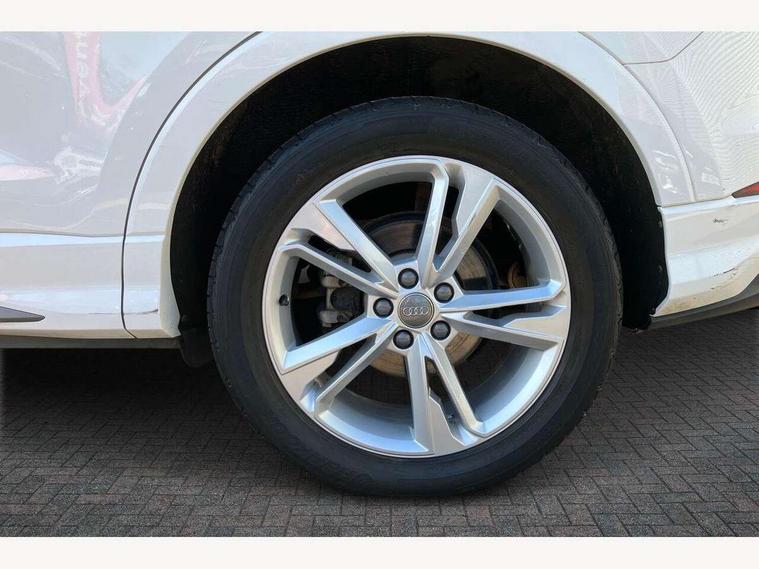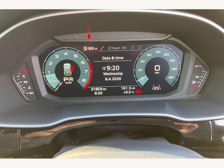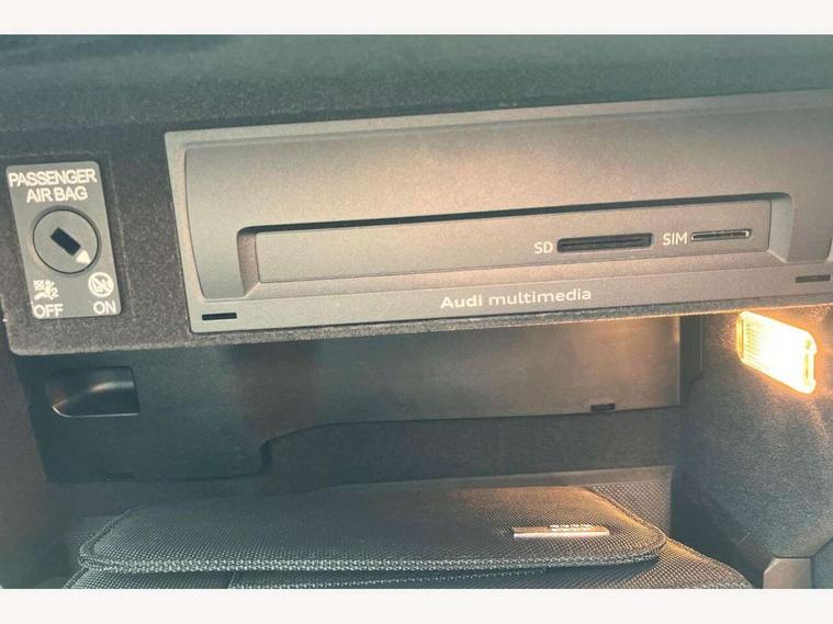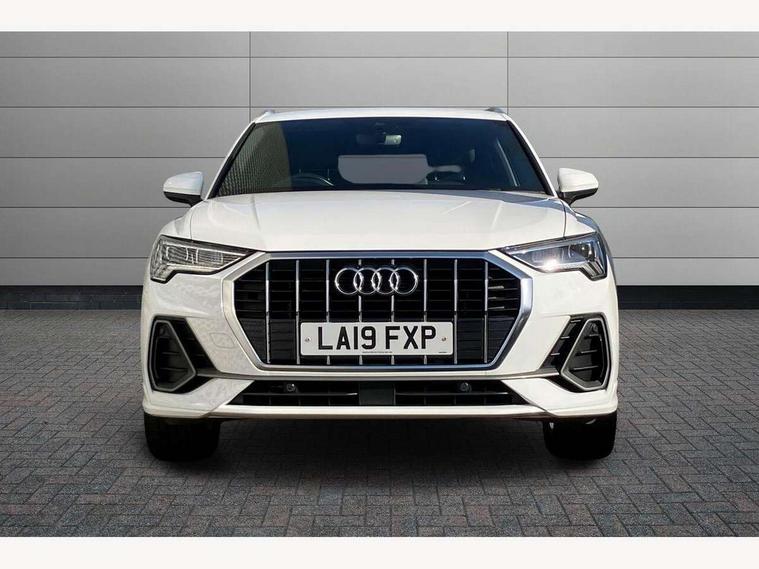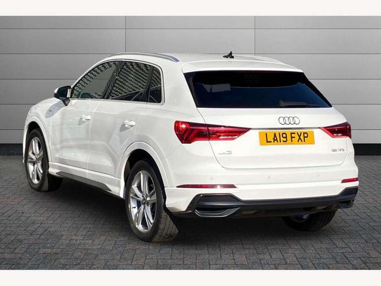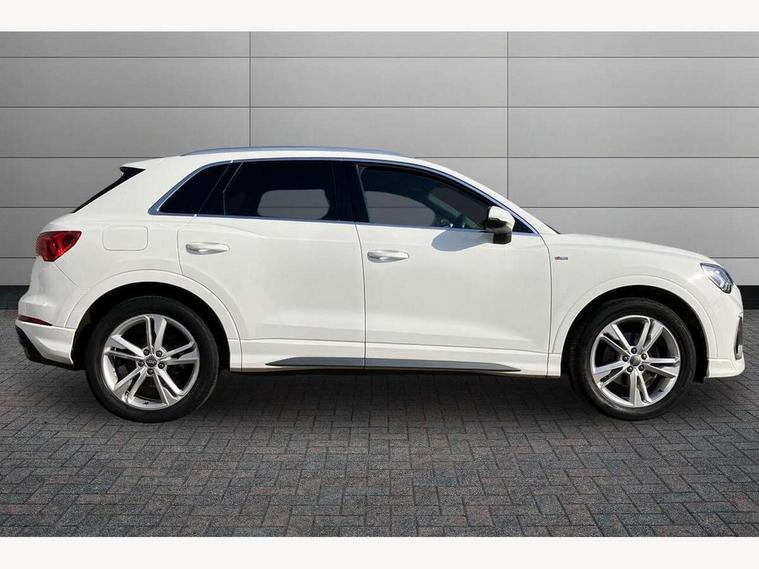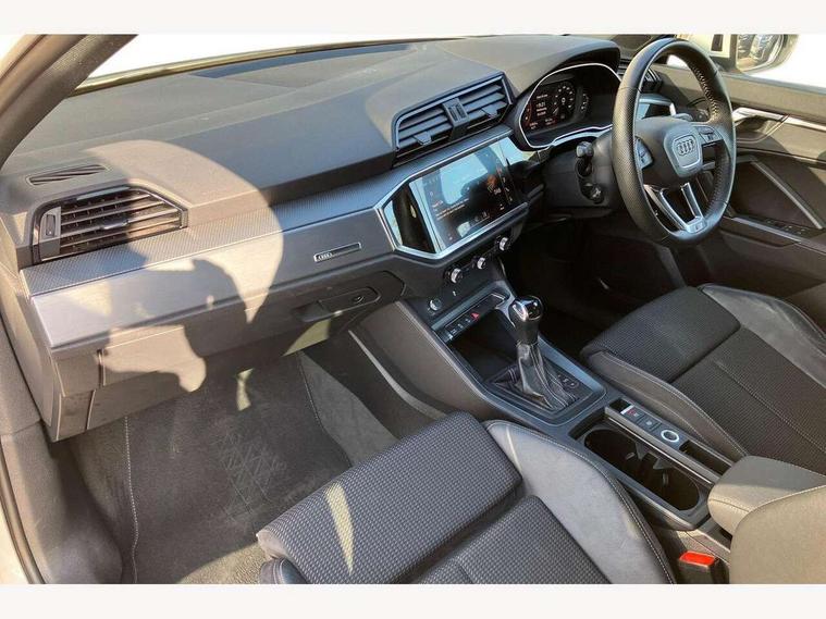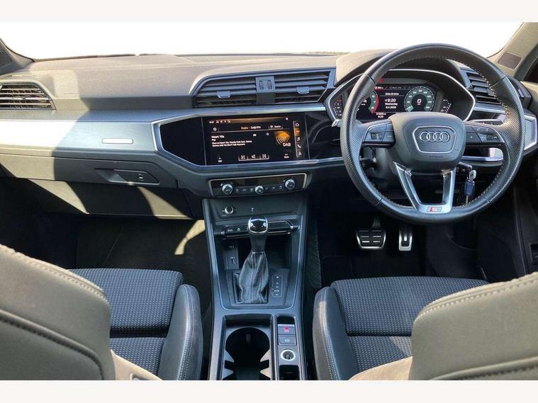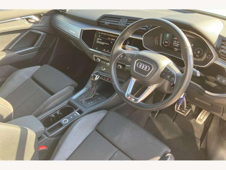 Audi connect safety and service (e-call), Audi drive select, Audi lane departure warning, Audi side assist, Audi smartphone interface, Bluetooth interface, Camera based traffic sign recognition, MMI navigation plus with MMI touch, Power opening/closing tailgate, Progressive steering, Rear parking sensors, Service interval indicator, Stop/start system, Voice control system, Sports suspension, 1 x USB type C and 1 USB type A charging points, 6 speakers, DAB digital radio module, Acoustic windscreen, Aluminium roof rails, Aluminium window trim, Auto dimming rear view mirror, Body coloured bumpers, Diffuser in matt Platinum grey, Electrically adjustable and heated door mirrors with integrated LED side indicators, Front and rear electric windows, Front fog lights, Front side air inlets in matt platinum grey, Front spoiler blade in matt platinum grey, Grille vertical bars in aluminium silver/Matt, High gloss black finish B and C pillars, LED headlights with LED daytime running lights and dynamic rear indicator, LED rear lights, Privacy glass, Rain and light sensors, Rear diffuser strip in matt titanium black, S Line badge on wings, S Line front and rear bumpers, Side skirt insert in matt Platinium grey, Titanium black radiator grille, 12V socket in rear centre console, 40:20:40 split folding rear bench seat, Adjustable rear seat bench/backrest with centre armrest and cupholder, Aluminium door sill trims, Black cloth headlining, Dual zone climate control, Front and rear black floor mats with contrast stitching in rock grey, Front and rear headrests, Front centre armrest with storage compartment and angle adjustment, Illuminated door sill trims with S logo, ISOFIX child seat mounting and Top Tether with front passenger airbag deactivation, Manual front seats with height adjustment, Perforated leather gearknob, Stainless steel luggage compartment sill finisher, Stainless steel pedals, Tool kit, Non smoking pack - Q3, 3x3 point rear seatbelts, 6 airbags - Driver, front passenger, curtain and side windows, Electrically operated child locks on rear doors, Electromechanical parking brake, Electronic stabilisation control including ABS, ASR and EDL, Hill hold assist, Pre sense basic, Seatbelt monitoring, Tyre pressure warning, Warning triangle and first aid kit, Anti theft alarm, Anti theft wheel bolts, Audi pre-sense front with pedestrain and cyclist recognition, Remote central locking, Dark matt brushed aluminium inlay, MMI touch colour display in gloss black with aluminium surround, Tyre repair kit,