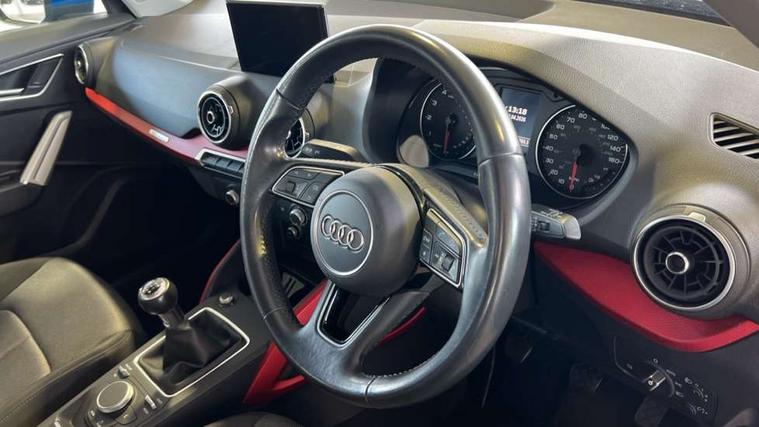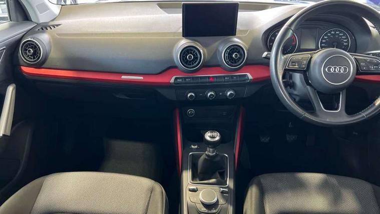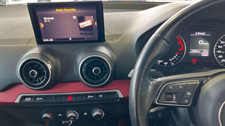 Audi drive select, Audi smartphone interface, Bluetooth hands free telephone connection, MMI - Multi Media Interface control system, MMI SD card Navigation, PAS, Service interval indicator, Voice control system, Dynamic suspension, Audi music interface, Aux input, CD player, DAB digital radio module, MMI radio plus with 7" colour MMI screen and MMI controller, USB port, Body colour door mirrors, Chrome exhaust tailpipe, Door mirror integrated indicators, Electrically adjustable and heated door mirrors, Front and rear electric windows, Rear wiper, Sunband for windscreen, Aluminium door sill trims, Centre console with storage/cupholders, Front and rear door pockets, Front and rear headrests, Front and rear velour floor mats, Front centre armrest, Front sports seats, Glovebox, Height adjustable front seats, Height/reach adjust steering wheel, ISOFIX on front passenger and rear outer seats, Storage compartment in rear centre console, Titanium grey cloth headlining, Non smoking pack - Q2, 3x3 point rear seatbelts, ABS+Electronic Brake force Distribution, Curtain airbags, Driver and passenger airbags, Driver and passenger side airbags, EDL + ASR, Electrically operated child locks on rear doors, Electromechanical parking brake, ESP, Multi-Collision braking, Pre-sense front with pedestrian recognition, Seatbelt warning light, Tyre pressure monitoring system, Warning triangle and first aid kit, Locking wheel bolts, Remote central locking, Thatcham category 1 alarm + immobiliser, Aluminium interior trim,