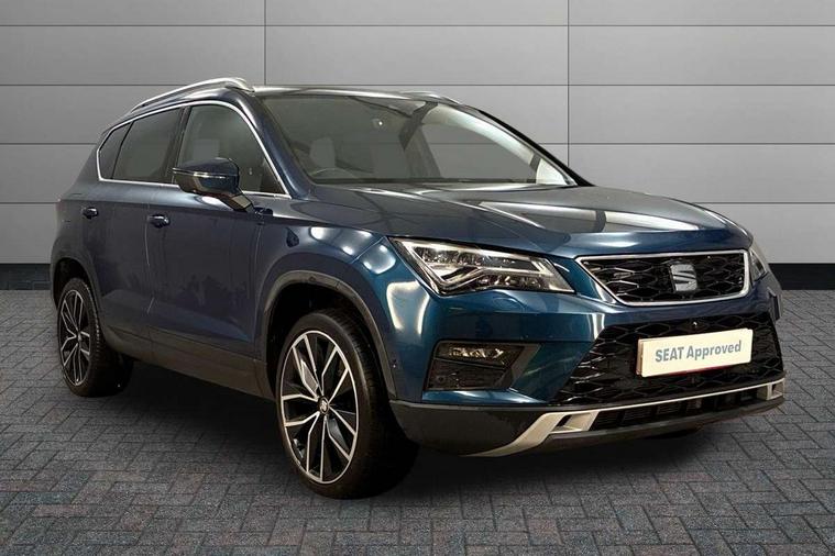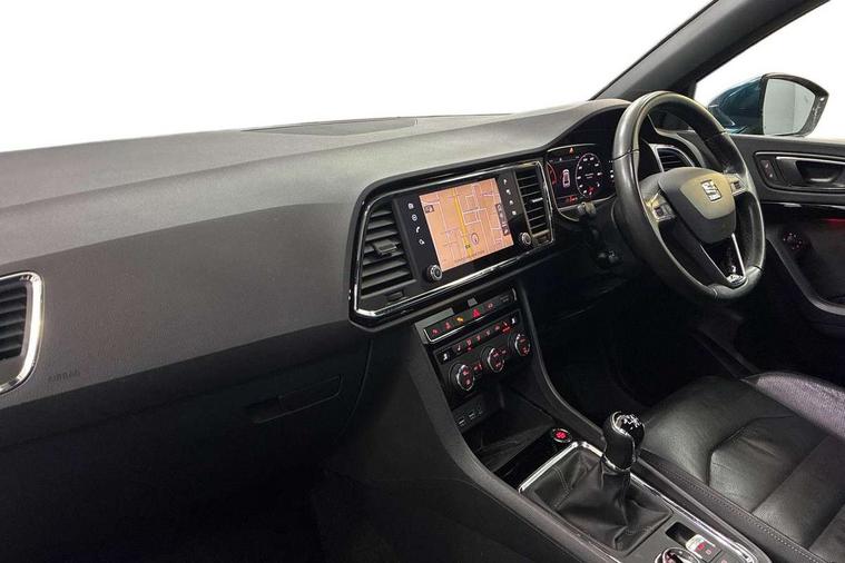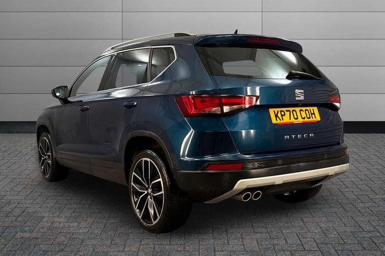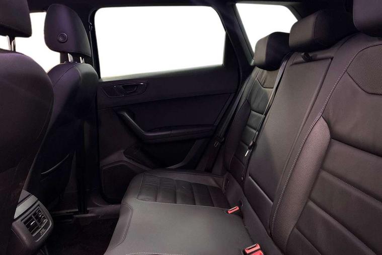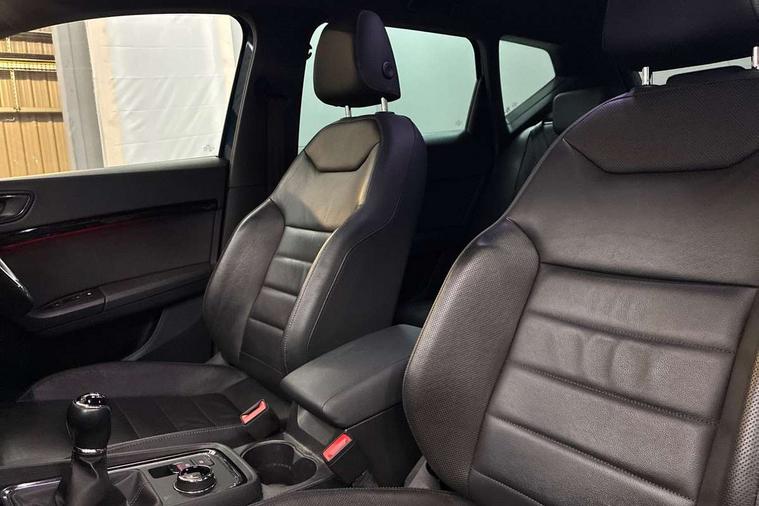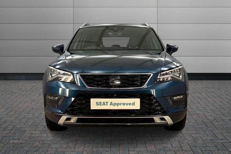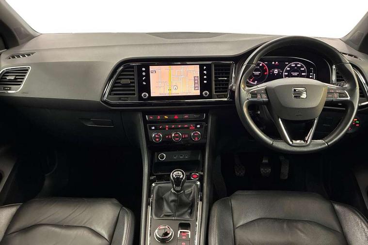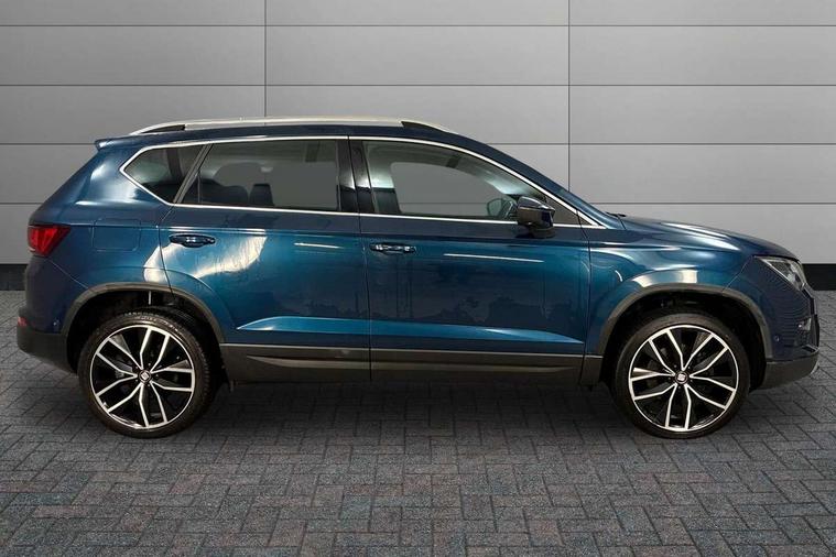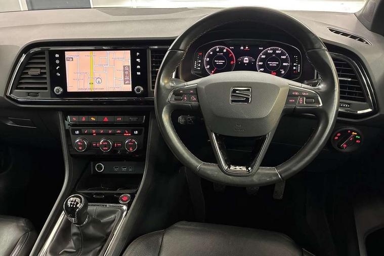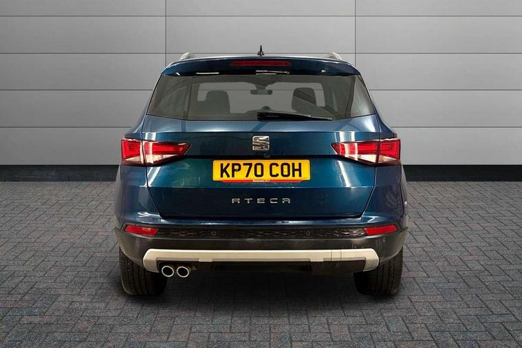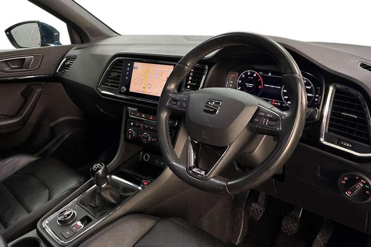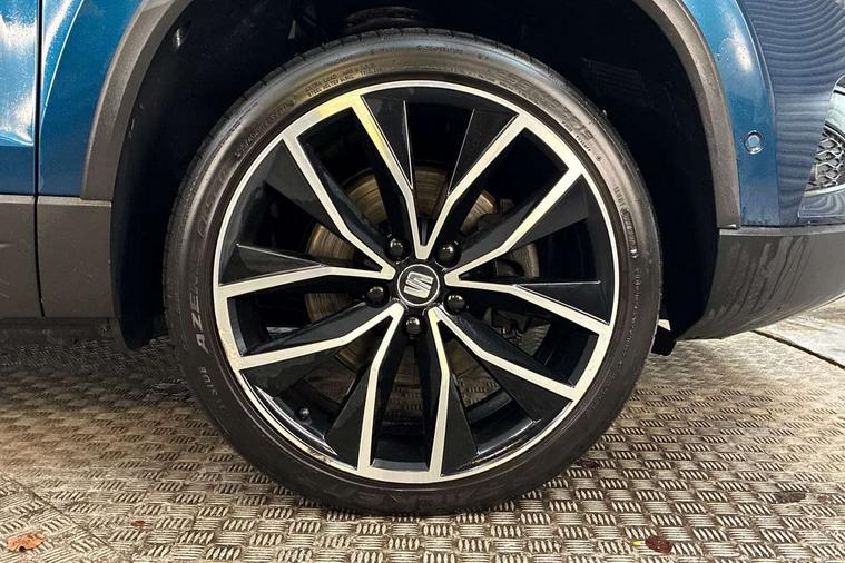 'Lights On' Reminder warning buzzer, Adaptive cruise control, Digital clock, Digital cockpit, Driver alert system, Electric tailgate with virtual pedal, Front assist city emergency braking and pedestrian protection, Full Link Smartphone Integration with Mirror Link, Apple Car Play, Google Android Auto, Low fuel warning light, Multi function display, Outside temperature gauge, Power assist steering, Rear view camera, Remote fuel flap release, RPM counter, Satellite navigation system, SEAT drive profile with driving experience button, SEAT logo boot release, Self parking functionality (includes front and rear parking sensors), Top view camera, Trip computer, Wash water level indicator, Comfort suspension, XDS electronic differential lock, SEAT USB media cable, Steering wheel mounted audio/phone controls, Aluminium front door sills, Armrest with air outlet in rear, Auto dimming rear view mirror, Auto headlights with automatic coming and leaving home function, Black wheel arch extensions, Body colour bumpers, Body colour door handles, Body colour door mirrors, Chrome front grille frame, Chrome roof rails, Chrome side window trim, Dark tinted rear windows, Door mirrors with welcome light silhouette, Electric adjustable/heated/folding door mirrors, Frameless interior mirror, Front and rear electric windows, Front grille in glossy black, Full LED headlights, Headlight washers, Heated windscreen, Illuminated aluminium front door sill with trim logo, LED daytime running lights, LED front fog lights, Rear fog lights, Rear LED tail lights, Rear wash/wipe, Twin chromed exhaust pipes, Visible dual exhaust pipes, 12v socket in front, 4 Lashing eyes in boot, 60/40 split folding rear seat, Adjustable front armrest with storage compartment, Ambient spot lighting and front footwell illumination, Black roof lining, Driver and passenger seats, height-adjustable, with lumbar adjustment and height-adjustable headrests, Driver and passenger sun visor, covered and illuminated mirror, driver sun visor with card holder, Dual zone climate control, Front and rear head restraints, Front courtesy lights, Front cupholders, Front reading lights, Front seat back storage pockets, Gear shift indicator, Heated front seats, Illuminated boot, Illuminated glovebox, Instrument lighting with brightness control, ISOFIX points in outer rear seats with top tether anchorage points, Leather steering wheel and gear knob, Leather upholstery with front sports seats, Multicoloured ambient lighting with LED interior illumination, Rear armrest and easy back seat release mechanism from boot, Rear reading lights, Storage box under drivers seat, Advanced Driving Assistance Pack - Ateca Xcellence, Convenience pack - Ateca, Navigation system pack - Ateca, Winter Pack - Ateca, 3x3 point rear seatbelts, ABS, Automatic post collision braking, Driver/Front Passenger airbags, Drivers knee airbag, Electronic parking brake with auto hold, Electronic stability control, ESP+EBA, Front and rear seatbelt reminder, Front passenger airbag deactivation, Front side airbags, Hill hold control, Tiredness recognition system, Traction control, Twin curtain airbags, Tyre pressure monitoring system, 2 folding remote keys with window open/close function, Immobiliser, Keyless entry and go and connectivity hub with wireless charger, Locking wheel bolts, Remote central locking, Volumetric alarm with back up horn, Chrome interior detailing, 19" Exclusive machined bi-colour alloy wheels,