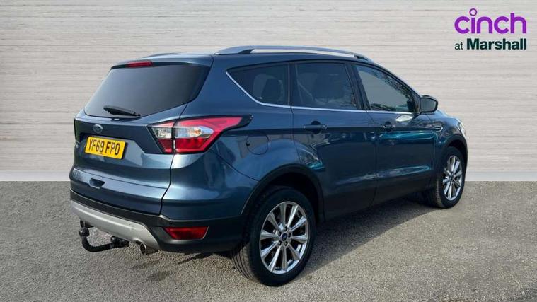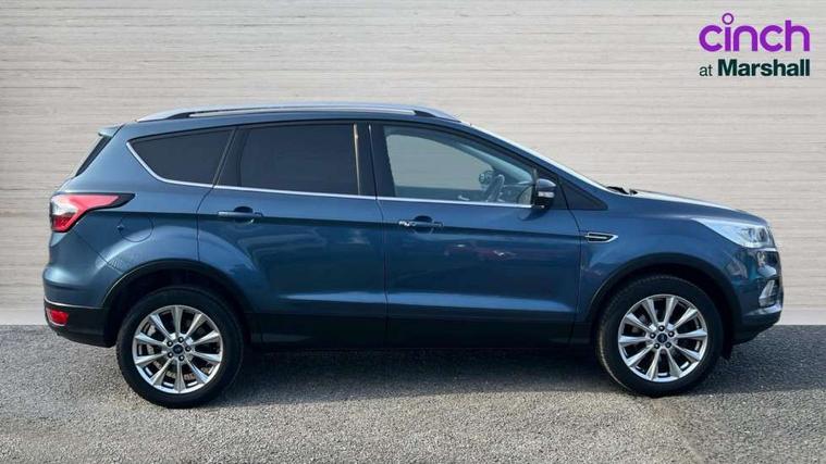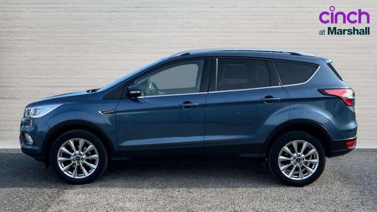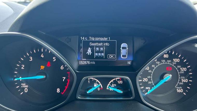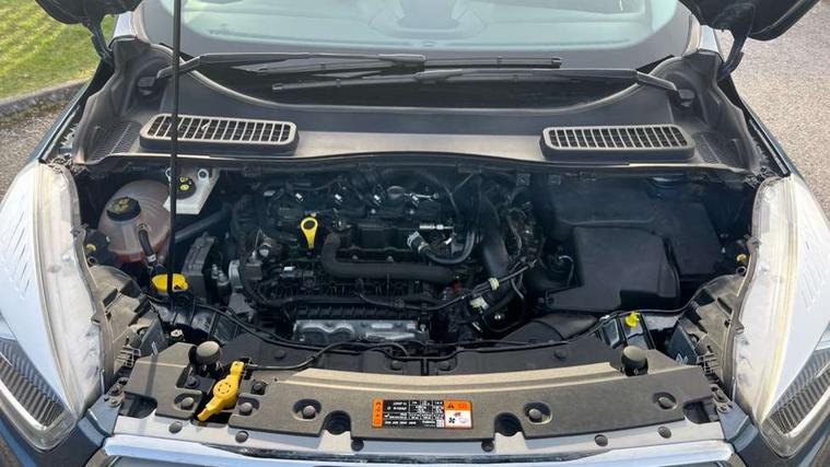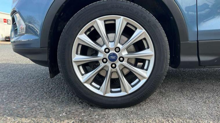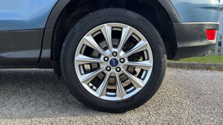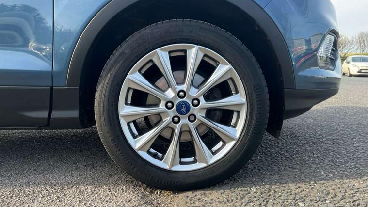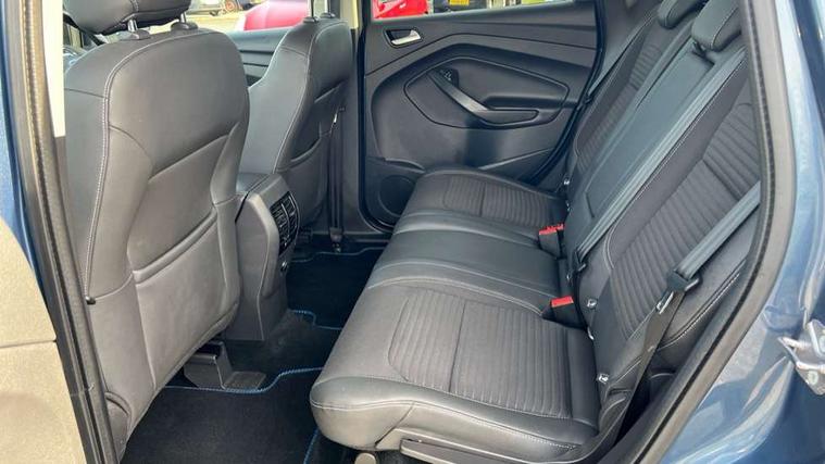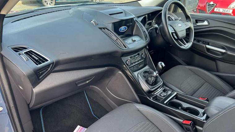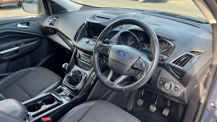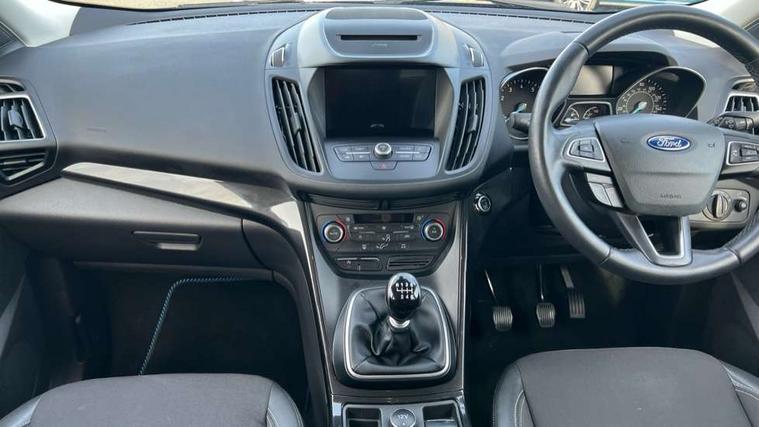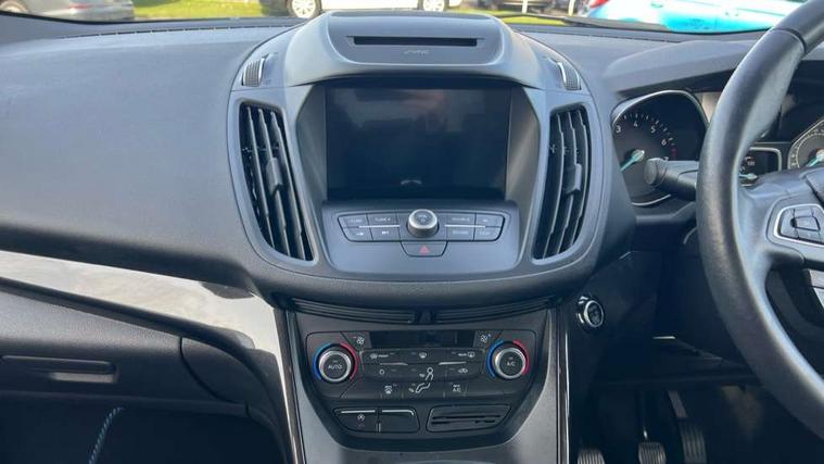 Apple car play/Android Auto, EPAS, Hands free telephone, Trip computer, 2 USB ports, Auxiliary socket for external device, Remote audio controls on steering wheel, Auto dimming rear view mirror, Body colour bumpers, Body colour rear spoiler, Electrically operated and heated door mirrors with side indicators, Electrically operated front and rear windows with global closing, Front fog lights, Front scuff plate, Power folding door mirrors, Quickclear heated windscreen, Rain sensing wipers, Tailgate wash/wipe, Twin exhausts and rear diffuser, 6 way manually adjustable passenger seat with lumbar support, 60/40 split/folding rear back and cushion, Auxiliary power socket in luggage area, Centre console with stowage tray/bottle holder/CD stowage/front and rear 12V power point, Driver/passenger front seatback pockets, Dual electronic automatic temperature control, Folding rear centre armrest, Footwell courtesy lights front and rear, Front floor mats, Front head restraints, Front overhead courtesy lights with theatre style dimming and delay, Front/rear reading lights, Isofix system on outer rear seats, Leather steering wheel and gear knob, Multi-colour ambient interior lighting, Part leather upholstery, Reach + rake adjustable steering column, Rear floor mats, Rear head restraints, Sports style front seats, Stowage unit in upper instrument panel, Tie down hooks, Tonneau cover, Variable intensity instrument illumination, Appearance pack - Kuga, 3 point seatbelts on all 3 rear seats, ABS/EBD, Airbags - front driver/passenger, front & rear side, curtain, drivers knee, EBA, Electric traction assist system, Electronic Stability Programme, Front passenger airbag deactivation switch, Hill start assist, Intelligent Protection System (IPS), Tyre pressure monitoring system, Engine immobiliser, Keyless entry, Keyless start with 'Ford Power' starter button, Locking wheel nuts, MyKey system, Remote powered central double locking doors, Thatcham category 1 alarm, Mini steel spare wheel,