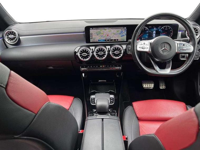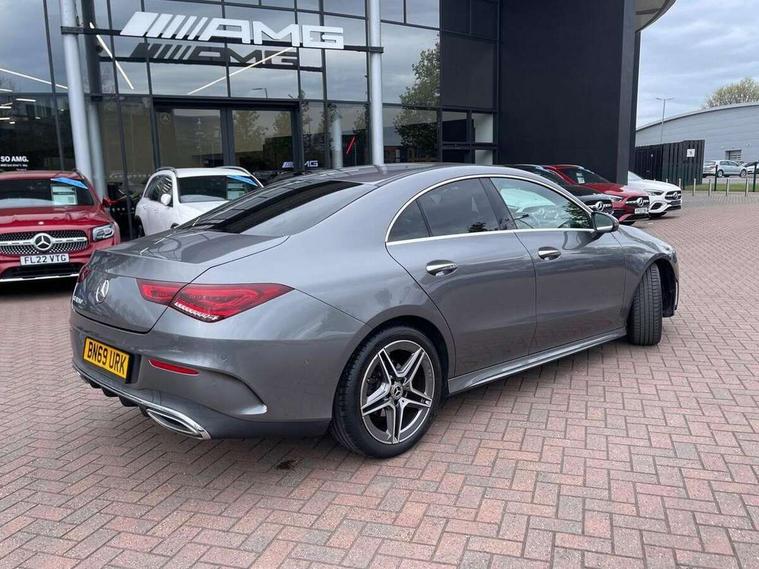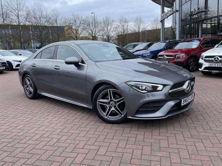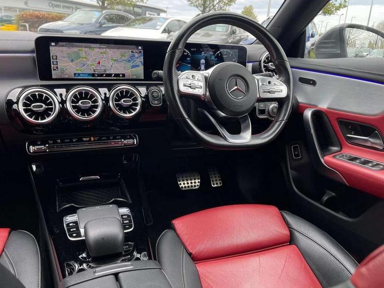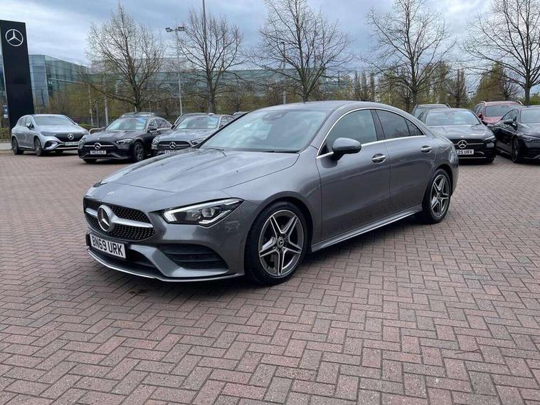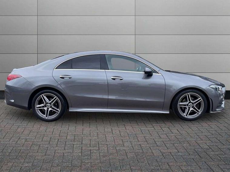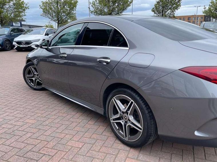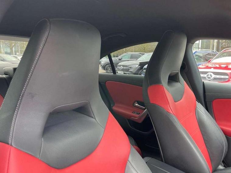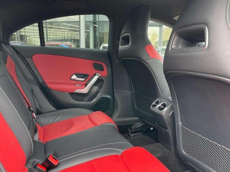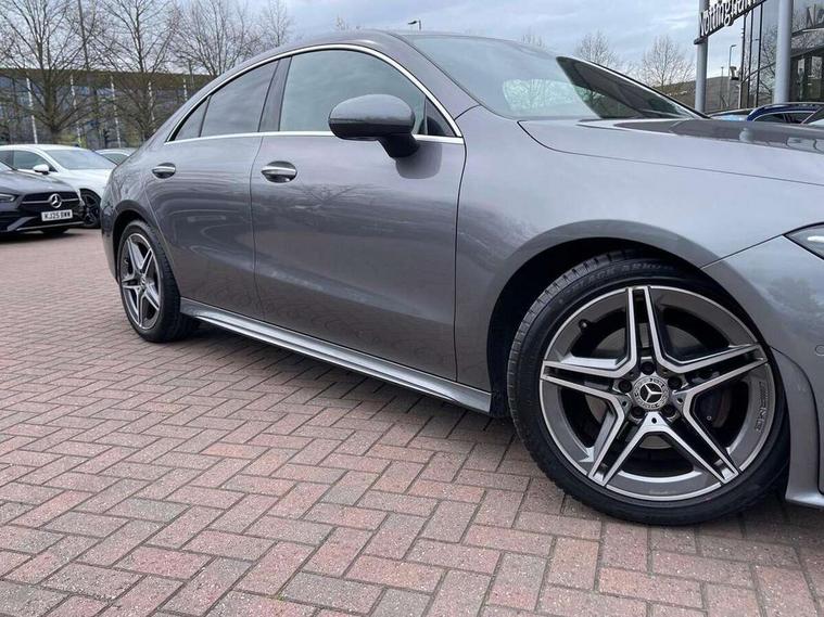 10.25 inch display instrument, 10.25 inch touchscreen central media display, Active lane keeping assist, Attention assist, Cruise control with limiter, Direct steer system with speed sensitive power steering, Dual bluetooth interfaces, DYNAMIC SELECT with a choice of driving modes (ECO, Comfort, Sport, Sport+ and Individual), ECO start/stop function, Fluid level warning indicator for fuel, oil, coolant and washer fluid, Hard-disk navigation, Hey Mercedes Voice activation, Instrument cluster, Lamp failure indicator, MBUX augmented reality for navigation, Mercedes connect me, Outside temperature gauge, Pre-installation for private car sharing, Preinstallation for Mercedes Benz link, Radio aerial integrated into front and rear windshields, Service indicator (ASSYST), Smartphone integration with Apple CarPlay and Android auto, Speed limit assist, Trip computer in multifunction display with current consumption indicator, Wireless charging, 7G-DCT 7 speed automatic transmission, Lowered comfort suspension, Rear axle multi-link, DAB digital radio tuner, MBUX multimedia system with DAB digital radio and touchpad including satellite navigation, Mercedes Benz sound system (225w) includes mid-range sound system, USB (type C) port in front stowage compartment, USB (type C) ports (2) in stowage compartment, Active radiator shutters open for cooling air and close when not needed to improve aerodynamics and fuel efficiency, Adaptive brake lights, AMG body styling front apron, rear apron and side skirts, Beltline strips and weather strip in chrome, Body colour bodystyling side skirt, Body colour bumpers, Body colour door handles with chrome inserts, Diamond radiator grille pins in chrome with silver painted louvres and chrome insert, Electric windows, Electrically adjustable and heated door mirrors with integrated LED indicators, Exhaust system - Twin trapezoidal tailpipes in polished stainless steel, Headlamp assist automatic headlamp activation, Heated glass rear windscreen + timer control, High level LED third brake light, LED high performance headlamps with integrated LED daytime running lights, LED tail lamp, Privacy glass, Rain sensing windscreen wipers with two sensitivity settings, Rear fog lamp, 3 spoke flattened bottom nappa leather multifunction steering wheel with perforated leather in grip area, 40:20:40 split folding rear seat backrests, Air vents with surround in silver chrome, Automatic child seat recognition sensor, Black roof lining, Brushed stainless steel sports pedals with rubber studs, Cup holder and stowage compartment lighting, Floor mats with stitched AMG lettering, Freight packaging with tie-down hooks, Front and rear Handle recess/closing handle light in left and right, Front centre armrest with stowage, Front door sills with Mercedes Benz lettering, Front footwell lights, Front reading lamps in left and right console downlighter, Front seat cushion length adjustment, Front signal exit lamp in left and right, Front vanity light in left and right, Galvanished gear shift paddles on steering wheel, Heated front seats, Illuminated glove compartment stowage, Illuminated Mercedes benz door sills, Interior lighting - 64 colour Ambient lighting, Luggage net on driver/front passenger seat backrest, Manually adjustable front seats, Manually height and reach adjustable steering column, Oddments tray lighting, Rear armrest, Rear interior lamp, Rear reading lamp in support plate in left and right, Spectacles compartment for driver, Sport seats with fixed head restraints, Stowage compartment in centre console with retractable cover, Sunvisors with illuminated vanity mirrors, Thermatic single zone climate control, Touchpad illumination, Touchpad on center console, Twin front cupholders, Two outer rear seat isofix and top tether child seat fixing points, Light and sight pack - CLA, Mirror pack - CLA, Parking package - CLA, Seat comfort pack - CLA, Active bonnet pedestrain safety measure which detects an impact and raises bonnet by 65mm, Active brake assist, Adaptive brake assist with hold function and hill start assist, Anti-lock braking system (ABS), Brake pad wear warning indicator, Childproof locks manually operated for rear doors and electrically operated for rear power windows, Crash responsive emergency lighting, Driver and front passenger head and sidebags, Driver and front passenger windowbags, Drivers knee airbag, Dual stage driver and front passenger airbags, Electric parking brake, Electronic stability programme with acceleration skid control, ESP curve dynamic assist, Front and rear seatbelt reminder, Front passenger seat occupancy sensor, Three point rear seat belts, Tyre pressure monitoring system, Warning triangle and first aid kit, Alarm system with immobiliser and interior protection -Thatcham category 1, Keyless entry lock/unlock, Keyless Go starting function, Remote central locking and crash sensor with emergency opening function, Light aluminium with longitudinal grain interior trim, 18" 5 twin spoke design alloy wheels painted in titanium grey with high sheen finish, Summer tyres, Tirefit tyre sealant kit,