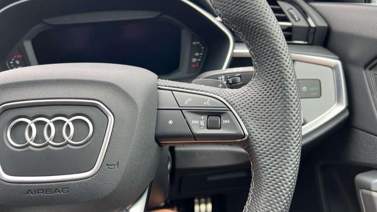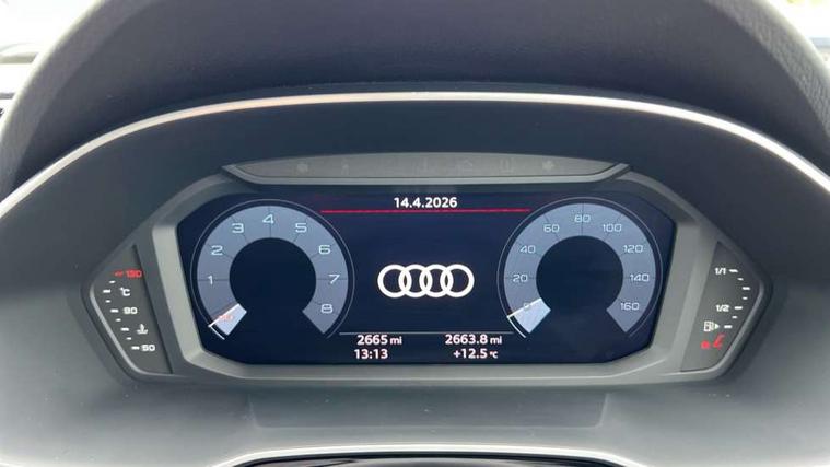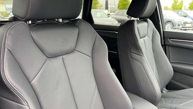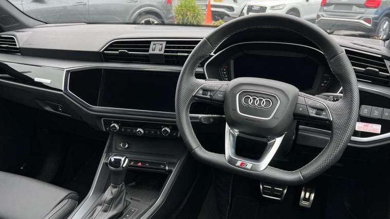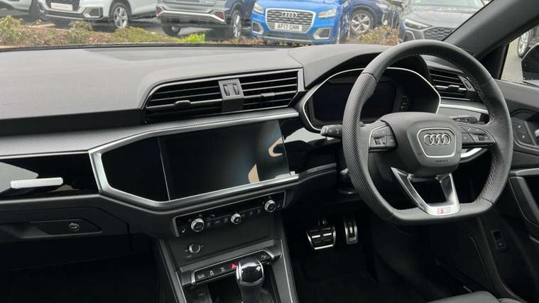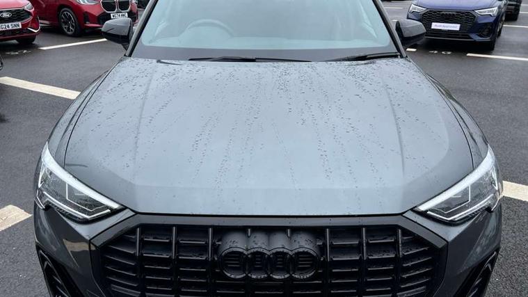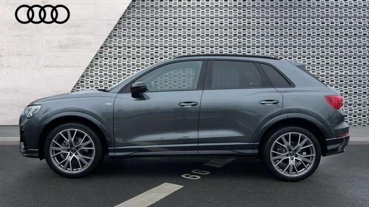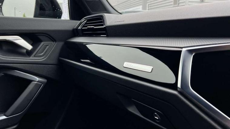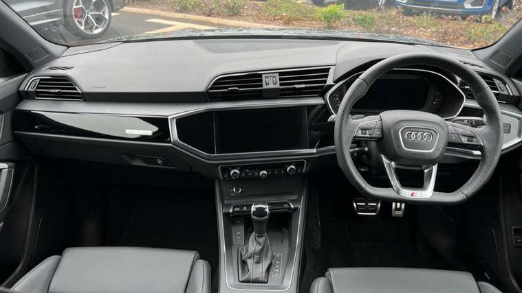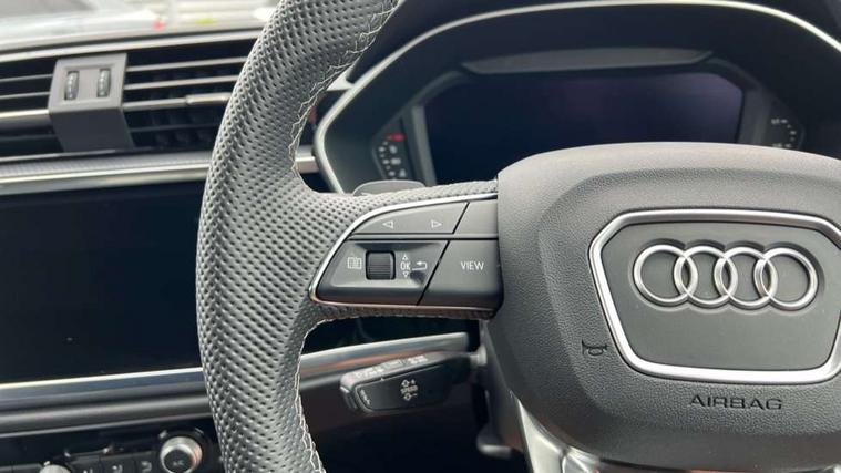 Amazon alexa Integration, Audi connect safety and service, Audi drive select, Audi lane departure warning, Audi Virtual Cockpit - 10.25" display, Bluetooth interface, Camera based traffic sign recognition, Distraction and Fatigue warning, Legal emergency call, MMI Navigation Plus with high resolution 10.1 inch touchscreen colour display, Power operated tailgate, Progressive steering, Service interval indicator, Smartphone interface includes wireless Apple carplay/Android Auto, Start stop system with recuperation, Voice control system with natural language interaction, Sports suspension, 2 USB-C ports with charge and data functions, 6 passive loudspeakers, DAB digital radio module, Acoustic windscreen, Anthracite black radiator grille, Audi Beam uses LEDs to project the Audi logo onto the ground as you exit your Q3, Auto dimming door mirrors, Auto dimming frameless rear view mirror, Black roof rails, Electrically folding, adjustable and heated door mirrors with integrated LED side indicators and kerb view function for passenger side, Front and rear electric windows, Front fog lights, Grille vertical bars in aluminium silver/Matt, High gloss black finish B and C pillars, LED Dynamic rear indicators, LED headlights with LED daytime running lights, LED rear lights, LED third brake light, Privacy glass dark tinted rear and rear-side windows (from B-pillar backwards), Rain and light sensors, Rear diffuser grille in grained matt black, Rear diffuser strip in matt anthracite black, Rear side wing doors, Rear wiper, S line bumpers in contrasting Manhattan grey, Variable front intermittent wipers, 12V socket in rear centre console, 3 seat bench in 2nd row, 40:20:40 folding with manual adjustment for 60:40 forwards/backwards position and backrest angle, Adjustable rear seat bench/backrest with centre armrest and cupholder, Black carpet mats, Black cloth headlining, Dual zone electronic climate control, Electric lumbar support, Front and rear black floor mats with contrast stitching in rock grey, Front and rear headrests, Front centre armrest, Height and reach adjustable steering wheel, Illuminated door sill trims with S logo, ISOFIX child seat mounting for front passenger with airbag deactivation and outer rear seat including top tether attachment point for outer rear seats, Luggage compartment sill protection in stainless steel, Manual front seats with height adjustment, Perforated leather gearknob, Single front passenger seat, Stainless steel pedals, Twin leather upholstery with front sport seats + S embossing, Black styling pack - Q3, Non smoking pack - Q3, 3x3 point rear seatbelts, 6 airbags - Driver, front passenger, curtain and side windows, Audi pre-sense front with pedestrain and cyclist recognition, Electrically operated child locks on rear doors, Electromechanical parking brake, Electronic stabilisation control including ABS, ASR and EDL, Front seatbelt reminder, Hill descent control, Hill hold assist, Pre sense basic, Seatbelt monitoring, Tyre pressure warning, Warning triangle and first aid kit, Anti theft wheel bolts, Immobiliser, Remote central locking, Thatcham approved category 1 anti theft alarm, Aluminium look interior elements, Detail dashboard around MMI touch colour display in glass look, black with surround in aluminium look, Leatherette door armrest, Piano black inlay,