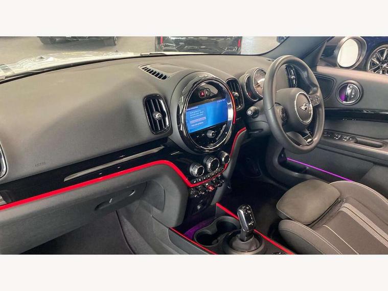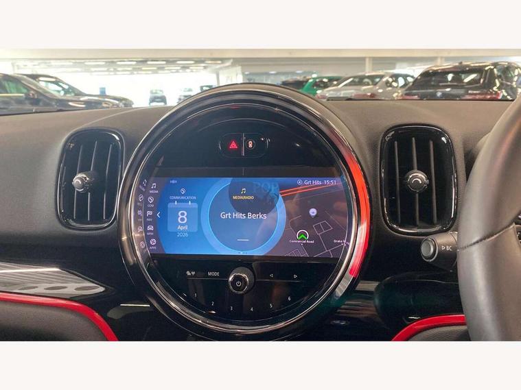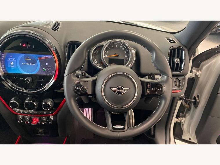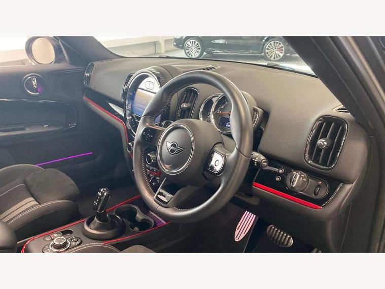 Active Guard incl speed limiting and lane departure functions with auto steering, and front collision warning with brake intervention, Automatic start/stop function with brake energy recuperation, Compatible mobile phone bluetooth with audio streaming, Cruise control with brake assist, Electro-mechanical speed dependant steering assistance, Instrument cluster, MINI Driving Modes - centre toggle switch to control driving setting (sport, mid and green), Mini E-call, On board computer, Rear parking distance control, 51 Litre fuel tank, Double Vanos system, Fully variable valve control, High precision injection, Performance Control, Steptronic sport transmission with double clutch and steering wheel paddles, FM tuner and DAB digital radio, 3rd brake light, Bonnet scoop, Chrome fuel filler cap, Day time driving lights, Dynamic brake lights, Electric windows, Heated rear window, Heated windscreen washer jets, John Cooper Works - aerodynamic kit (front and rear apron, spoiler), front and rear sport bumpers and part-painted side sills with door sill finishers, John Cooper Works Logo, LED fog lights, LED Headlights, Metal door sill strips with Cooper S imprint, Model logo, Model logo on Tailgate, Rain sensor with auto headlights, Rear fog lights, Rear side wing doors, Rear window wiper, Side scuttle panel with integrated indicator, Split rear doors, Sun/heat protection glass, White indicator lenses, 12V socket in centre console, 3 seat bench in 2nd row, 360L luggage compartment capacity, 4 lashing eyes in luggage compartment, 40:20:40 split folding rear seats, Anthracite headlining with grab handles and clothes hooks, Chrome interior highlights, Colour line - Carbon black, Cupholders, English handbook, Floor mats, Front headrests, Glove compartment, Height and length steering column adjustment, Interior lighting with 12 basic colours selectable via toggle switch in roof, Isofix rear child seat preparation, LED reading lights, vanity mirror lights, front foot well light and spotlight on front seats, Manual air conditioning, Mini John Cooper Works leather gearshift lever and handbrake gaiters, Multifunction steering wheel, Nappa leather steering wheel with MINI Yours logo, Rear headrests, Single front passenger seat, Stainless steel pedals and foot rest, Storage compartments in doors, Sunvisors with vanity mirrors, Excitement pack - Countryman, Navigation pack - Countryman, Piano black exterior pack - Countryman Cooper S/SD/SE/Boardwalk, 2 tone horn, 3 point seatbelts on all seats, 6 Airbags - front, side, head and seat belt tensioners, Anti-lock braking system (ABS), DSC - Dynamic Stability Control, Electronic handbrake, Front and rear disc brakes, Hill start assist, Manual rear child locks, Tyre pressure monitoring system, Alarm system with tilt sensor, monitoring doors, bonnet interior and tailgate, Auto drive away locking, Deadlocking function, Electronic vehicle immobiliser, Locking wheel bolts, Start/stop toggle with keyless go, Piano black JCW interior trim, Tool kit,