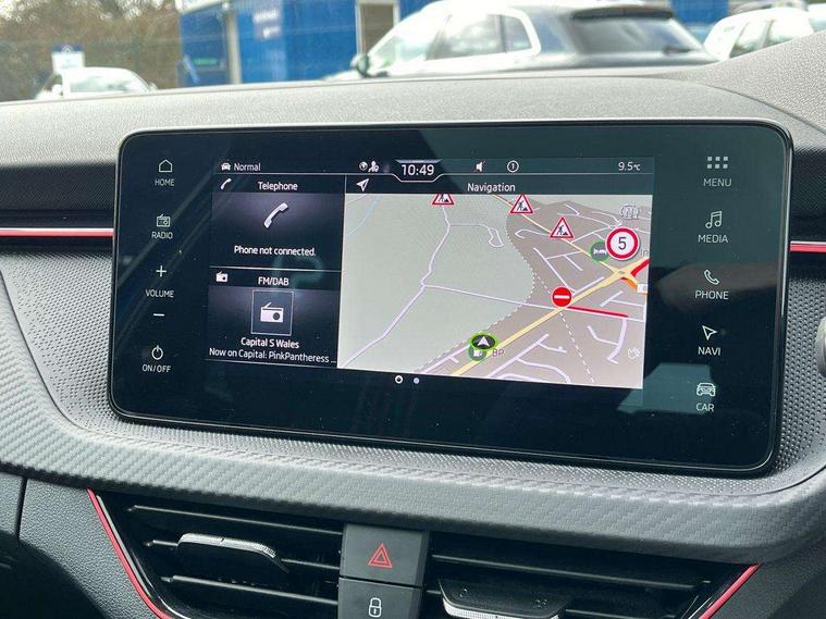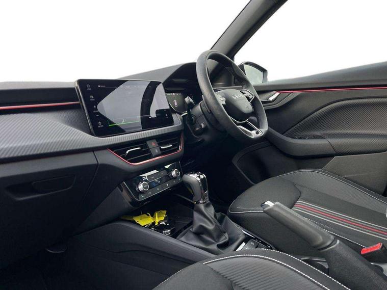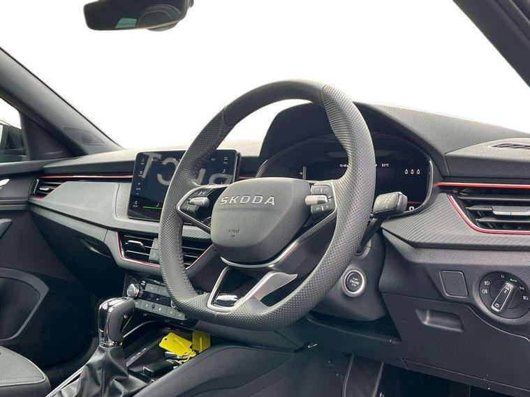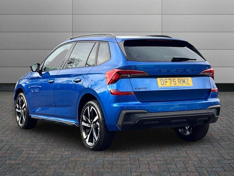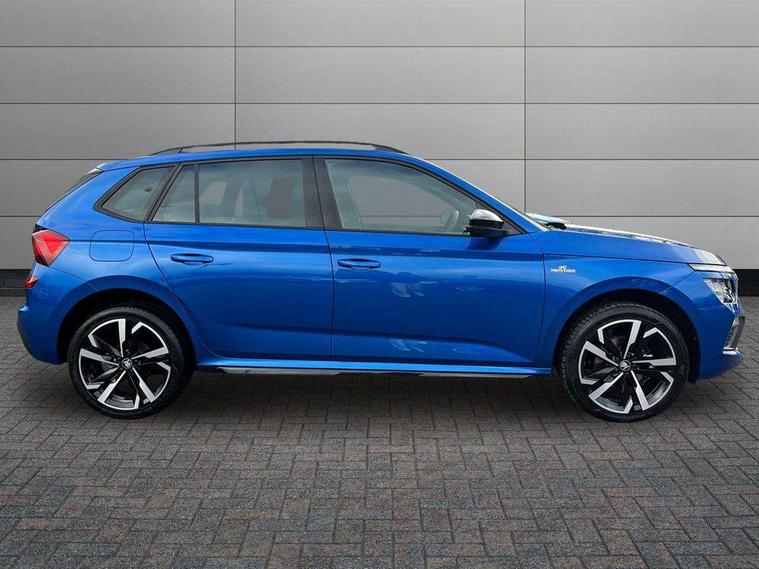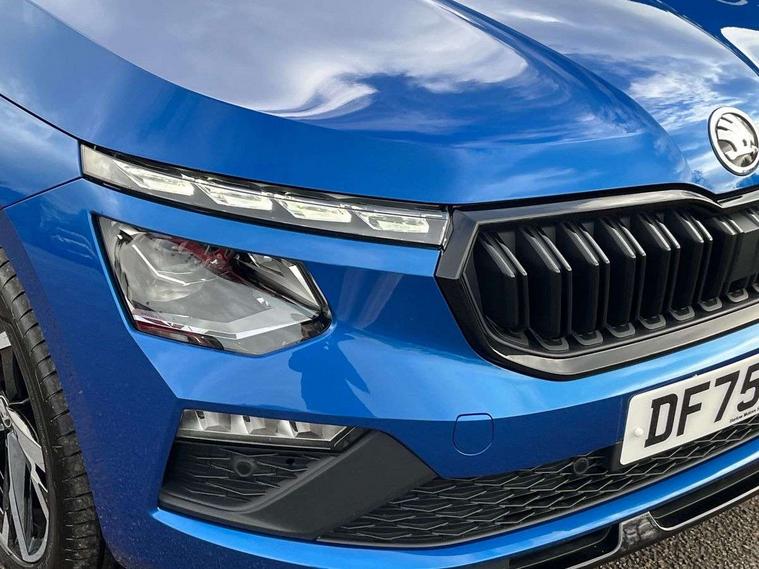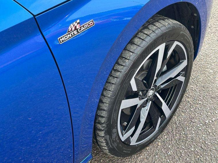 Advanced driver attention and drowsiness monitor, Bluetooth system, E-call, Front assist system, PAS, Rear parking sensors, Rear view camera, Service indicator, Speed limiter, Traffic sign recognition, Virtual cockpit with 10.25" display, Voice control system, Wireless smartlink, 4 USB C ports, 8 Speakers, 9.2" Skoda navigation display, DAB Digital radio, Auto dimming rear view mirror, Automatic headlight control with coming home and leaving home feature, Black door mirrors, Black radiator grille, Black rear diffuser, Black roof spoiler, Body colour bumpers, Body colour door handles, Boot lettering in black, Extended tailgate glass, Fixed panoramic sunroof with black roof rails, Front and rear electric windows, Heated rear window, LED daytime running lights, LED high beam, LED low beam, LED third brake light, Light sensors, Monte carlo plaque, Privacy glass, Rear side wing doors, Rear wiper, Ticket holder inside windscreen, 12V socket in luggage compartment, 3 seat bench in 2nd row, Aluminium pedals, Ambient lighting in white/red, Art leather carbon decor inserts, Art leather carbon door inserts, Black roof lining, Cargo elements, Chrome inner door handles, Driver and passenger sun visors with vanity mirror, Dual zone climate control, Front and rear roof lights, Front centre armrest, Front head restraints, Glove compartment with illumination, Height adjustable driver seat, Height adjustable front passenger seat, Ice scraper, Inner circulation control with pollen filter, ISOFIX on front passenger seat, Isofix preparation for back seats, Leather gearknob and handbrake lever, Manual lumbar support for front seats, Monte Carlo cloth upholstery, Net package and top tether hooks in boot space, Net under rear shelf, Pocket on the back of both front seats include mobile phone pockets, Rake/reach adjustable steering wheel, Reading lights, Rear centre armrests, Red hotstamping, Single front passenger seat, Sports seats, Textile floor mats, Third rear headrest, Top tether for front passenger seat, Umbrella in driver's door, Light and view plus package - Kamiq, 3x3 point rear seatbelts, Airbags - driver and front passenger, Disc brakes, ESP, Extended and predictive pedestrian/cyclist protection, Front passenger airbag deactivation switch, Front side airbags with curtain airbags, Hill hold control, Manual leather parking brake, Manual rear child locks, One tone horn, Seatbelt reminder for driver an co-driver, Traction control, Tyre pressure monitor, Anti-theft alarm system with interior monitoring, backup horn, towing protection and remote central locking with SAFE system, Anti-theft wheel bolts, Electronic engine immobilizer, 18" Ursa black diamond cut alloy wheels,
