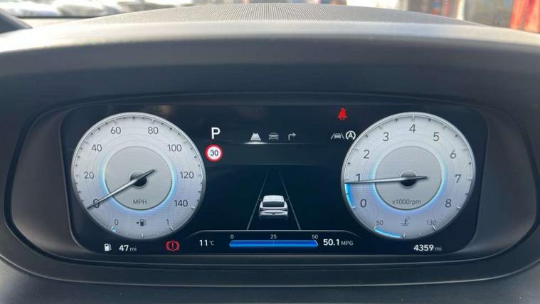10.25" touchscreen + navigation, 2nd Gen eCall, 8" Touchscreen DAB Radio with android auto and apple carplay, Forward collision assist with car, pedestrian and cycle detection, Front parking sensor, Intelligent speed assist, Intelligent speed limit warning, Lane follow assist, Lane keep assist, MAP OTA updates, PAS, Rear parking sensor, Rear view camera with dynamic guidelines, USB C port front, USB C Port in rear, Automatic headlights with dusk sensor, Electric adjustable heated door mirrors, Electric folding door mirrors, Front grille mesh pattern design, High beam assist, LED 3rd brake light, LED daytime running lights, LED Headlights, LED taillights, Privacy glass - Rear windows and tailgate, Rain sensor, Rear side wing doors, Rear wiper, Repositioned flat metal hyundai emblem, Trailer wiring, 3 seat bench in 2nd row, Adjustable head restraints, Automatic air conditioning, Cloth upholstery, Floor mats, Heated front seats, Heated steering wheel, Leather steering wheel, Multi colour ambient lighting, Single front passenger seat, 3x3 point rear seatbelts, ABS with front and rear diagonally split, Autonomous emergency braking, Child locks on rear doors, Front ventilated disc brakes, Rear solid disc brakes, Tyre pressure monitoring system, 17" Alloy wheels, Tyre repair kit,