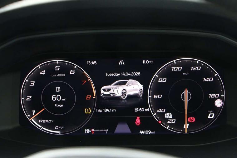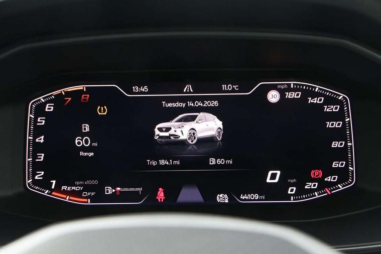 Digital cockpit and configurable dashboard, Driver alert system, Driving profile selection, E-call, Forward collision warning with automatic braking, Lane assist, Navigation system with 12'' Touchscreen Display, PAS, Predictive adaptive cruise control with speed limiter, Rear parking sensors, RPM, trip computer, outside temp gauge, instrument light brightness, low fuel warning light, lights on reminder, gearshift indicator, Service interval indicator, Start/stop system with regenerative braking, Voice control system, Wireless apple carplay, Wireless phone charger, Electronic locking differential and dynamic traction support, Standard suspension, 2 front and 2 rear USB type C sockets, Auxiliary input socket, DAB radio, Auto dimming rear view mirror, Body colour door handles, Body coloured bumpers, Dark grey wing mirror, Daytime running light with automatic headlight control and coming home feature, Dynamic headlight range control, Electric front/rear windows, Electrically adjustable, heated and folding door mirrors, Front fog lamps with cornering function, Gloss black roof rails and window surrounds, LED Headlights, LED Taillights with dynamic indicator, Rain sensing wipers, Rear diffuser with black simulated exhaust pipes, Rear side wing doors, Rear wash/wipe, Third brake light, Tinted rear windows, Welcome lights, 12v power supply in centre console, 12V socket, 12v socket in loadspace, 2 front and 2 rear reading lights, 230V socket, 3 seat bench in 2nd row, 60/40 split rear bench seat with armrest and mechanical seat release, Dust/pollen filter, Front and rear head restraints, Front centre armrest, Height/reach adjust steering wheel, Illuminated interior front door sills, Illuminated sunvisor with mirror, Interior ambient lighting, Isofix, Leather multi function steering wheel, Luggage tie-down hooks, Manually adjustable height and lumbar support for front seats, PVC/Cloth upholstery with copper stitching + Sport seats, Single front passenger seat, Three zone climate control with control panel in rear, Variable luggage/load compartment floor, Safety and driving pack (M) - Formentor, 3 point seatbelts on all rear seats, ABS, Brake control system - ESC and brake booster, Child proof door locks, Driver and front passenger airbags with front passenger airbag de-activation, Electronic parking brake, Front and rear disc brakes, Front side curtain airbags, Hill hold control, Seat belt reminder for front and rear seats, Tyre pressure monitoring system, Anti theft alarm system, Keyless entry and start system (KESSY), Locking wheel bolts, Copper and aluminium interior detailing,