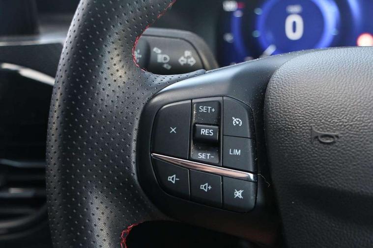 Driver impairment monitor, Ford easy fuel, Ford SYNC 3 with 8" colour touchscreen, App Link, andriod auto/apple carPlay and navigation with Ford pass connect, Front and rear parking sensors, Intelligent speed assist, Lane keeping aid with lane departure warning, Mobile phone wireless charging pad, Power assist steering, Selectable drive modes, Sports suspension, Auto dimming rear view mirror, Auto headlamps with high and low beam, Auto wipers, Black roof rails, Front LED fog lights with cornering function, Full LED headlamps, Large rear spoiler, LED daytime running lights, LED rear lights, Power folding heated door mirrors with puddle lights, Power front/rear windows with global close, Privacy glass, Quickclear heated windscreen, ST Line body styling kit with unique front and rear fascia and bumper, rear painted diffuser, front painted skid plates, dark mesh upper grille, ST Line front scuff plates, Twin exhausts, 2nd row sliding seats, 8 way manual passenger seat including lumbar support and height adjust, Alloy pedals, Ambient lighting, Centre console with electronic parking brake, Dark headlining and pillars, Dual electronic automatic temperature control, Flat bottomed leather steering wheel in sensico with red stitching, Front and rear head restraints, Rear charging point, Sensico partial premium leather upholstery, Sports seats, ST Line front and rear floor mats, Unique ST Line leather gear knob, B&O with large instrument cluster pack - Kuga, 3x3 point rear seatbelts, Airbags - front driver/passenger, front and rear curtain, Drivers knee airbag, Electronic stability control (ESC) and ABS, Ford MyKey Gen 2 safety system, Post collision braking, Powered child proof rear door locks, Pre collision assist with autonomous emergency braking, Red brake calipers, Tyre pressure monitoring system, Engine immobiliser, Keyless entry, Keyless start with 'Ford Power' starter button, Locking wheel nuts, Remote powered central double locking doors, Thatcham category 1 alarm, Tyre inflation kit,