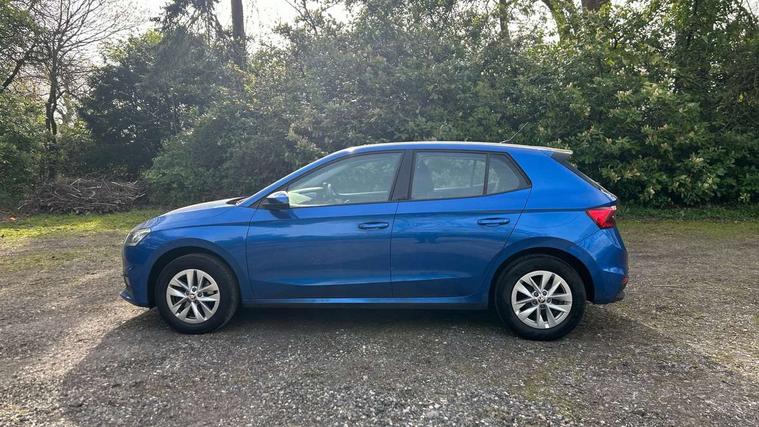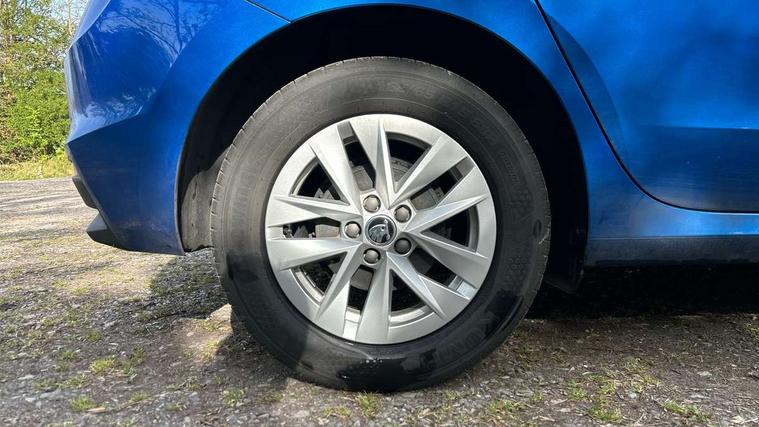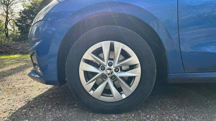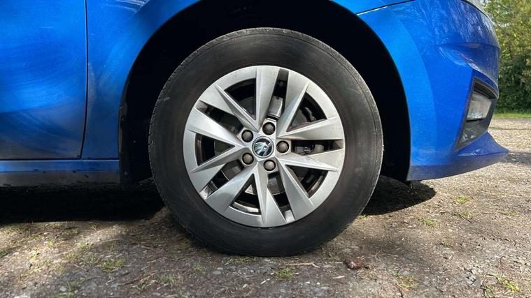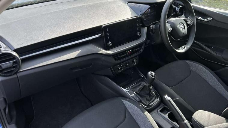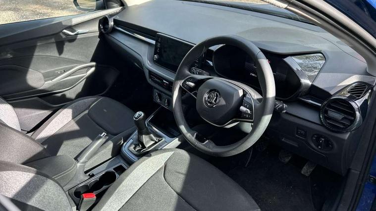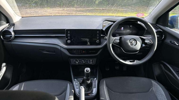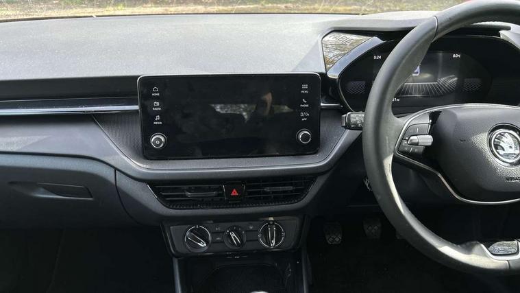 8" Digital instrument display, Advanced driver attention and drowsiness monitor, Bluetooth connection, Electromechanical power steering, Exterior temperature gauge, Lane assist including road edge detection, Rear parking sensors, Service interval indicator, Speed limiter, Traffic sign recognition, Wireless SmartLink for Apple CarPlay and Android Auto, 2x USB-C in the front (for data transmission and charging), 6 speakers (4 speakers/2 tweeters), 8.25" Skoda infotainment touchscreen display, Auxiliary socket for external MP3 player, DAB digital radio reception, Basic LED Headlights, Basic rear lights, Body colour door mirrors, Body coloured bumpers, Dimming rear view mirror with black frame, Door mirror integrated indicators, Electrically adjustable and heated door mirrors, Electrically adjustable front windows with function auto up/down, Front fog lights, Front window wiper intermittent control, Headlight range control - Automatic, Ice scraper in fuel cap, LED daytime running lights with coming and leaving home feature, Mechanical adjustable rear windows, Rain sensor, Rear LED fog light, Rear side wing doors, Rear window wiper with washing nozzles, Roof mounted spoiler, SKODA tailgate lettering in chrome, Third brake light, 2 reading lights in front and 2 reading lights in rear, 2 spoke leather multifunction steering wheel, 3 rear headrests, Backrest split and folding, Central console with removable cup holder and storage box, Chrome handbrake release button, Fabric upholstery, Front centre armrest, Gearshift knob/handle in leather, Grain satin black interior door handles, Hand brake lever handle in leather, Height adjustable driver seat, Height adjustable front headrests, Height adjustable steering wheel, ISOFIX and TopTether anchorage points to the outer rear seats, ISOFIX and TopTether on the front passenger seat, Luggage compartment lighting, Manual air conditioning, Pollen filter, Rear seat bench unsplit, Single front passenger seat, Storm grey headlining, Sun visors with mirror and airbag label on passenger side, Textile floor mats, Ticket holder, 3-point height adjustable front seats belts with pretensioner and force limiter, Automatic warning lights in case of crash, Driver and passengers airbag with switch off function, e-Call+, ESC including ABS, MSR, ASR, EDS, HBA and XDS, Front and rear seat belt warning, FRONT ASSIST (AEB City and AEB Inter Urban), Front side airbags, Head airbags, One tone horn, Pedestrian protection, Three rear 3-points safety seat belts with pretensioner and force limiter including stop function for outer rear seat belts, Tyre pressure monitoring system, Anti-theft alarm system including immobiliser, interior monitoring, backup horn, and towing protection, Central locking with radio remote control, interior controls, SAFE function and 2 foldable keys, Black painted air vents, Glossy black decorative trim, Grain satin black central console cover, Grain satin black lower decorative trim, Satin black door and side trim panel in front, Anti-theft wheel bolts protection, Super-low rolling resistance tyres,