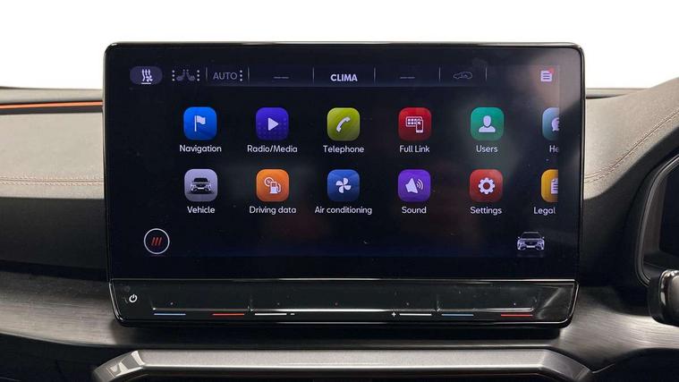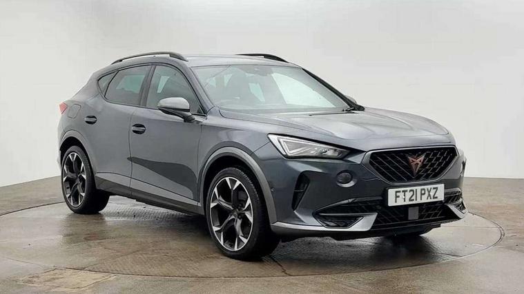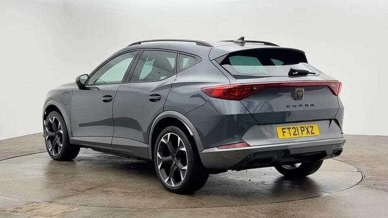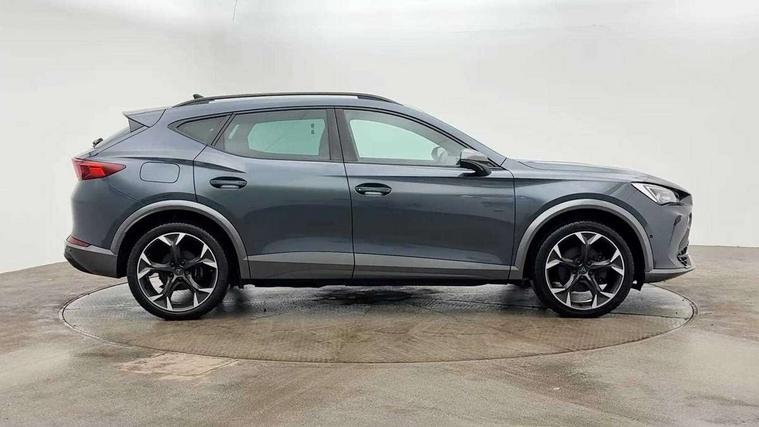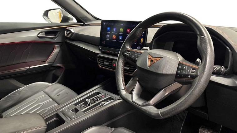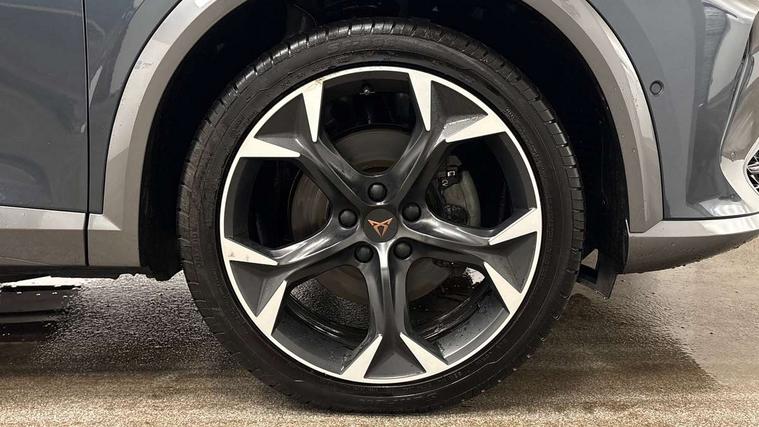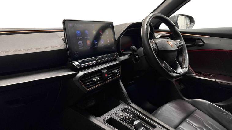Digital cockpit and configurable dashboard, Driver alert system, Driving profile selection, Forward collision warning with automatic braking, Lane assist, Park assist (inc front/rear parking sensors), PAS, Predictive adaptive cruise control with speed limiter, Rear view camera, RPM, trip computer, outside temp gauge, instrument light brightness, low fuel warning light, lights on reminder, gearshift indicator, Service interval indicator, Start/stop system with regenerative braking, Wireless apple carplay, Wireless phone charger, 10 amp mode 2 charging cable, 16 amp mode 3 charging cable, 3.6 kw On-board charger, Electronic locking differential and dynamic traction support, Standard suspension, 2 front and 2 rear USB type C sockets, 6 speakers, DAB radio, Auto dimming rear view mirror, Body colour door handles, Body coloured bumpers, Dark grey wing mirror, Daytime running light with automatic headlight control and coming home feature, Dynamic headlight range control, Electric front/rear windows, Electrically adjustable heated and folding door mirrors with memory function, Front fog lamps with cornering function, Gloss black roof rails and window surrounds, LED Headlights, LED Taillights with dynamic indicator, Rain sensing wipers, Rear diffuser with black simulated exhaust pipes, Rear wash/wipe, Tinted rear windows, Welcome lights, 12V socket, 2 front and 2 rear reading lights, 60/40 split rear bench seat with armrest and mechanical seat release, Dust/pollen filter, Front and rear head restraints, Front centre armrest, Height/reach adjust steering wheel, Illuminated interior front door sills, Illuminated sunvisor with mirror, Isofix, Leather multi function heated steering wheel with gear shift paddles, Three zone climate control with control panel in rear, Wraparound lighting, Genuine Nappa leather Pack - Cupra, Navigation system pack - Formentor, 3 point seatbelts on all rear seats, ABS, Brake control system - ESC and brake booster, Child proof door locks, Driver and front passenger airbags with front passenger airbag de-activation, Electronic parking brake, Front and rear disc brakes, Front side curtain airbags, Hill hold control, Seat belt reminder for front and rear seats, Tyre pressure monitoring system, Anti theft alarm system, Keyless entry and start system (KESSY), Locking wheel bolts, Copper and aluminium interior detailing, 19" 'Exclusive' machined sport matte black and silver alloy wheels, Tyre repair kit,