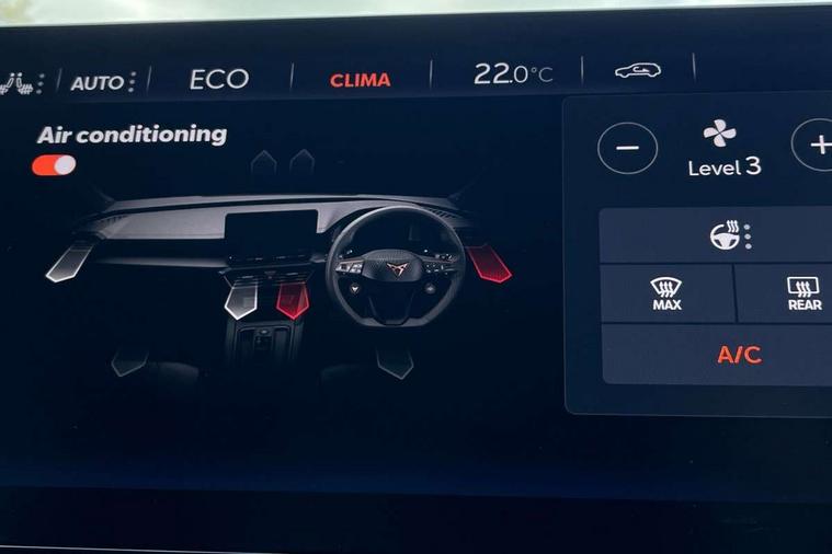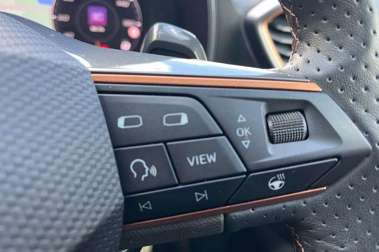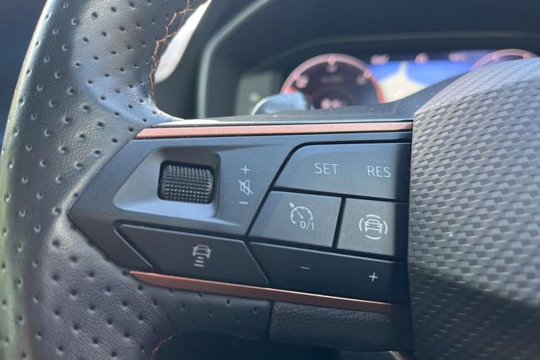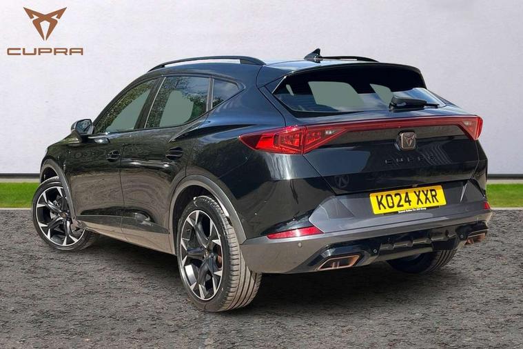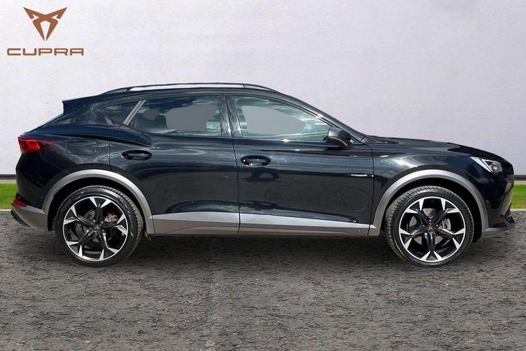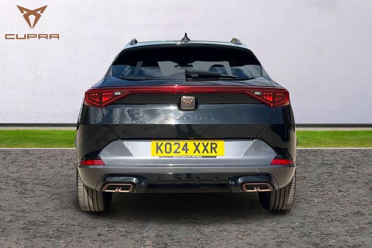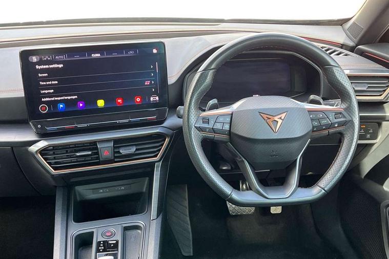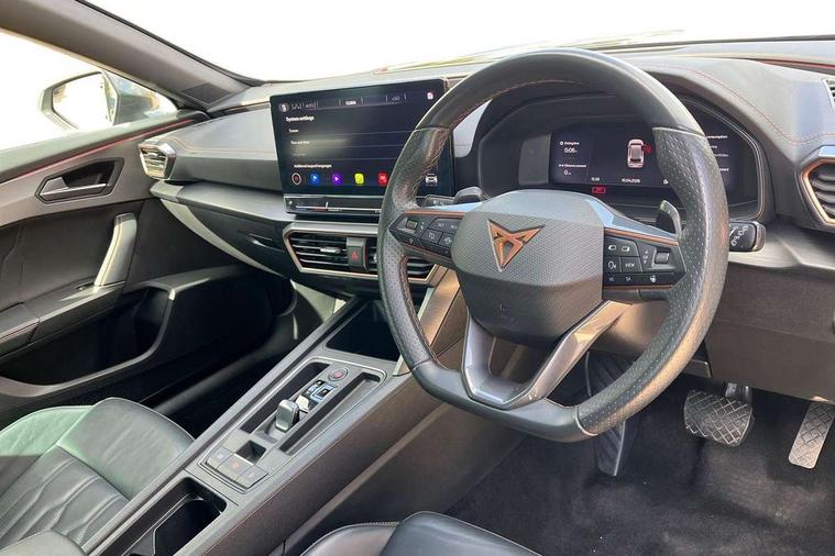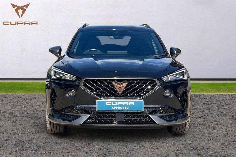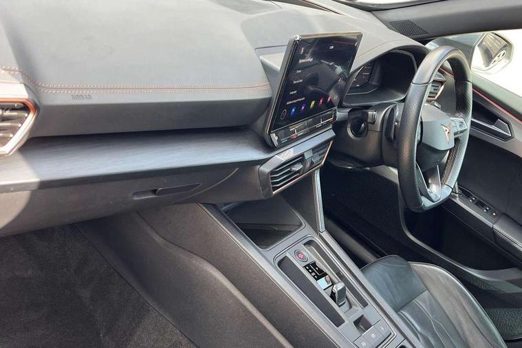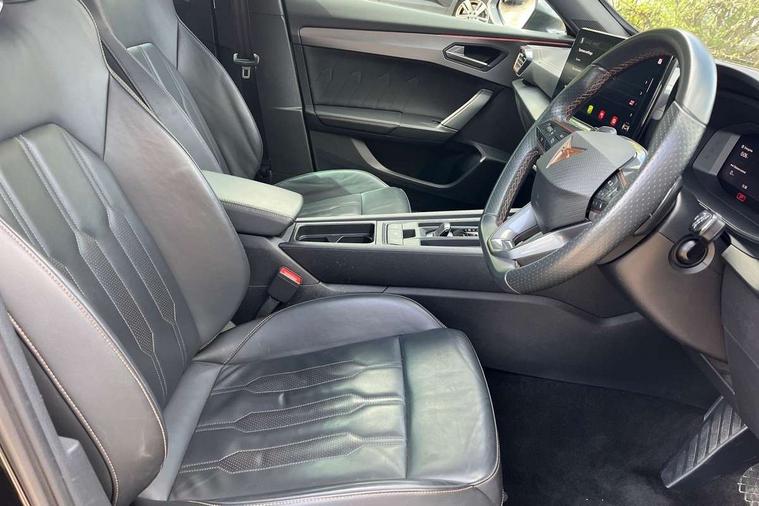 Digital cockpit and configurable dashboard, Driver alert system, Driving profile selection, Forward collision warning with automatic braking, Lane assist, Navigation system with 12'' Touchscreen Display, Park assist (inc front/rear parking sensors), PAS, Predictive adaptive cruise control with speed limiter, Rear view camera, RPM, trip computer, outside temp gauge, instrument light brightness, low fuel warning light, lights on reminder, gearshift indicator, Service interval indicator, Start/stop system with regenerative braking, Voice control system, Wired Android Auto, Wireless apple carplay, Wireless phone charger, 10 amp mode 2 charging cable, 16 amp mode 3 charging cable, 3.6 kw On-board charger, Electronic locking differential and dynamic traction support, Standard suspension, 2 front and 2 rear USB type C sockets, DAB radio, Auto dimming rear view mirror, Body colour door handles, Body coloured bumpers, Dark grey wing mirror, Daytime running light with automatic headlight control and coming home feature, Dynamic headlight range control, Electric front/rear windows, Electrically adjustable heated and folding door mirrors with memory function, Front fog lamps with cornering function, Gloss black roof rails and window surrounds, LED Headlights, LED Taillights with dynamic indicator, Rain sensing wipers, Rear diffuser with black simulated exhaust pipes, Rear side wing doors, Rear wash/wipe, Third brake light, Tinted rear windows, Welcome lights, 12V socket, 2 front and 2 rear reading lights, 3 seat bench in 2nd row, 60/40 split rear bench seat with armrest and mechanical seat release, Black headlining, Dust/pollen filter, Front and rear head restraints, Front centre armrest, Height/reach adjust steering wheel, Illuminated interior front door sills, Illuminated sunvisor with mirror, Isofix, Leather multi function heated steering wheel with gear shift paddles, Single front passenger seat, Three zone climate control with control panel in rear, Wraparound lighting, Genuine Nappa leather Pack - Cupra, 3 point seatbelts on all rear seats, ABS, Brake control system - ESC and brake booster, Child proof door locks, Driver and front passenger airbags with front passenger airbag de-activation, Electronic parking brake, Front and rear disc brakes, Front side curtain airbags, Hill hold control, Public e-call, Seat belt reminder for front and rear seats, Tyre pressure monitoring system, Anti theft alarm system, Keyless entry and start system (KESSY), Locking wheel bolts, Copper and aluminium interior detailing, 19" 'Exclusive' machined sport matte black and silver alloy wheels, Tyre repair kit,