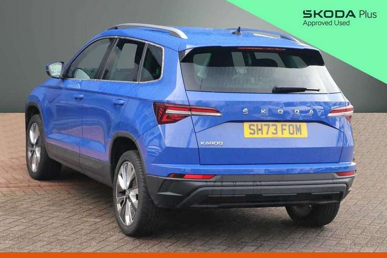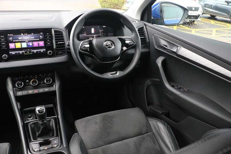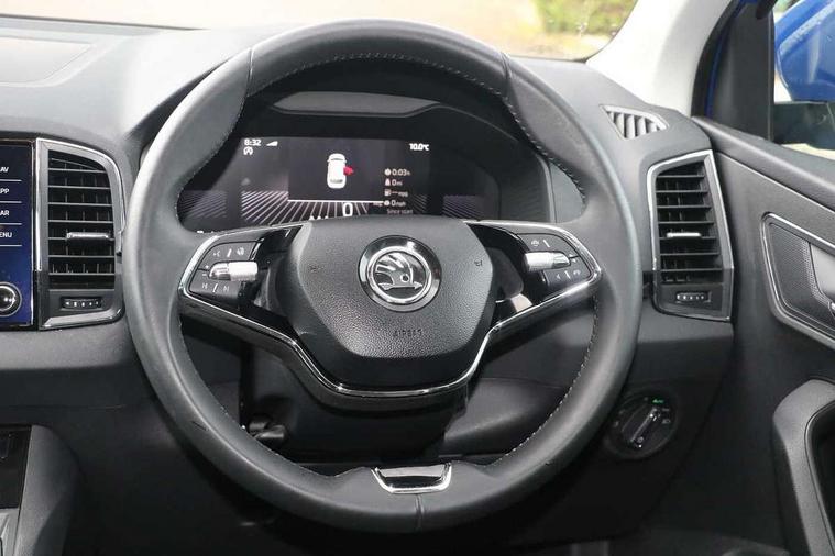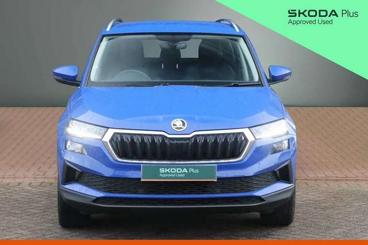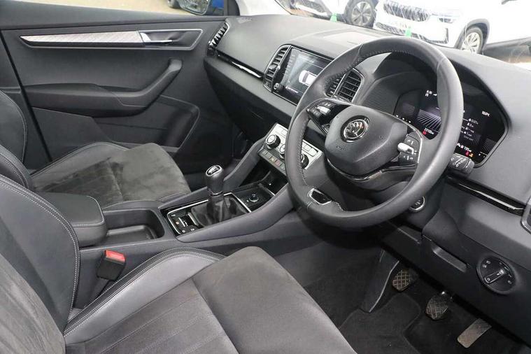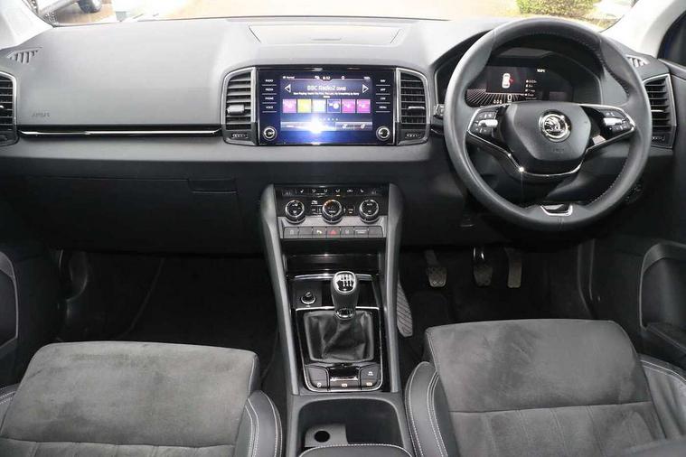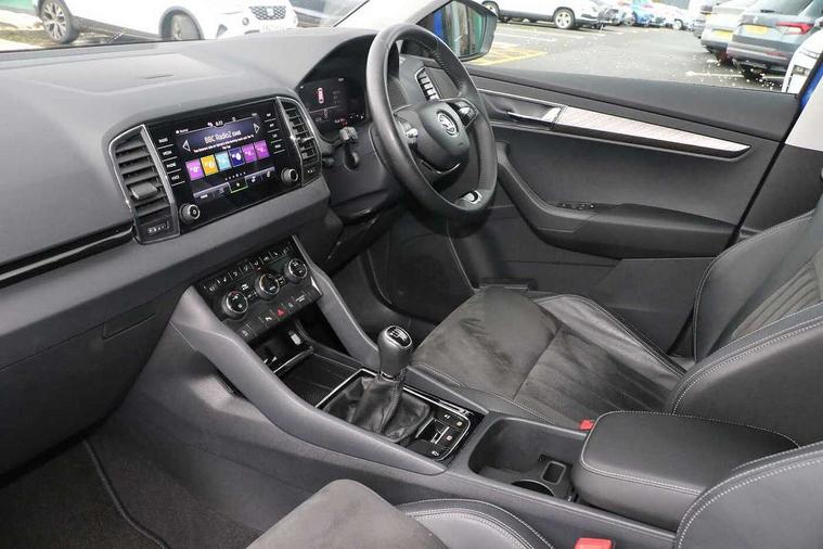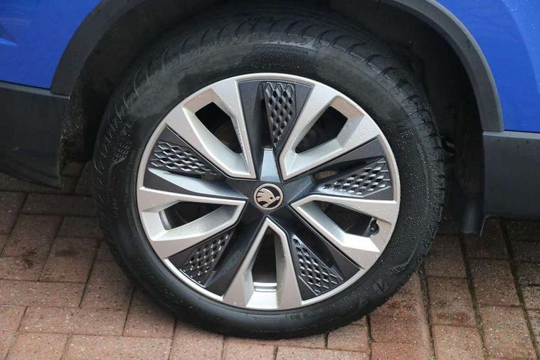 8" Digital display, Care connect, Drive mode selector, Driver fatigue sensor, Electro-mechanical PAS, Emergency services call system, Outside temperature gauge, Service interval indicator, SmartLink wireless for Apple and wired for Android, Start/stop system with regenerative braking, USB C Port x 2 in front centre console, Diesel particulate filter, 8 Speakers, DAB radio with Bluetooth, USB connection, Acoustic glass, Aero front windscreen wipers with intermittent function, Auto dimming rear view mirror with light and rain sensors, Black electric window control buttons, Body colour door mirrors and handles, Dynamic headlight range control with cornering light function, Electric front and rear windows with child proof lock, Heated rear windscreen, LED daytime running lights, LED rear lights with high functionality welcome effect and dynamic indicators, Light assistant (coming/leaving home/tunnel light), Plastic scuff plates, Privacy glass, Rear side wing doors, Rear spoiler, Rear window wiper with washer system and intermittent control, Safety reflectors on front doors, Third brake light, 1.5 litre bottle holders in driver and front passenger door panels, 12V socket in boot, 12v socket in front centre armrest with storage compartment and rear air vents, 2 spoke leather heated multifunction steering wheel, 2 x Tablet holder, 3 rear height adjustable headrests, 3 seat bench in 2nd row, 4 foldable roof handles with rear coat hooks, Black floor carpet, Chrome inner door handles, Decorative door sills with KAROQ badging, Double sided boot floor, Foldable hooks in the boot, Front head restraints, Height adjustable front three point seats belts with tensioners, Height/reach adjust steering wheel, Ice scraper, Illuminated glovebox, Illuminated luggage compartment, Interior noise suppression, Isofix child seat preparation for front passenger seat, Isofix child seat preparation outer rear, Manual lumbar support for front seats, Pen holder, Pollen filter, Rear boot cover, Rear reading lights, Rubbish bin door, Safety vest holder, Single front passenger seat, Storage box in upper central dashboard closed, Sunvisors with illuminated vanity mirrors, Textile floor mats, Ticket holder, VarioFlex seats with standard rear seat release, Boot pack - Karoq, Chrome roof rails + chrome pack - Karoq, Parking pack - Karoq, Automatic door unlocking in case of crash, Automatic fuel cut off in case of crash, Child locks on rear doors, Driver airbag, Electronic parking brake with auto hold function, Emergency rear braking signal, ESC including ABS, MSR, ASR, EDS, HBA, DSR, RBS, MKB and traction control, Front side airbags, Hill hold control, Knee airbags, Passenger airbag with switch-off function, Pedestrian monitor, Seatbelt reminder signalisation and pretensioner for all seats, Three point seatbelts rear, Two tone horn, Tyre pressure display, Tyre pressure monitor, Alarm with interior monitoring, back up horn and tilt sensor with safe function, Electronic engine immobiliser, Keyless entry and start/stop, Remote central locking with 2 remote folding keys, Chrome framed air vents, 18" Miran alloy wheels in black, Anti-theft wheel bolts protection, Storage on wheel cover, Tool kit,