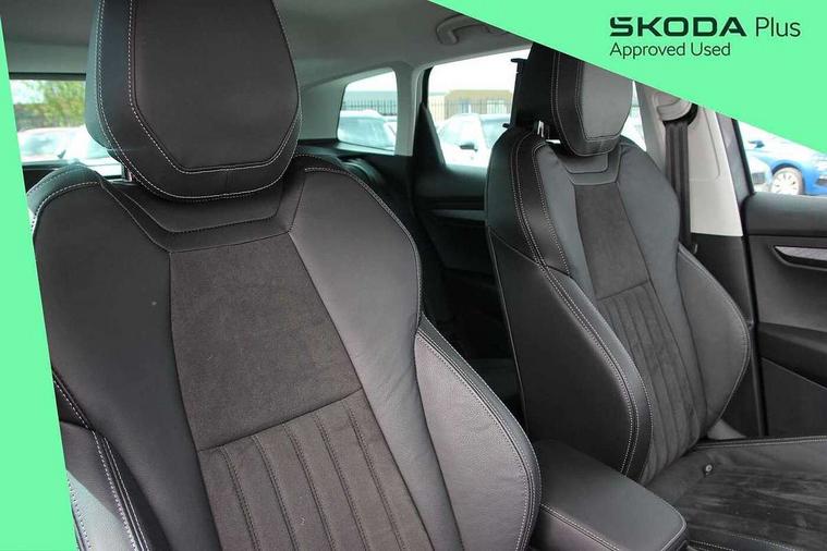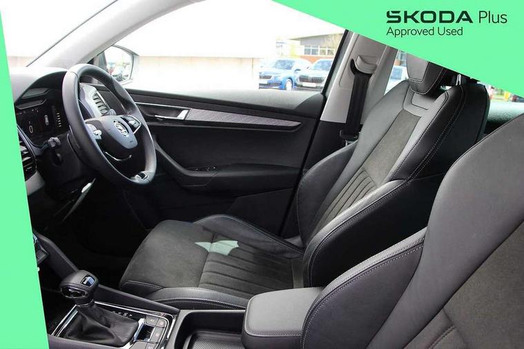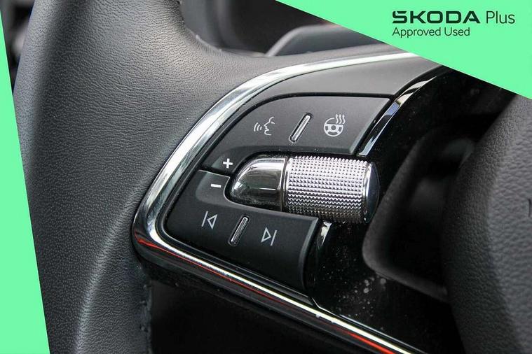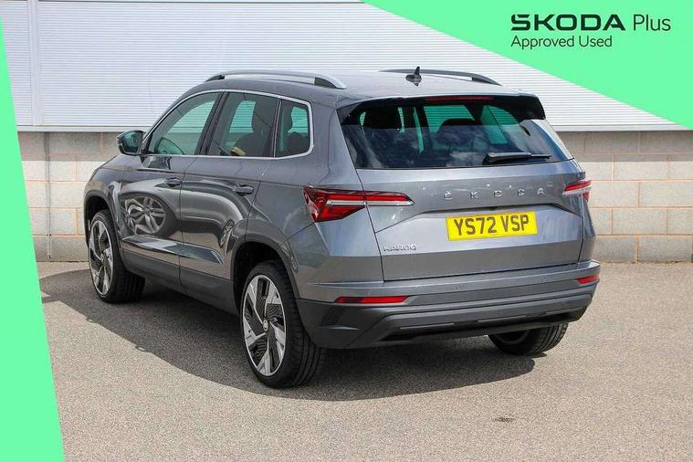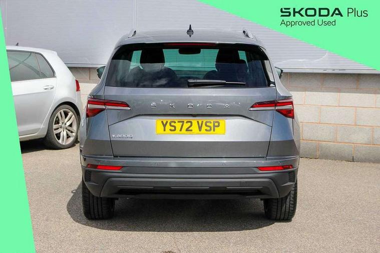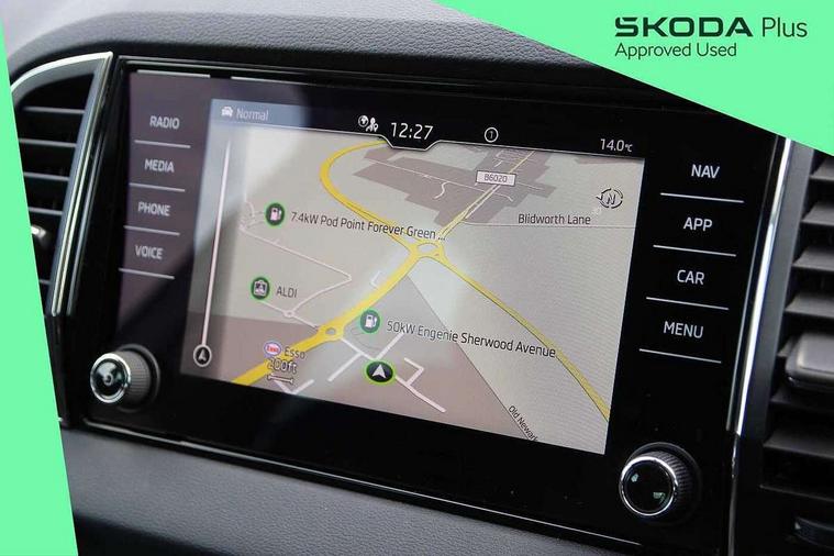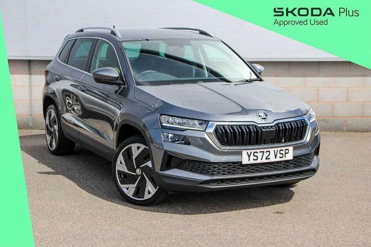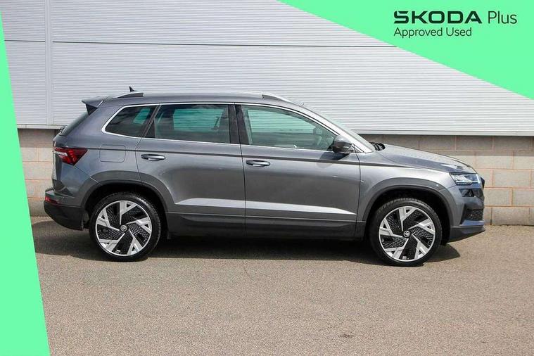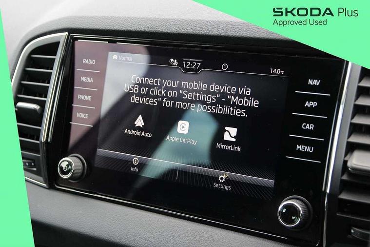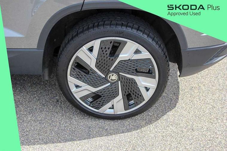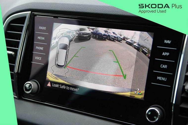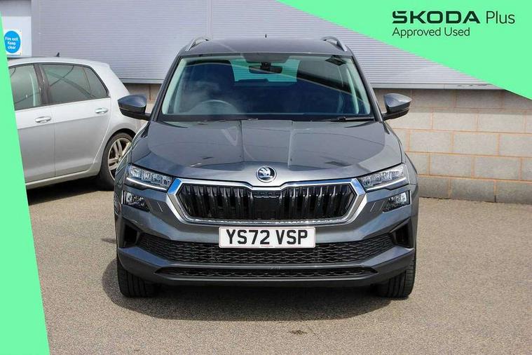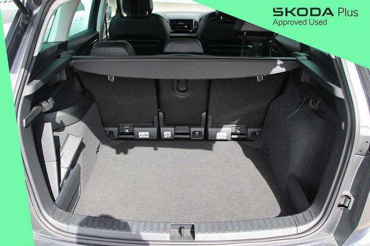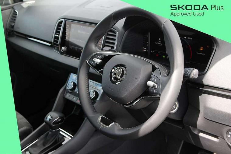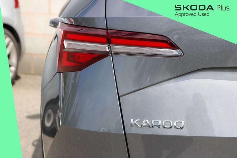 8" Digital display, Care connect, Driver fatigue sensor, Emergency services call system, Outside temperature gauge, Service interval indicator, SmartLink wireless for Apple and wired for Android, Start/stop system with regenerative braking, USB C Port x 2 in front centre console, 8 Speakers, DAB radio with Bluetooth, USB connection, Acoustic glass, Aero front windscreen wipers with intermittent function, Auto dimming rear view mirror with light and rain sensors, Black electric window control buttons, Body colour door mirrors and handles, Dynamic headlight range control with cornering light function, Electric front and rear windows with child proof lock, Heated rear windscreen, LED daytime running lights, LED rear lights with high functionality welcome effect and dynamic indicators, Light assistant (coming/leaving home/tunnel light), Plastic scuff plates, Privacy glass, Rear side wing doors, Rear spoiler, Rear window wiper with washer system and intermittent control, Safety reflectors on front doors, 1.5 litre bottle holders in driver and front passenger door panels, 12V socket in boot, 12v socket in front centre armrest with storage compartment and rear air vents, 2 Folding hooks and nets in boot, 2 spoke leather heated multifunction steering wheel with DSG paddles, 2 x Tablet holder, 3 rear height adjustable headrests, 3 seat bench in 2nd row, 4 foldable roof handles with rear coat hooks, Black floor carpet, Chrome inner door handles, Decorative door sills with KAROQ badging, Double sided boot floor, Foldable hooks in the boot, Front head restraints, Height adjustable front three point seats belts with tensioners, Height/reach adjust steering wheel, Ice scraper, Illuminated glovebox, Illuminated luggage compartment, Isofix child seat preparation for front passenger seat, Isofix child seat preparation outer rear, Manual lumbar support for front seats, Pen holder, Pollen filter, Rear boot cover, Rear reading lights, Rubbish bin door, Safety vest holder, Single front passenger seat, Storage box in upper central dashboard closed, Sunvisors with illuminated vanity mirrors, Textile floor mats, Ticket holder, VarioFlex seats with standard rear seat release, Chrome roof rails + chrome pack - Karoq, Parking pack - Karoq, Automatic door unlocking in case of crash, Automatic fuel cut off in case of crash, Child locks on rear doors, Driver airbag, Electronic parking brake with auto hold function, Emergency rear braking signal, ESC including ABS, MSR, ASR, EDS, HBA, DSR, RBS, MKB and traction control, Front side airbags, Hill hold control, Knee airbags, Passenger airbag with switch-off function, Pedestrian monitor, Seatbelt reminder signalisation and pretensioner for all seats, Three point seatbelts rear, Two tone horn, Tyre pressure display, Tyre pressure monitor, Alarm with interior monitoring, back up horn and tilt sensor with safe function, Electronic engine immobiliser, Keyless entry and start/stop, Remote central locking with 2 remote folding keys, Chrome framed air vents, Anti-theft wheel bolts protection, Storage on wheel cover, Tool kit,