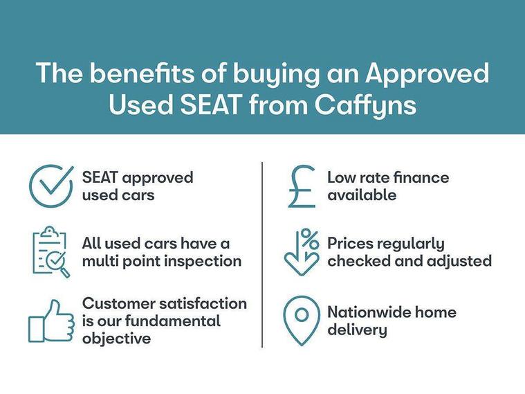 'Lights On' Reminder warning buzzer, 10" Digital cockpit, Digital clock, E-call, Electric speed sensitive power steering, Front parking sensor, Full Link Smartphone Integration with Mirror Link, Apple Car Play, Google Android Auto with USB Type C cable for Apple and Android compatibility, Low fuel warning light, Outside temperature display, Park assist system, Rear parking sensor, Rear view camera, RPM counter, Seat connect with safety, service, remote and online, Trip computer, Wireless phone charger, 9.2" colour touchscreen with navigation system, voice control and USB port (type c), Bluetooth interface for hands free and audio streaming, DAB digital radio and AM/FM radio, Steering wheel mounted audio controls, Anti theft roof antenna, Auto dimming interior rear view mirror, Automatic activation of hazard warning lights, Body coloured bumpers, Body coloured door handle inserts, Chrome roof rails and window surrounds, Electric front/rear windows, Electrically adjustable, heated and folding door mirrors, Front fog lights with cornering function and rear fog light, FULL LED automatic headlights with dynamic headlight range control, coming and leaving home, LED daytime running lights, Hidden exhaust pipe, LED rear tail lights and licence plate lights, Protective side mouldings, Rain sensing wipers, Rear side wing doors, Rear spoiler, Rear window wash/wipe, Roof colour door mirrors, Third brake light, Visible VIN plate, Windshield wiper with intermittent control and potentiometer, 2 cupholders, 3 seat bench in 2nd row, 60/40 split folding rear seat, Aircare filter, Black interior roof, Double boot floor, Driver sunvisor with covered mirror + card holder, Dual zone climate control, Flat bottomed leather steering wheel/gear knob/handbrake, Front comfort seats, Front courtesy light with front reading lights, Front seat back storage pockets, Gear shift indicator, Heated front seats, Height adjustable front seats, Height/reach adjustable steering column, Illuminated boot, Instrument lighting with brightness control, Interior ambient lighting, Interior light in footwell, central console and door panel, ISOFIX points in outer rear seats with top tether anchorage points, Leather steering wheel/gear knob/handbrake, Microsuede cloth upholstery, Passenger sunvisor with vanity mirror, Single front passenger seat, Storage net on centre console, Two front and three rear height adjustable headrests, Interior chrome pack - Arona, Storage pack - Arona, 3 point seatbelts on all rear seats, ABS, Active front headrests, Child locks on rear doors, Driver and front passenger airbags with front passenger airbag de activation, front side and curtain airbags, Electronic stability control, Emergency Brake Assist (EBA) and front assist, Front and rear seatbelt reminder, Hill hold control, Multi-Collision braking, Tiredness recognition system, Traction control, Tyre pressure monitoring system, Alarm with back-up horn, Electronic engine immobiliser, KESSY Keyless entry and go, Locking wheel bolts, Remote central locking + deadlocks, Tow away protection, Titan black dashboard, 18" Performance Nuclear grey alloy wheels,