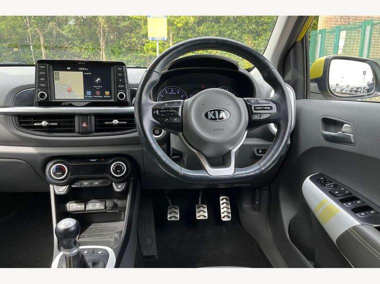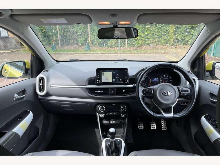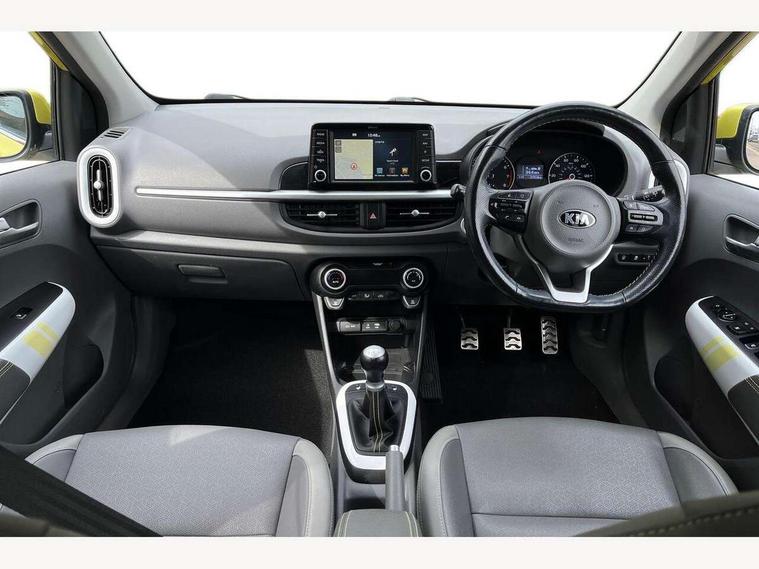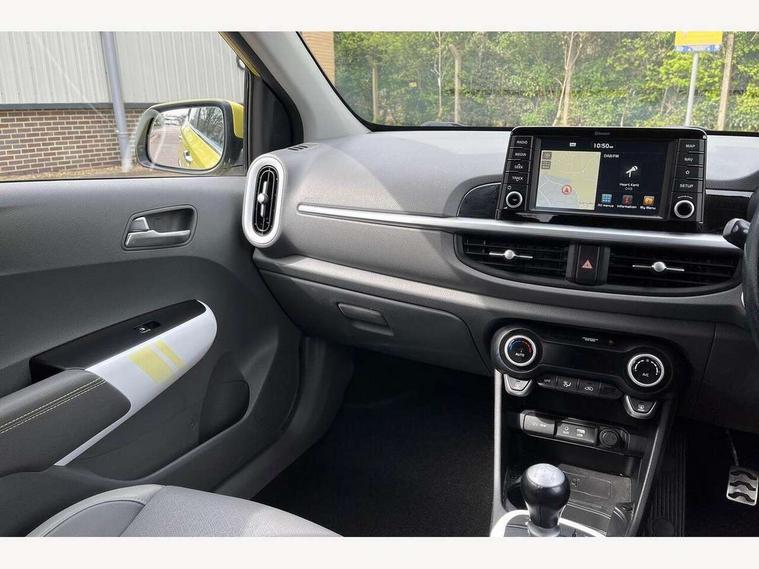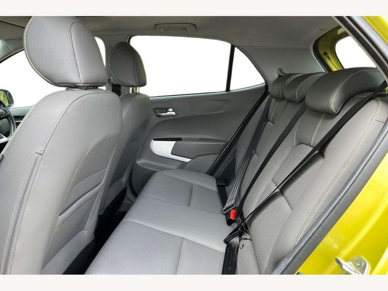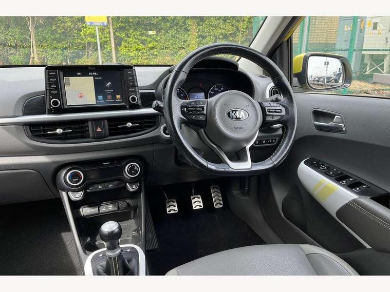 7" touch screen, Apple car play/Android Auto, Cruise control + speed limiter, Digital clock, Emergency stop signalling system, External temperature gauge, Kia connected services, PAS, Rear parking sensors, Reversing camera, Satellite navigation system, Tachometer, Trip computer, Voice control system, Wireless Smartphone charger, 6 speakers, Bluetooth connectivity including audio streaming, DAB Digital radio, Steering wheel mounted controls, USB and auxiliary socket, Automatic headlights, Black bodyside mouldings, Black grille with chrome surround, Black wheel arch cladding, Body colour bumpers, Body colour door mirrors, Chrome door handles, Chrome side window trim, Day/night rear view mirror, Electric adjustable/heated/folding door mirrors, Electric sunroof, Front and rear electric windows, Front fog lights, Headlamp levelling, Heated rear window, LED daytime running lights, LED rear lights, Privacy glass, Projector headlamps, Rear wash/wipe, Silver skid plates, Twin exhaust pipes, Variable front intermittent wipers, Welcome home function, 12V power point front, 60/40 split/folding 2nd row of seats, Assist grips, Automatic air conditioning, Centre console storage and sliding armrest, Coat hooks, Cupholders in centre console, Driver seat height adjust, Driver sunvisor with illuminated mirror, Faux leather upholstery, Front interior light, Glovebox, Heated front seats, Heated steering wheel, Height adjustable front seat head restraints, Height adjustable rear seat head restraints (x2), Isofix child seat attachment, Leather steering wheel and gear knob, Load area light, Luggage net with hooks, Passenger front seat pockets, Passenger sunvisor with vanity mirror, Rear parcel shelf, Satin chrome interior door handles, Slide/reclining front seats, Stainless steel pedals, Tilt adjustable steering wheel, Variable height boot floor, Advanced Driver Assistance Pack - Picanto, 3x3 point rear seatbelts, ABS/EBD, Automatic unlocking of doors in case of impact, Curtain airbags, Dual front airbags, ESC + BAS + VSM + HAC, Front seatbelt pretensioners + load limiters, Front side airbags, Height adjustable front seatbelt anchors, Hill start assist, Passenger airbag deactivate switch, Rear child proof door locks, Seatbelt warning, Side impact protection, Traction control, Tyre pressure monitoring system, Anti theft alarm, Engine immobiliser, Keyless smart entry with push button start, Locking wheel nuts, Speed sensitive auto door locking, High gloss black centre fascia, 16" alloy wheels, Tyre repair kit,