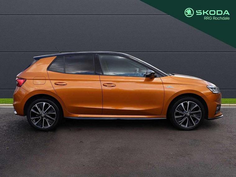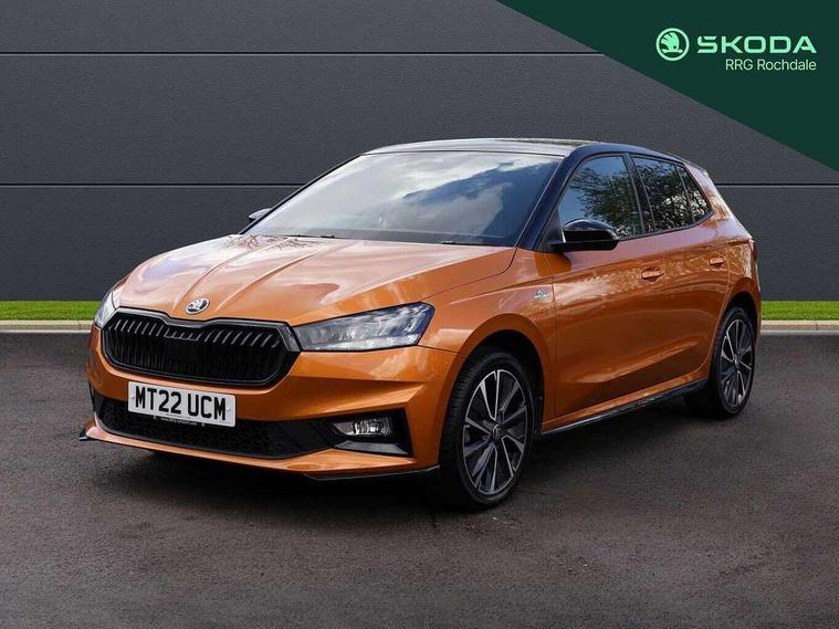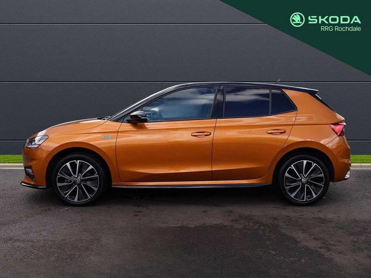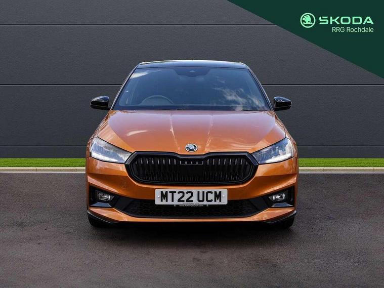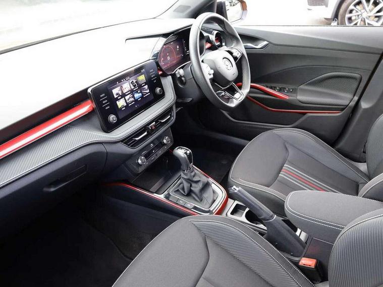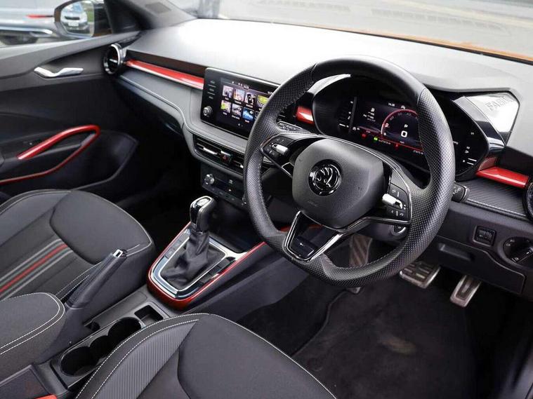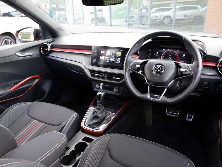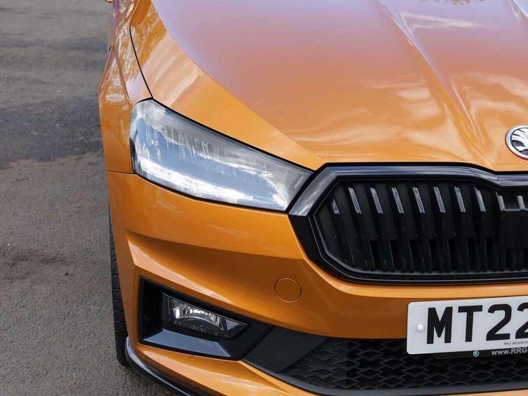 Bluetooth connection, Driver alert system - DAS, Electromechanical power steering, Exterior temperature gauge, Service interval indicator, 2x USB-C in the front (for data transmission and charging), 6 Speakers (4 in front and 2 in rear), Auxiliary socket for external MP3 player, Bolero radio with 8" colour display, DAB digital radio reception, Auto dimming rear view mirror, Basic rear lights, Black radiator grille, Body coloured bumpers, Door mirror integrated indicators, Electrically adjustable and heated door mirrors, Front and rear electric windows, Front window wiper intermittent control, Headlight range control - Automatic, Ice scraper in fuel cap, LED daytime running lights with coming and leaving home feature, Monte Carlo badging, Privacy glass, Rear LED fog light, Rear side wing doors, Rear window wiper with washing nozzles, Roof mounted spoiler, SKODA tailgate lettering in black, Sports bumpers, Third brake light, 3 rear headrests, Aluminium pedals, Backrest split and folding, Black headlining, Central console with removable cup holder and storage box, Chrome handbrake release button, Fabric/artificial leather upholstery, Front sports seats, Gearshift knob/handle in leather, Hand brake lever handle in leather, Height adjustable front headrests, Height adjustable steering wheel, ISOFIX and TopTether anchorage points to the outer rear seats, ISOFIX and TopTether on the front passenger seat, Luggage compartment lighting, Metallic painted red central console cover, Metallic red interior door handles, Monte Carlo door sills, Pollen filter, Rear seat bench unsplit, Single front passenger seat, Sun visors with mirror and airbag label on passenger side, Textile floor mats, Ticket holder, Umbrella in drivers door, Ambient lighting pack 2 - Fabia Hatchback, 3-point height adjustable front seats belts with pretensioner and force limiter, Automatic warning lights in case of crash, Driver and passengers airbag with switch off function, e-Call+, ESC including ABS, MSR, ASR, EDS, HBA and XDS, Front and rear seat belt warning, FRONT ASSIST (AEB City and AEB Inter Urban), Front side airbags, Head airbags, Hill hold assist, One tone horn, Pedestrian protection, Three rear 3-points safety seat belts with pretensioner and force limiter including stop function for outer rear seat belts, Tyre pressure monitoring system, Anti-theft alarm system including immobiliser, interior monitoring, backup horn, and towing protection, Carbon effect door and side trim panels, Carbon effect lower decorative trim with white stitching, Red metallic upper decorative trim, Anti-theft wheel bolts protection, Super-low rolling resistance tyres,