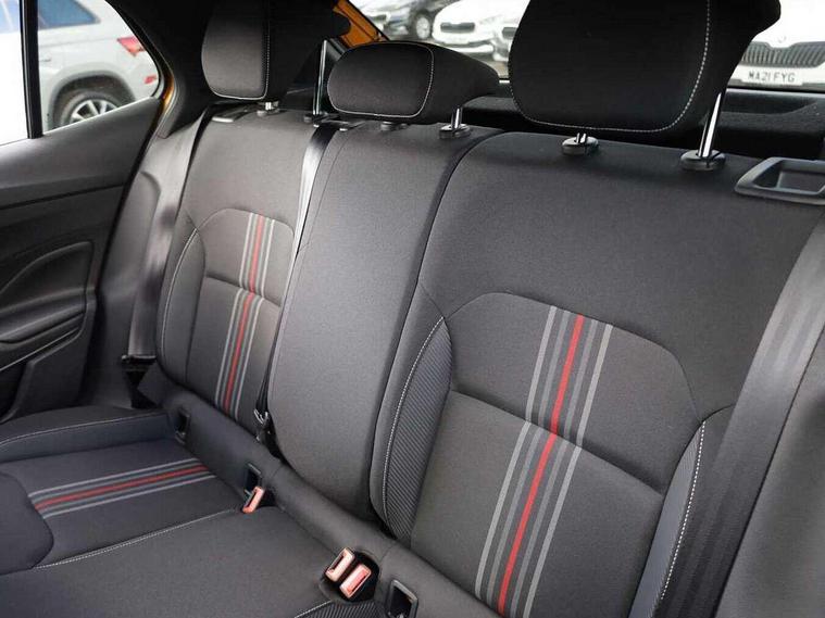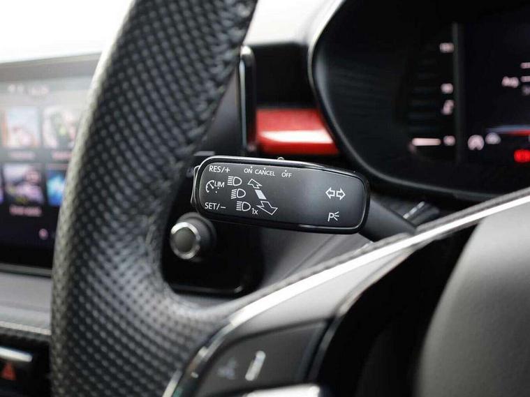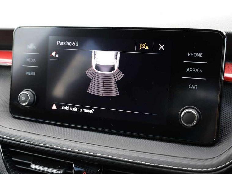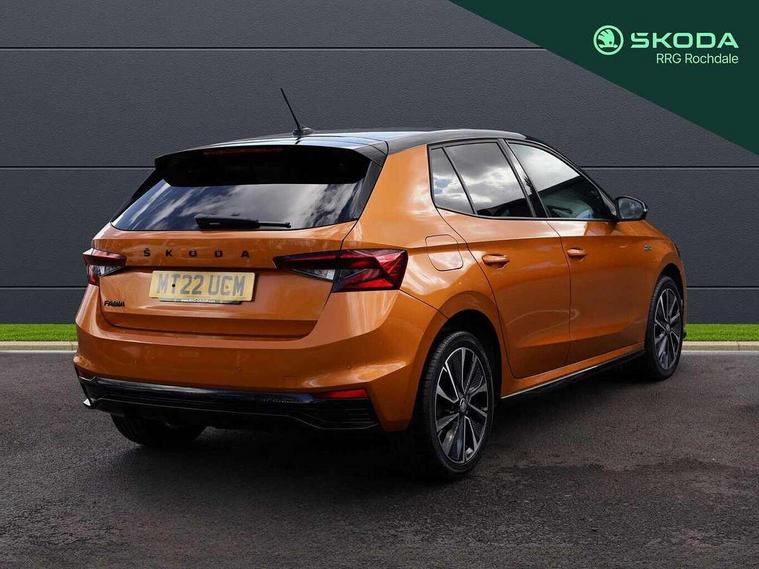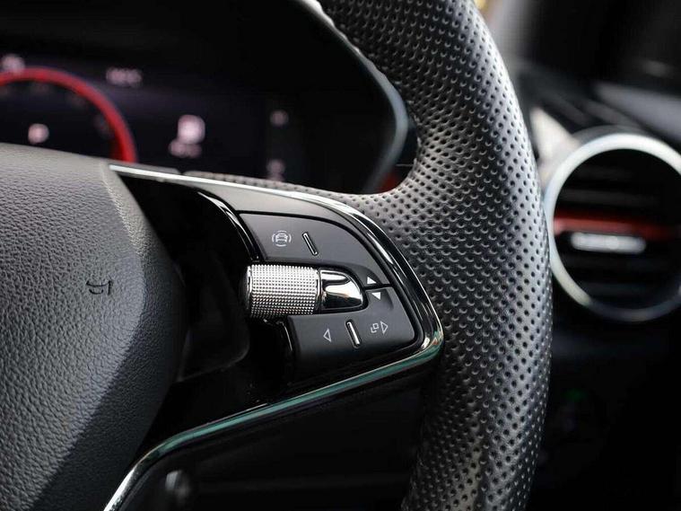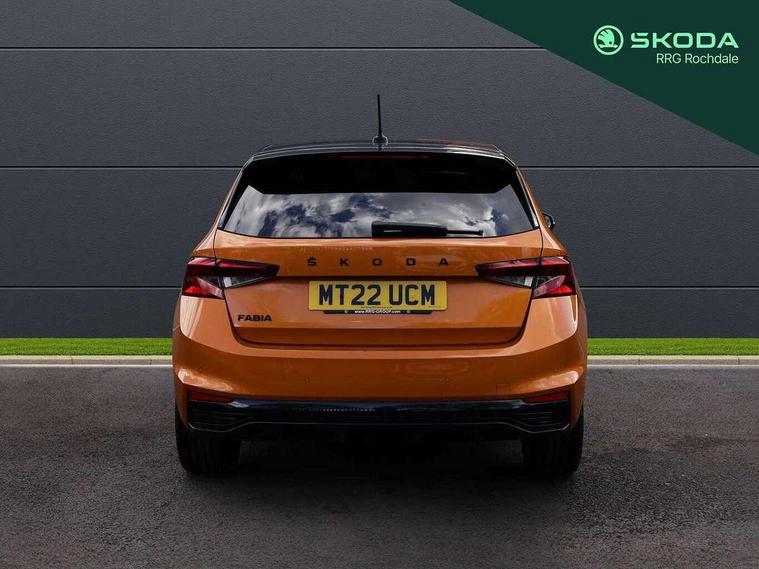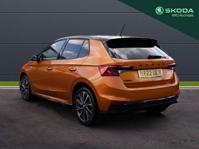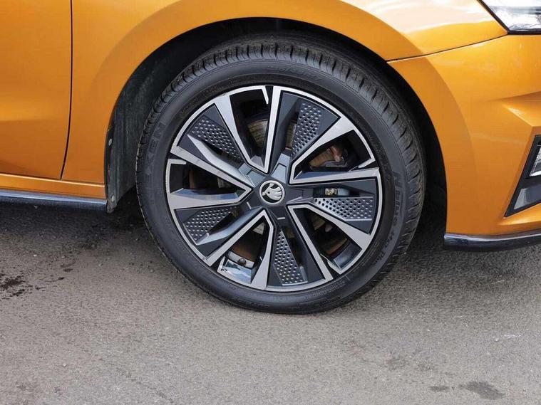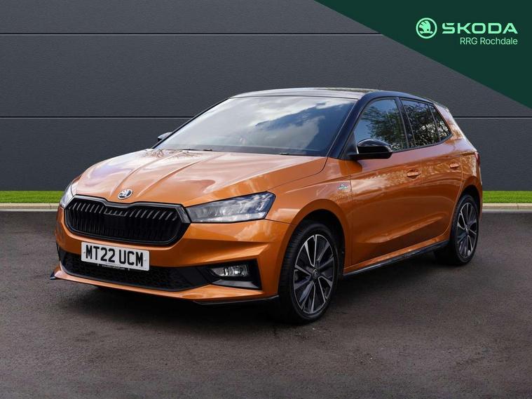 Bluetooth connection, Driver alert system - DAS, Electromechanical power steering, Exterior temperature gauge, Service interval indicator, 2x USB-C in the front (for data transmission and charging), 6 Speakers (4 in front and 2 in rear), Auxiliary socket for external MP3 player, Bolero radio with 8" colour display, DAB digital radio reception, Auto dimming rear view mirror, Basic rear lights, Black radiator grille, Body coloured bumpers, Door mirror integrated indicators, Electrically adjustable and heated door mirrors, Front and rear electric windows, Front window wiper intermittent control, Headlight range control - Automatic, Ice scraper in fuel cap, LED daytime running lights with coming and leaving home feature, Monte Carlo badging, Privacy glass, Rear LED fog light, Rear side wing doors, Rear window wiper with washing nozzles, Roof mounted spoiler, SKODA tailgate lettering in black, Sports bumpers, Third brake light, 3 rear headrests, Aluminium pedals, Backrest split and folding, Black headlining, Central console with removable cup holder and storage box, Chrome handbrake release button, Fabric/artificial leather upholstery, Front sports seats, Gearshift knob/handle in leather, Hand brake lever handle in leather, Height adjustable front headrests, Height adjustable steering wheel, ISOFIX and TopTether anchorage points to the outer rear seats, ISOFIX and TopTether on the front passenger seat, Luggage compartment lighting, Metallic painted red central console cover, Metallic red interior door handles, Monte Carlo door sills, Pollen filter, Rear seat bench unsplit, Single front passenger seat, Sun visors with mirror and airbag label on passenger side, Textile floor mats, Ticket holder, Umbrella in drivers door, Ambient lighting pack 2 - Fabia Hatchback, 3-point height adjustable front seats belts with pretensioner and force limiter, Automatic warning lights in case of crash, Driver and passengers airbag with switch off function, e-Call+, ESC including ABS, MSR, ASR, EDS, HBA and XDS, Front and rear seat belt warning, FRONT ASSIST (AEB City and AEB Inter Urban), Front side airbags, Head airbags, Hill hold assist, One tone horn, Pedestrian protection, Three rear 3-points safety seat belts with pretensioner and force limiter including stop function for outer rear seat belts, Tyre pressure monitoring system, Anti-theft alarm system including immobiliser, interior monitoring, backup horn, and towing protection, Carbon effect door and side trim panels, Carbon effect lower decorative trim with white stitching, Red metallic upper decorative trim, Anti-theft wheel bolts protection, Super-low rolling resistance tyres,