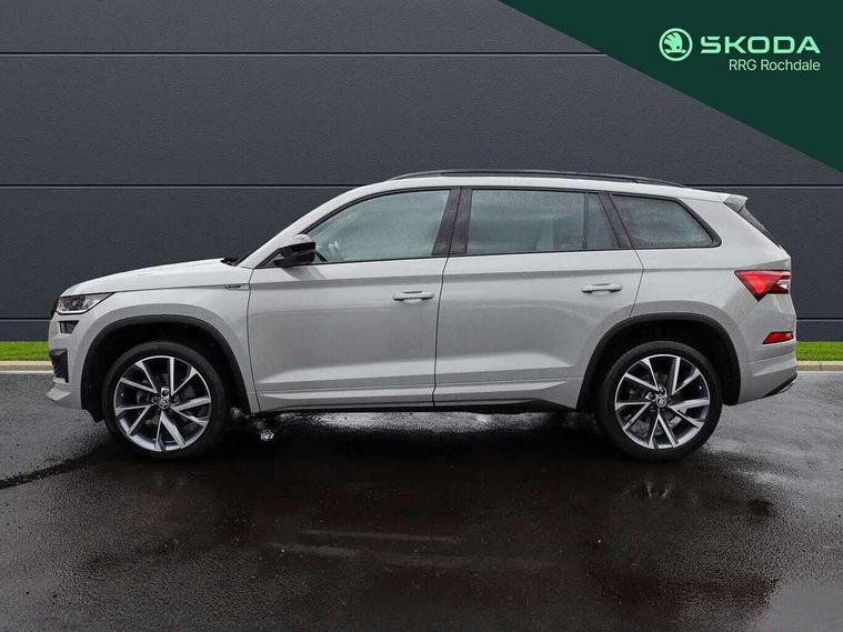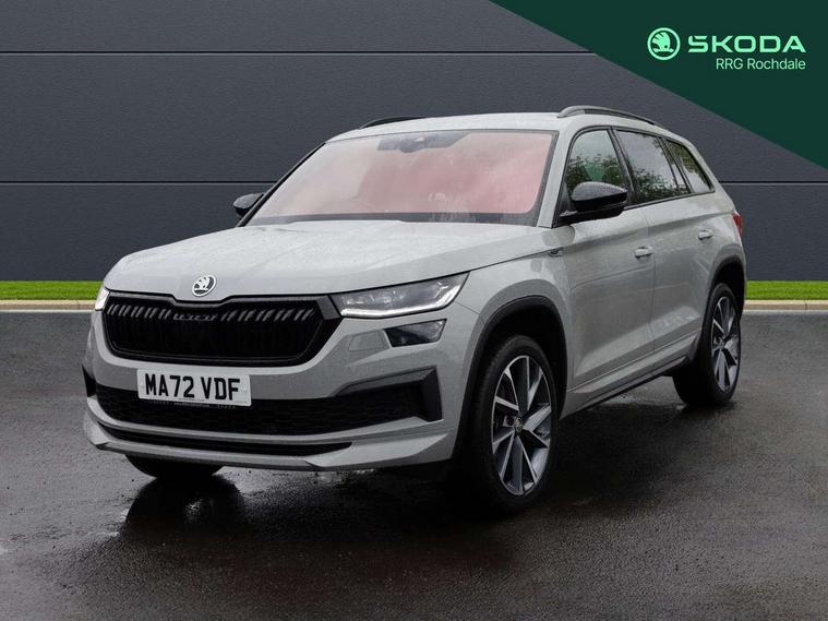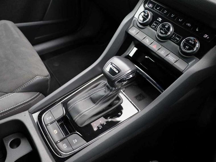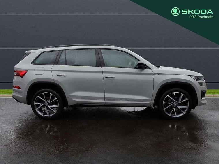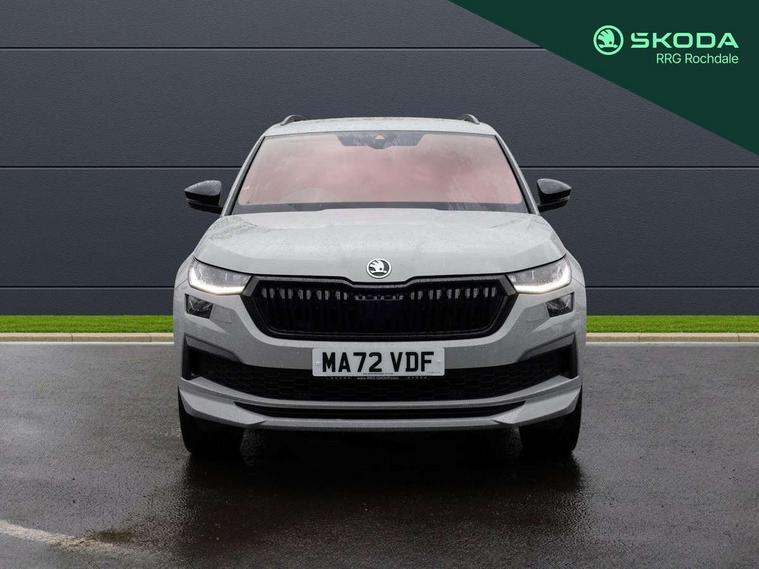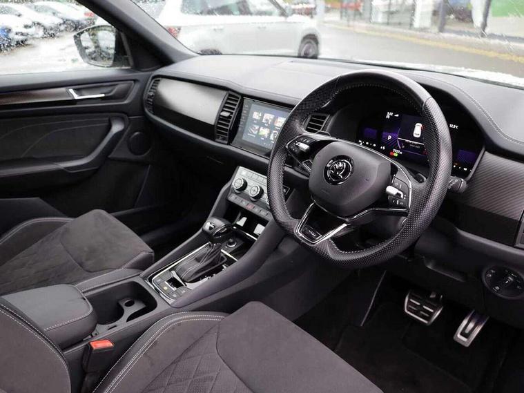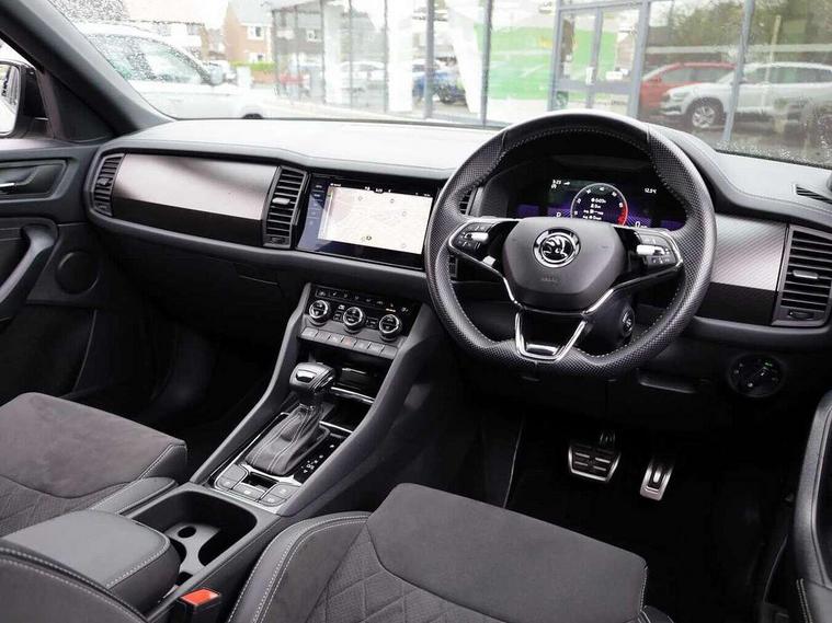 Bluetooth system, Columbus satellite navigation with 9.2" touchscreen, integrated Wi-Fi, web radio, Digital voice enhancement, E-call, ECO Stop/start function, Exterior temperature indicator, Progressive steering, Rear view camera, Smartlink wireless for apple carplay and wired for android auto, Speed limiter, Tailgate unlocking from outside, USB C Port x 2 in front centre console, Wireless charging, 8 Speakers, DAB Digital radio, Aero front windscreen wipers with intermittent function, Aero rear window wiper, Auto dimming rear view mirror, Black roof rails, Black sports styling including front grille and window surrounds, Black wheel arch surrounds, Body colour bumpers, Body colour door handles, Electric adjustable/heated/folding door mirrors, driver side auto dimming with boarding sports and memory function, Electric front and rear windows, Extended rear spoiler with finlets in gloss black, Front fog lights, Full LED matrix headlights with AFS (adaptive front light system), cornering function and AWL (all weather lighting system), Gloss black door mirrors, Headlight washers, Heated rear window, Invisible tailpipe, LED daytime running lights, LED rear fog light, LED third brake light in rear spoiler, Light assistant (coming/leaving home/tunnel light), Off-road style lower front bumper element, Privacy glass, Rain and light sensors, Rear diffuser, Rear LED lights (high functionality) with welcome effect and dynamic indicators, Rear side wing doors, Safety reflectors on front and rear doors, Sportline badge on front fender, Sports front and rear bumpers including lower rear chrome strip, Tailgate lettering in Black, Window control switches with black trim, 12V socket in boot, 2 rails with 2 hooks, 2 seat bench in 3rd row, 3 seat bench in 2nd row, 4 foldable roof handles with rear coat hooks, 60:40 foldable rear seat with sliding adjustment and backrest angle adjustment, Aluminium pedals, Black roof headlining, Bottle holders in door panel in the 1.5 litre front and 1 litre rear, Cargo storage compartments, Chrome headlight control button, Chrome interior door handles, Coat hooks on B pillar, Covered storage compartment on driver side, Front centre armrest with storage compartment, cup holder and 12V socket, Front courtesy lights, Gear shift lever with chrome frame and black gloss insert, Grey stitching in front and rear armrests and door armrests + door inserts, Height adjustable front headrests, Illuminated and cooled glovebox, Illuminated luggage compartment, Isofix child seat fittings in outer rear seats with top tether, Manually adjustable steering column, Microsuede door panels, Net programme in boot (1x horizontal Net, 2x vertical Nets), Overhead glasses storage compartment, Pollen filter, Rear centre armrest with cupholders, Single front passenger seat, Sliding trunk cover, Small Bags on the inner sides of the front backrests, Sports seats, Sunvisors with illuminated vanity mirrors, Three rear height adjustable headrests, Ticket holder on A Pillar, Umbrella in door panel, Variable boot floor, LED Interior light pack - Kodiaq, Auto door release and activation of warning lights in the event of an accident, Child locks on rear doors, Driver and front passenger airbag with knee airbag and front passenger airbag deactivation, Electronic parking brake with hill start assist, Emergency rear braking signal, ESC (incl. ABS+MSR+ASR+EDS+HBA+DSR+RBS+MKB), Front assist with autonomous emergency braking, Front side airbags with curtain airbags, Fuel cut off safety device, Height adjustable front 3 point seatbelts + pretensioners, Hill hold control, Rear disc brakes, Safety vest holder in door, Seat belt reminder for all seats, Three point rear seat belts, Two tone horn, Tyre pressure monitor, Alarm with interior monitoring and tilt sensor with safe function, Anti-theft wheel bolts, Immobiliser, Keyless entry and start system (KESSY), Remote central locking with 2 keys, Black air vent surround, Carbon finish dashboard and door inserts, Grey stitching in dashboard, 20" Vega Anthracite alloy wheels, Temporary spare wheel (space saver),