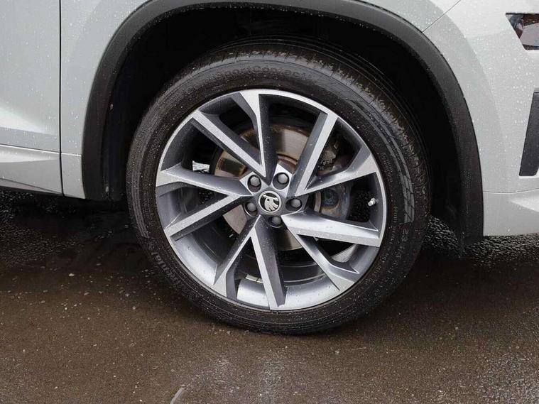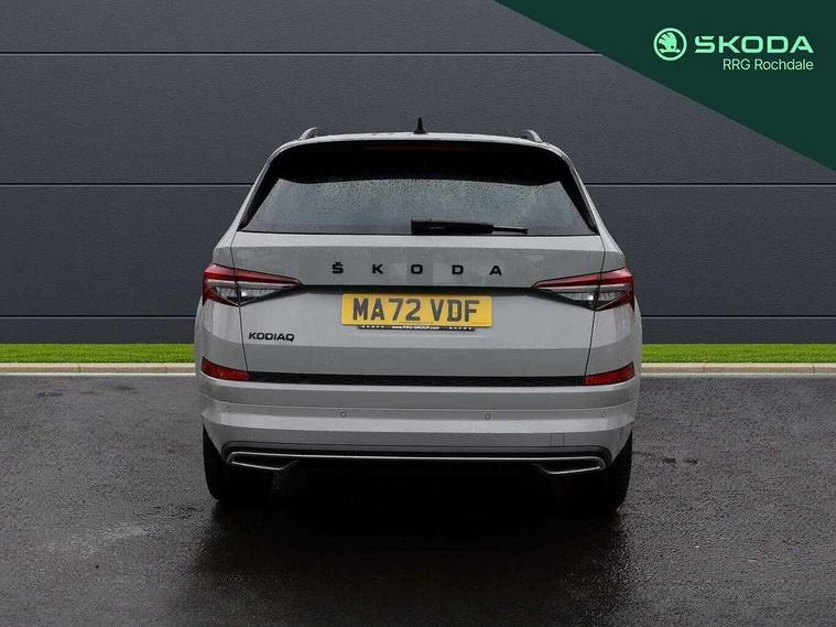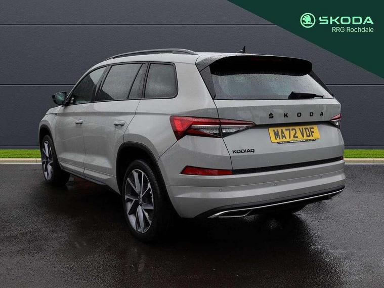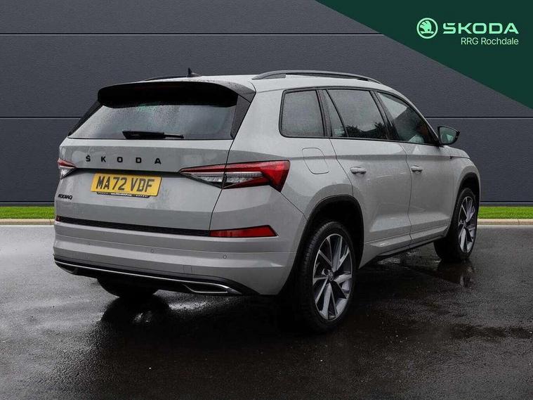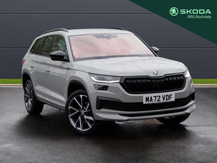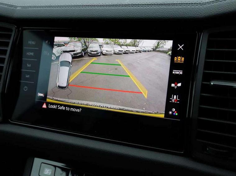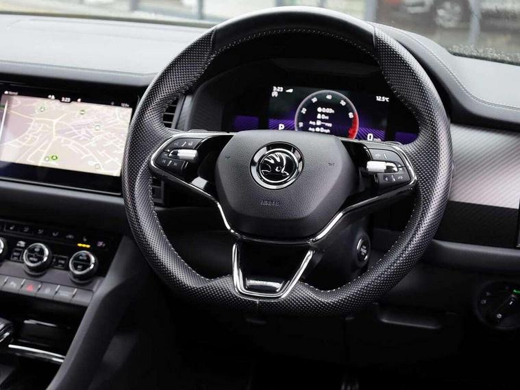 Bluetooth system, Columbus satellite navigation with 9.2" touchscreen, integrated Wi-Fi, web radio, Digital voice enhancement, E-call, ECO Stop/start function, Exterior temperature indicator, Progressive steering, Rear view camera, Smartlink wireless for apple carplay and wired for android auto, Speed limiter, Tailgate unlocking from outside, USB C Port x 2 in front centre console, Wireless charging, 8 Speakers, DAB Digital radio, Aero front windscreen wipers with intermittent function, Aero rear window wiper, Auto dimming rear view mirror, Black roof rails, Black sports styling including front grille and window surrounds, Black wheel arch surrounds, Body colour bumpers, Body colour door handles, Electric adjustable/heated/folding door mirrors, driver side auto dimming with boarding sports and memory function, Electric front and rear windows, Extended rear spoiler with finlets in gloss black, Front fog lights, Full LED matrix headlights with AFS (adaptive front light system), cornering function and AWL (all weather lighting system), Gloss black door mirrors, Headlight washers, Heated rear window, Invisible tailpipe, LED daytime running lights, LED rear fog light, LED third brake light in rear spoiler, Light assistant (coming/leaving home/tunnel light), Off-road style lower front bumper element, Privacy glass, Rain and light sensors, Rear diffuser, Rear LED lights (high functionality) with welcome effect and dynamic indicators, Rear side wing doors, Safety reflectors on front and rear doors, Sportline badge on front fender, Sports front and rear bumpers including lower rear chrome strip, Tailgate lettering in Black, Window control switches with black trim, 12V socket in boot, 2 rails with 2 hooks, 2 seat bench in 3rd row, 3 seat bench in 2nd row, 4 foldable roof handles with rear coat hooks, 60:40 foldable rear seat with sliding adjustment and backrest angle adjustment, Aluminium pedals, Black roof headlining, Bottle holders in door panel in the 1.5 litre front and 1 litre rear, Cargo storage compartments, Chrome headlight control button, Chrome interior door handles, Coat hooks on B pillar, Covered storage compartment on driver side, Front centre armrest with storage compartment, cup holder and 12V socket, Front courtesy lights, Gear shift lever with chrome frame and black gloss insert, Grey stitching in front and rear armrests and door armrests + door inserts, Height adjustable front headrests, Illuminated and cooled glovebox, Illuminated luggage compartment, Isofix child seat fittings in outer rear seats with top tether, Manually adjustable steering column, Microsuede door panels, Net programme in boot (1x horizontal Net, 2x vertical Nets), Overhead glasses storage compartment, Pollen filter, Rear centre armrest with cupholders, Single front passenger seat, Sliding trunk cover, Small Bags on the inner sides of the front backrests, Sports seats, Sunvisors with illuminated vanity mirrors, Three rear height adjustable headrests, Ticket holder on A Pillar, Umbrella in door panel, Variable boot floor, LED Interior light pack - Kodiaq, Auto door release and activation of warning lights in the event of an accident, Child locks on rear doors, Driver and front passenger airbag with knee airbag and front passenger airbag deactivation, Electronic parking brake with hill start assist, Emergency rear braking signal, ESC (incl. ABS+MSR+ASR+EDS+HBA+DSR+RBS+MKB), Front assist with autonomous emergency braking, Front side airbags with curtain airbags, Fuel cut off safety device, Height adjustable front 3 point seatbelts + pretensioners, Hill hold control, Rear disc brakes, Safety vest holder in door, Seat belt reminder for all seats, Three point rear seat belts, Two tone horn, Tyre pressure monitor, Alarm with interior monitoring and tilt sensor with safe function, Anti-theft wheel bolts, Immobiliser, Keyless entry and start system (KESSY), Remote central locking with 2 keys, Black air vent surround, Carbon finish dashboard and door inserts, Grey stitching in dashboard, 20" Vega Anthracite alloy wheels, Temporary spare wheel (space saver),