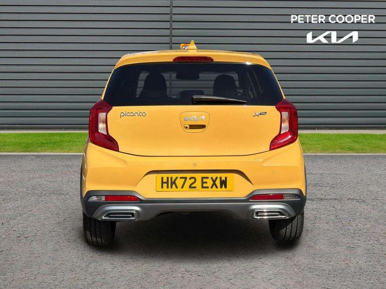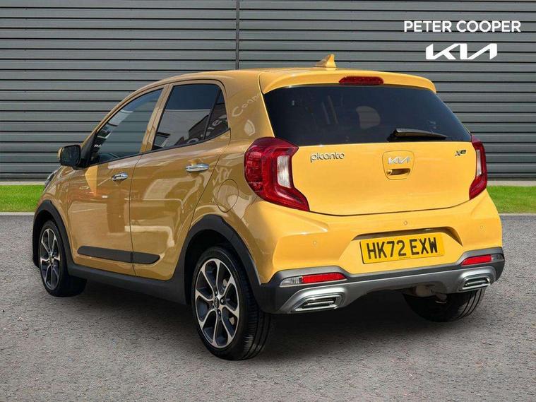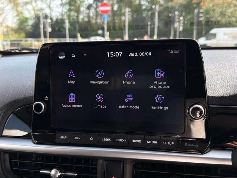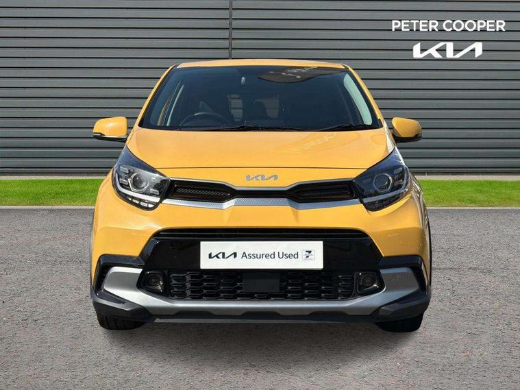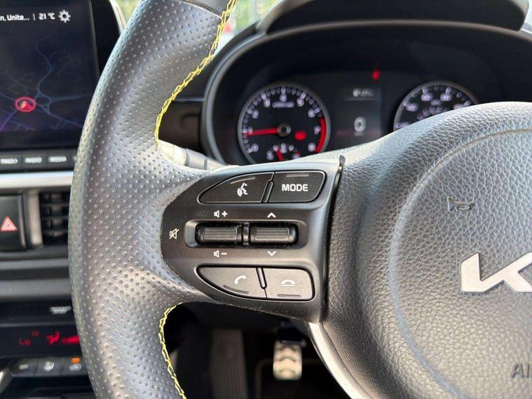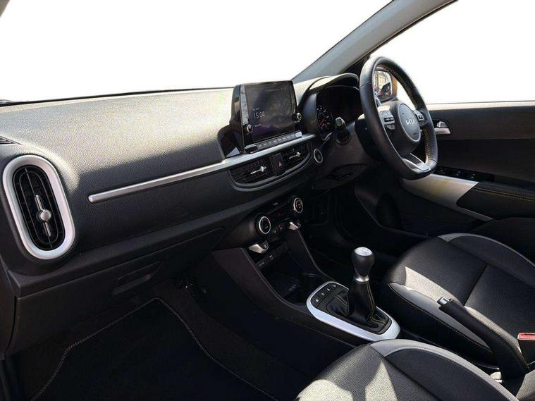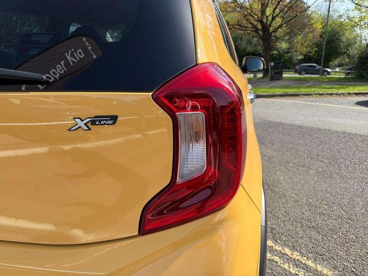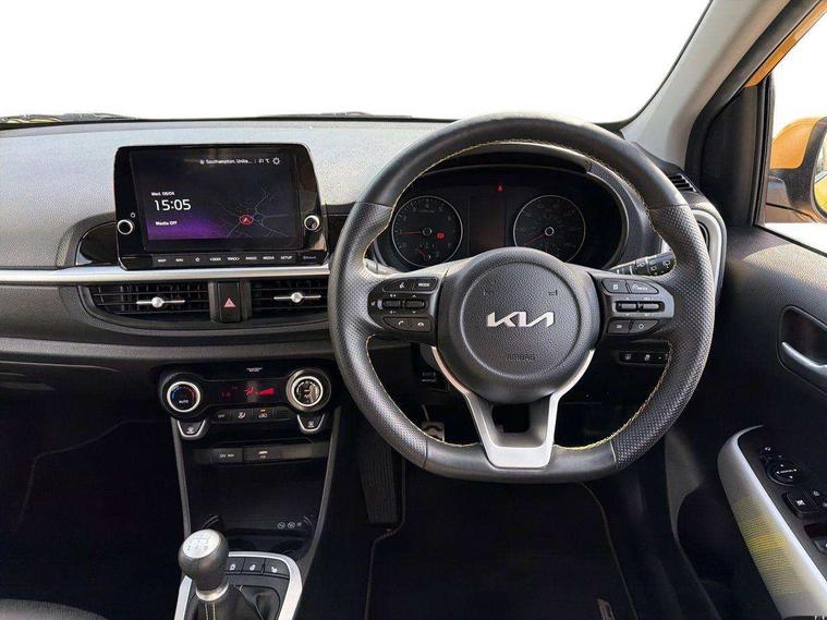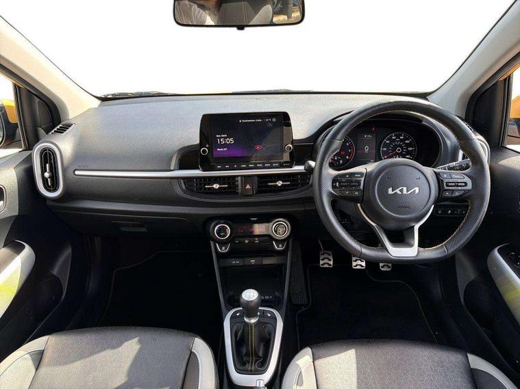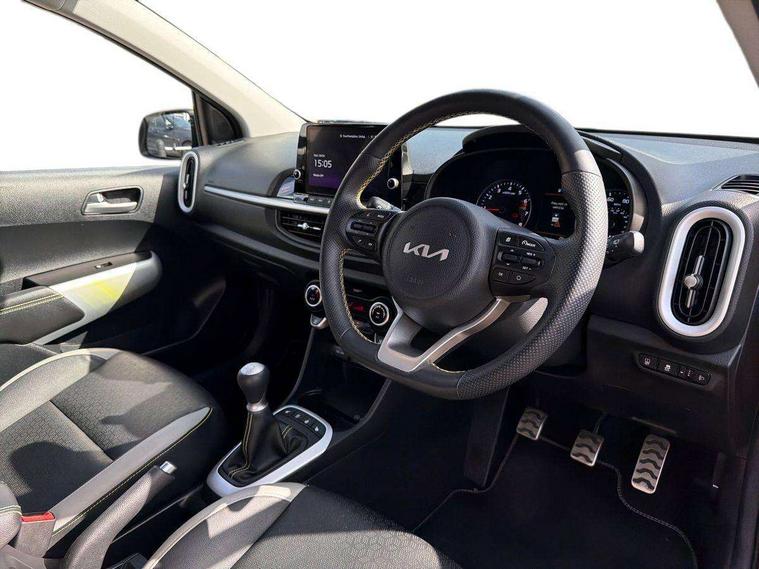 8" touch screen satellite naviagtion with RDS and DAB with telematics, Apple car play/Android Auto with voice control, Cruise control + speed limiter, Emergency call service, Emergency stop signalling system, External temperature gauge, Kia Connect (UVO), Motor driven power steering, Rear parking sensors, Reversing camera system with dynamic guidelines (Integrated into centre fascia screen), Tachometer, Trip computer, Wireless Smartphone charger, 6 speaker audio system, Bluetooth with music streaming, Steering wheel mounted controls, USB ports for connection of a media device, Automatic headlight control system, Bi-function projection headlights, Black beltline mouldings, Black grille with silver surround, Black side sill moulding, Black wheel arch cladding, Body colour B pillars, Body colour bumpers, Body coloured mirrors and chrome exterior handles, Day/night rear view mirror, Electric adjustable/heated/folding door mirrors with LED indicators lights, Front and rear bumpers with silver skid plates and twin exhaust, Front and rear electric windows with drivers's auto up/down function, Front fog lights, Headlamp levelling, Heated rear window, High mount brake light, LED daytime running lights, LED rear fog lights, LED rear lights, Privacy glass - Rear windows and tailgate, Rain sensor, Rear side wing doors, Rear wash/wipe, Speed variable front wipers, Tinted glass, Visible VIN plate, Welcome and follow-me home light functionality, 1 x rear coat hook, 12V power point front, 3 seat bench in 2nd row, 3 x passenger assist grips, 60/40 split/folding 2nd row of seats, All round height adjustable headrests, Automatic air conditioning, Centre Console with Storage Box and Sliding Armrest, Cupholders in centre console, D-cut steering wheel with green stitching, Driver and front passenger sunvisors with driver's side illuminated vanity mirrors, Driver seat height adjust, Dual Height Luggage Area Floor, Faux leather upholstery, Front cabin lights, Glovebox, Heated front seats, Heated steering wheel, ISOFIX Child seat top tethers and anchor fixings, Leather trimmed steering wheel and gearshift, Luggage area light, Luggage area parcel shelf, Metal pedals, Passenger front seatback pockets, Satin chrome interior door handles, Silver and green accents on door armrests, lower centre console trim and air vents, Single front passenger seat, Slide/reclining front seats, Tilt adjustable steering wheel, Advanced Driver Assistance Pack - Picanto, 3x3 point rear seatbelts, ABS/EBD, Automatic unlocking of doors in case of impact, Dual front airbags, ESC + BAS + VSM + HAC, Front passenger airbag cut-off switch, Front seatbelt height adjusters, Front seatbelt pretensioners + load limiters, Hill hold control, Knee airbags, Rear child proof door locks, Seatbelt warning, Side impact protection, Torque vectoring brake based and straight line stability (SLS), Traction control, Twin curtain airbags, Twin front side airbags, Tyre pressure monitoring system, Anti theft alarm, Engine immobiliser, Locking wheel nuts, Smart key with engine start/stop button, 16" alloy X-Line wheels, Tyre mobility kit,