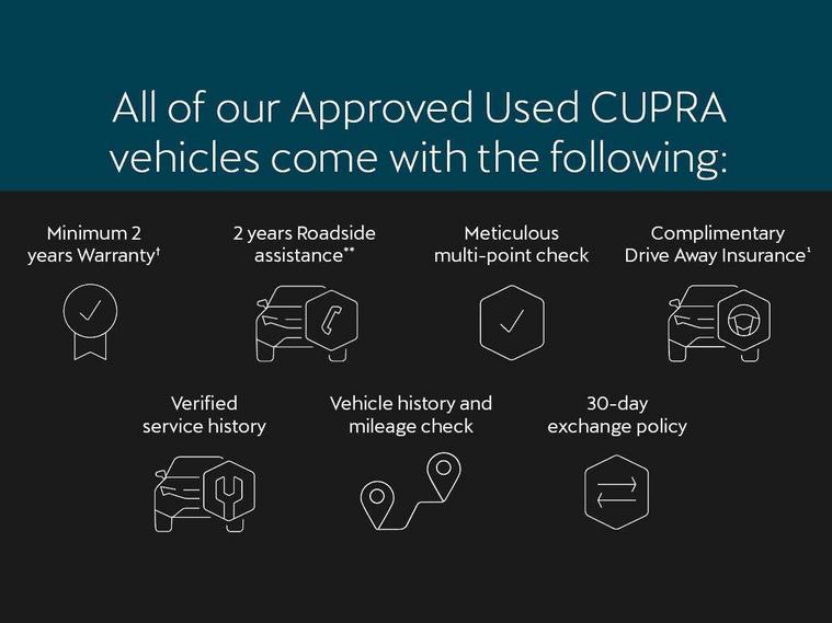 10.25" digital cockpit and configurable dashboard, Adaptive cruise control with follow-to-stop and speed limiter, Advanced driver alert system, Driving profile selection, Dynamic road sign display, Emergency steering support with turn assist, Forward collision warning with automatic braking, Front and rear parking sensors, Full link phone integration, Lane assist, Progressive steering, Rear view camera, RPM, trip computer, outside temp gauge, instrument light brightness, low fuel warning light, lights on reminder, gearshift indicator, Service interval indicator, Start/stop system with regenerative braking, Virtual pedal and electric tailgate, Voice control system, Wired Android Auto, Wireless apple carplay, Wireless phone charger, CUPRA sport suspension, Electronic locking differential and dynamic traction support, 2 front and 2 rear USB type C sockets, Media system with navigation, 12.9" touchscreen display, voice control, DAB, steering wheel mounted controls, Auto dimming rear view mirror, Body colour door handles, Body coloured bumpers, Dark grey wing mirror, Daytime running light with automatic headlight control and coming home feature, Door panel ambient lighting, Dynamic headlight range control, Electric front/rear windows, Electrically adjustable heated and folding door mirrors with memory function, Gloss black roof rails and window surrounds, High beam assist, LED 3rd brake light, LED front fog lamps with cornering function, LED Headlights, LED Taillights with dynamic indicator, Rain sensing wipers, Rear diffuser with black simulated exhaust pipes, Rear fog lights, Rear side wing doors, Rear wash/wipe, Tinted rear windows, Welcome lights (within exterior mirror housing), 12V socket, 2 front and 2 rear reading lights, 3 seat bench in 2nd row, 60/40 split rear bench seat with armrest and mechanical seat release, Black headlining, Black interior roof lining, Cupra sports pedals, Dust/pollen filter, Electrically adjustable driver's seat with memory and lumbar support, Front and rear head restraints, Front centre armrest, Heated front seats, Heated supersports multifunction leather steering wheel with satellite buttons and gear shift paddles, Height/reach adjust steering wheel, Illuminated aluminium doorsteps, Illuminated interior front door sills, Illuminated sunvisor with mirror, Isofix, Leather dashboard, door insert and side trim panel, LED smart wraparound lighting, PVC/Dinamica microfiber upholstery + bucket seats, Satellite steering wheel, Single front passenger seat, Storage pockets on rear of front seats, Three zone climate control with control panel in rear, Variable luggage/load compartment floor, 3 point seatbelts on all rear seats, ABS, Brake control system - ESC and brake booster, Child proof door locks, Driver and front passenger airbags with front passenger airbag de-activation, Electronic parking brake, Front and rear disc brakes, Front side curtain airbags, Hill hold control, Public e-call, Seat belt reminder for front and rear seats, Tyre pressure monitoring system, Anti theft alarm system, KESSY Advanced - Keyless start, keyless entry with SAFELOCK, Locking wheel bolts, Copper and aluminium interior detailing, 19" Sandstorm machined sport black and silver alloy wheels,