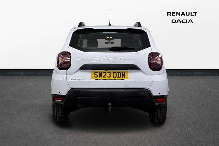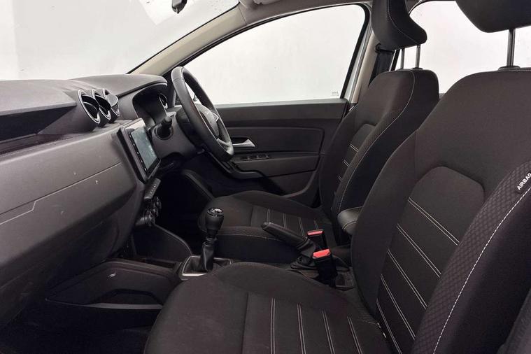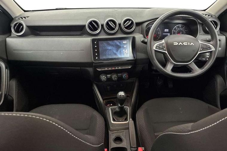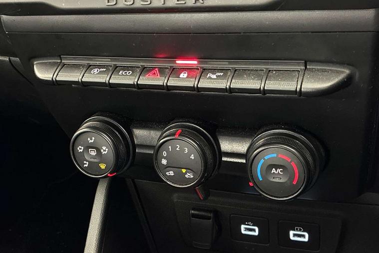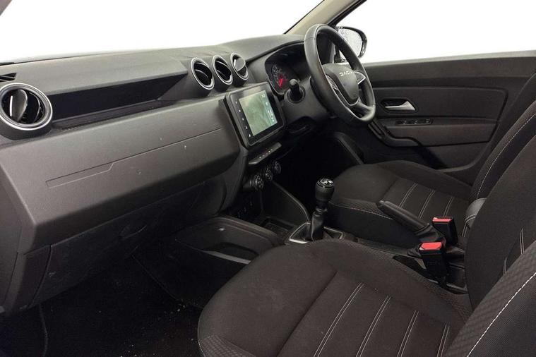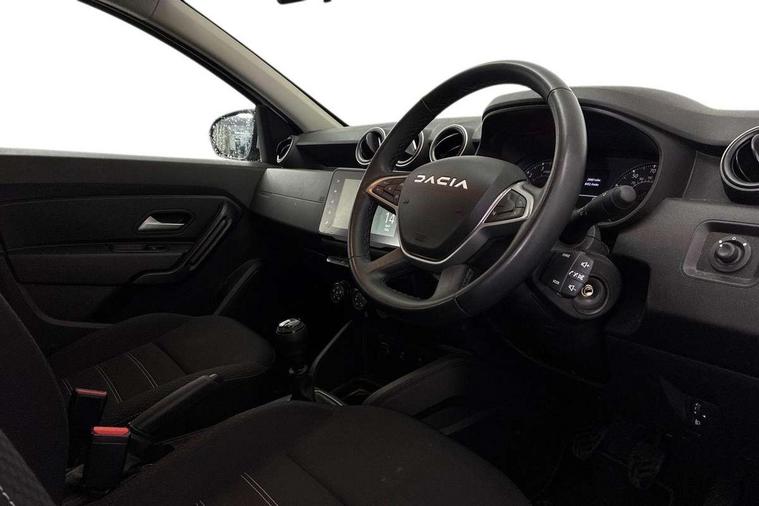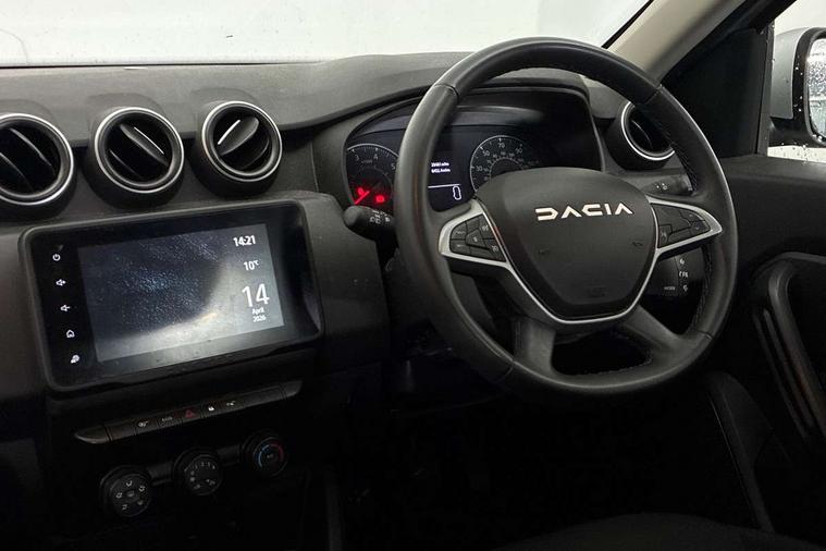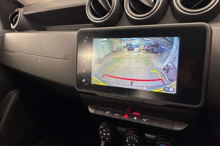 Cruise control and speed limiter, eCall emergency system, Eco mode, Electric power assisted steering, On board computer, odometer, trip computer, average fuel consumption, average speed, service indicator, outside temperature gauge, Rear parking sensors, Rev counter, Reversing camera, Stop/start system, 8" Media display with smartphone replication, 2 usb sockets and 6 speakers, Dacia plug and radio/MP3/USB/bluetooth/DAB/steering wheel control, 3 speed windscreen wipers, Black longitudinal roof bars with Duster inscription, Black side sills, Black/satin chrome tailgate trim with Duster inscription in black background and lettering, Body coloured door handles, Chrome front grille with hot stamping, Chrome logo surround on steering wheel, Daytime running lights, Drivers window one touch up/down, Dusk sensor, Electric adjustable/heated door mirrors, Electric front windows, Electric rear windows, Front and rear body coloured bumpers, Front door sill protection strip, Front fog lights, Heated rear window, High level third rear brake light, Rain sensor, Rear side wing doors, Rear spoiler, Rear wash/wipe, Satin chrome door mirrors, Tinted windows, Underbody protection skid plates, Y shaped LED headlights with rear LED lights, 3 rear height adjustable headrests, 3 seat bench in 2nd row, 60/40 split folding rear seat, Backlighted steering wheel buttons, Boot light, Driver seat lumbar adjustment, Fabric decorative insert on door panels, Fabric upholstery, Front head restraints, Front passenger reading light, Gear shift indicator, Height adjustable driver seat, Height adjustable front and rear headrests, Height and depth adjustable steering wheel, High centre console with driver armrest, Isofix points for child seats in both outer rear seats, Manual air conditioning, Map pocket on front seat backs, Passenger sunvisor with vanity mirror, Rear passenger reading light, Satin chrome interior door handles, Satin chrome lower steering wheel insert, Single front passenger seat, Soft feel leather steering wheel, 3x3 point rear seatbelts, ABS and Emergency brake assist, ASR traction control with Electronic stability control, Child locks on rear doors, Door open visual and audible warning, Driver airbag, Driver and passenger seatbelt not fastened - visual and audible warning, EBD - Electronic brakeforce distribution, Front passenger airbag, Front passenger airbag deactivation, Front seatbelt pretensioners, Front side airbags, Height adjustable front seatbelts, Hill start assist, Tyre pressure monitor, Remote central locking, Thatcham approved engine immobiliser, Charcoal grey central console surround, Matt black central console fascia, Piano black decorative insert on front door panels, Satin chrome air vent surround, Satin chrome instrument dial surrounds, 16" alloy wheels,