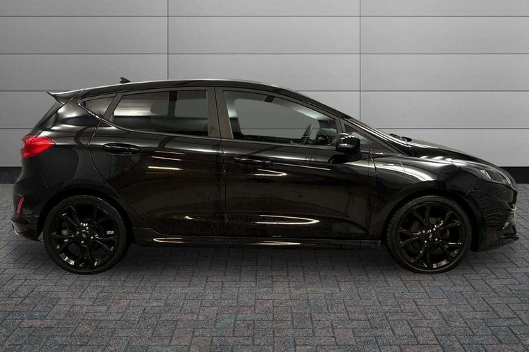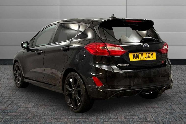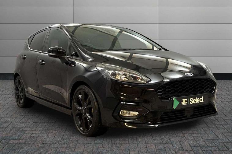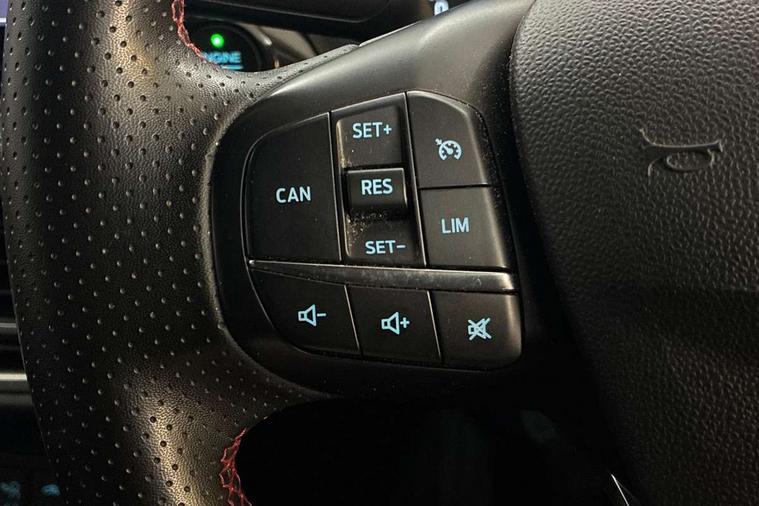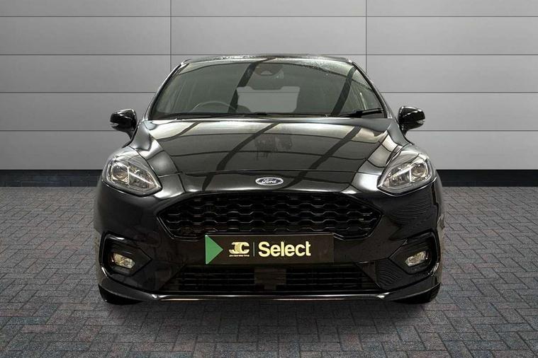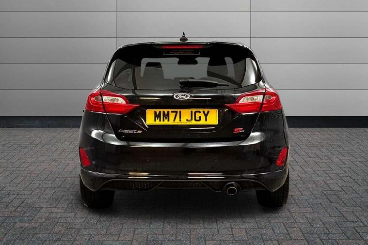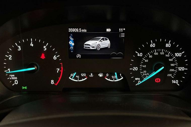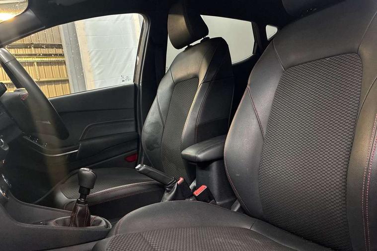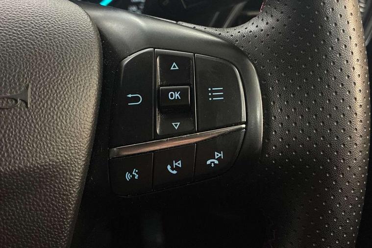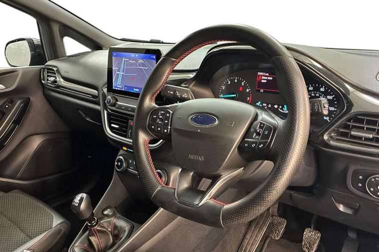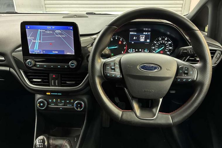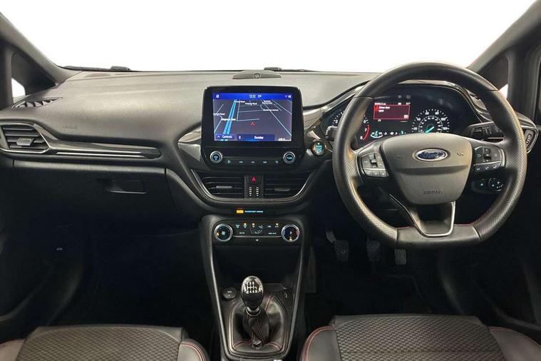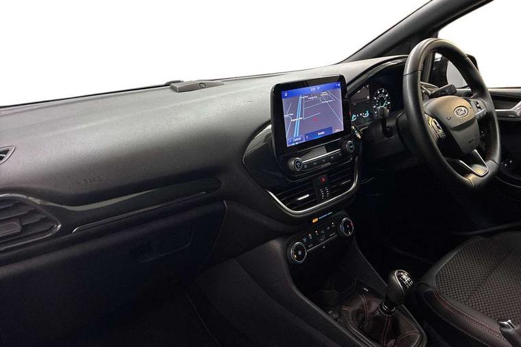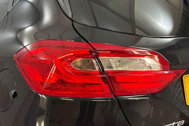 4.2" TFT instrument cluster screen, Bluetooth system, Electric power steering, Ford easy fuel, Rear parking distance sensors, Selectable drive modes (Normal, Sport, Track), Traffic sign recognition, Trip computer, Sports suspension, 2 USB ports, Auxiliary input socket, B&O Premium audio system with 8" touchscreen, 10 speakers, 360 degree sound system, Ford SYNC 3 navigation system and Ford pass connect, DAB Digital radio, Steering wheel mounted controls, Auto high beam, Body colour bumpers, Body colour door handles, Body colour large rear spoiler, Body coloured electrically operated and heated door mirrors with side indicators, Cornering front fog lights, Electric front windows/one touch facility, Electric rear windows, LED Night signature to rear lights, Power foldable door mirrors with puddle lights, Quickclear heated windscreen, Rain sensing wipers and auto dimming rear view mirror, Rear privacy glass, Rear wiper, Unique ST-Line upper grille & full bodystyling kit with ST-Line wing badges, 3 spoke flat bottomed leather steering wheel, 60/40 split folding rear seat, Adjustable head restraints, Black headlining, Boot carpet, Centre console with opening armrest, 2x cupholders, 12v and USB, Chrome inner door handles, Drivers and Passenger lumbar support, EATC - Electronic Auto Temperature control, Footwell illumination, Front floor mats in velour, Front map reading lights, Front seat and rear pockets, Height adjustable passenger seat, Illuminated glovebox, Leather gaiter, LED ambient lighting, Load area light, Manual 4-way driver seat adjust, Overhead console with sunglasses holder, Pollen filter, Rake/reach adjustable steering wheel, Sensico wrapped steering wheel, Sports front seats, NCAP Pack - Fiesta, ST-Line X Trim Pack - Fiesta, 3 point seatbelts on all rear seats, ABS+EBA, Curtain airbags, Driver and passenger airbags, Drivers knee airbag, Electronic stability control with hill start assist, Front passenger airbag deactivation, Front side airbags, Seatbelt warning, Two tone horn, Tyre pressure monitoring system, Ford keyfree system with Keyless entry and keyless start, MyKey system, Remote central locking & engine immobiliser, Thatcham Cat.1 alarm, 18" 5 spoke alloy wheels with rock metallic machined finish,