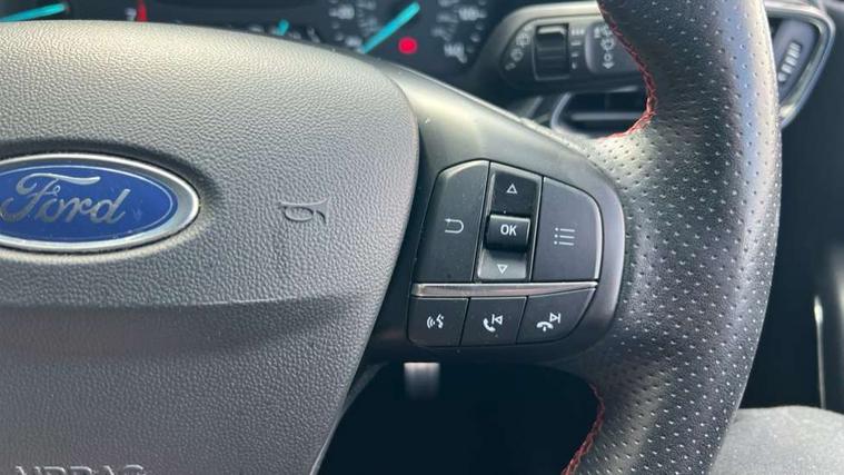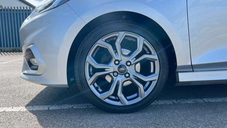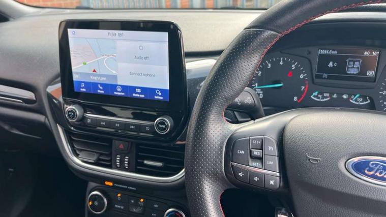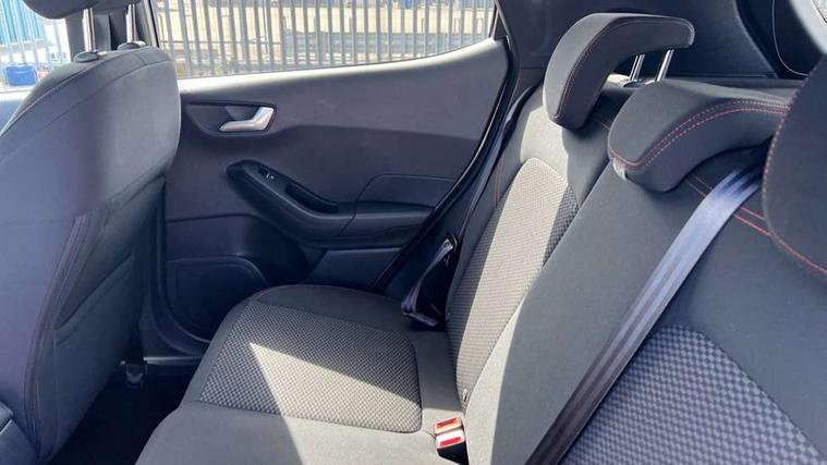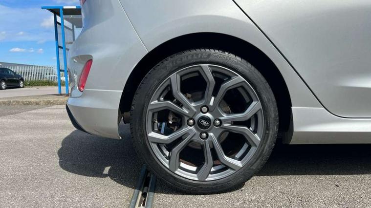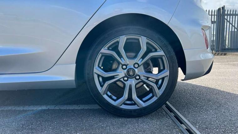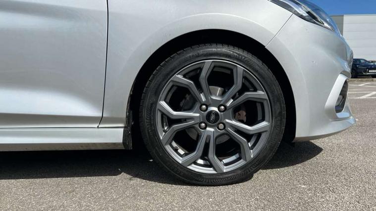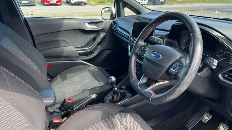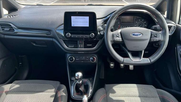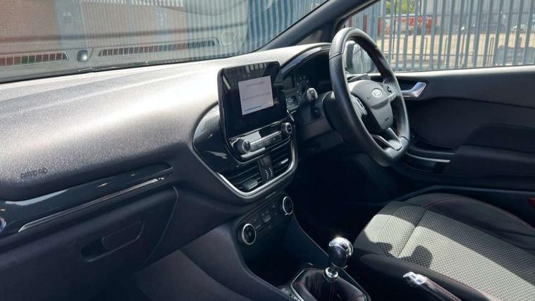 Bluetooth system, Electric power steering, Ford easy fuel, Ford SYNC 3 Navigation system incl 8" touchscreen, 7 speakers, FordPass connect, Apple carplay, android auto, voice control and emergency assistance, Rear parking distance sensors, Trip computer, Sports suspension, 2 USB ports, Auxiliary input socket, DAB Digital radio, Steering wheel mounted controls, Body colour bumpers, Body colour door handles, Body colour large rear spoiler, Body coloured electrically operated and heated door mirrors with side indicators, Cornering front fog lights, Electric front windows/one touch facility, Electric rear windows, LED Night signature to rear lights, Power foldable door mirrors with puddle lights, Quickclear heated windscreen, Rain sensing wipers and auto dimming rear view mirror, Rear privacy glass, Rear wiper, Unique ST-Line upper grille & full bodystyling kit with ST-Line wing badges, 12V Accessory socket in centre console, 3 spoke flat bottomed leather steering wheel, 60/40 split folding rear seat, Adjustable head restraints, Black headlining, Boot carpet, Centre console with armrest and illuminated cupholders, Chrome inner door handles, Cloth upholstery, Footwell illumination, Front map reading lights, Front seat and rear pockets, Front/rear floor mats, Height adjustable driver's seat, Illuminated glovebox, LED ambient lighting, Load area light, Manual air conditioning, Overhead console with sunglasses holder, Pollen filter, Rake/reach adjustable steering wheel, Sensico wrapped handbrake and gearknob, Sports front seats, Sports pedals, NCAP Pack - Fiesta, 3 point seatbelts on all rear seats, ABS+EBA, Curtain airbags, Driver and passenger airbags, Drivers knee airbag, Electronic stability control with hill start assist, Front passenger airbag deactivation, Front side airbags, Seatbelt warning, Two tone horn, Tyre pressure monitoring system, Keyless start with 'Ford Power' starter button, MyKey system, Remote central locking & engine immobiliser, Thatcham Cat.1 alarm, 17" 5 spoke alloy wheels with rock metallic finish,