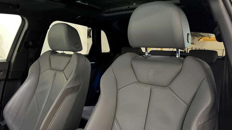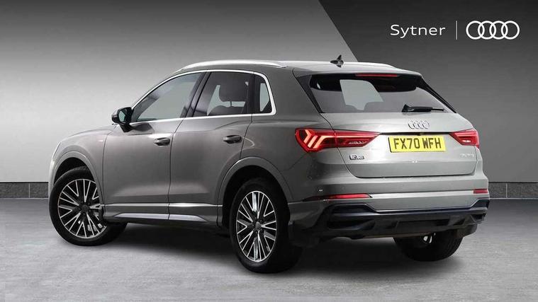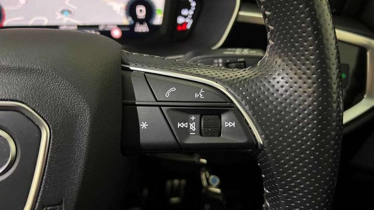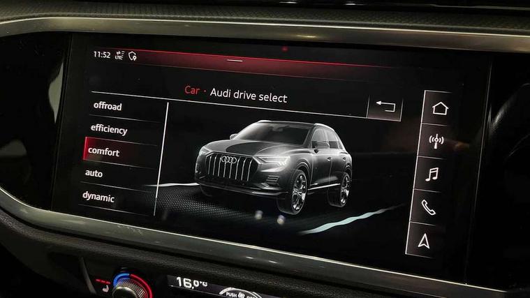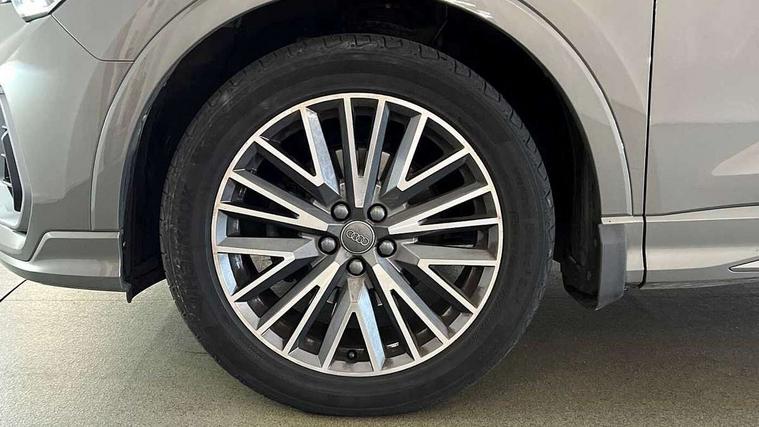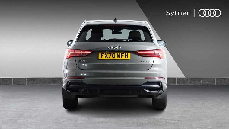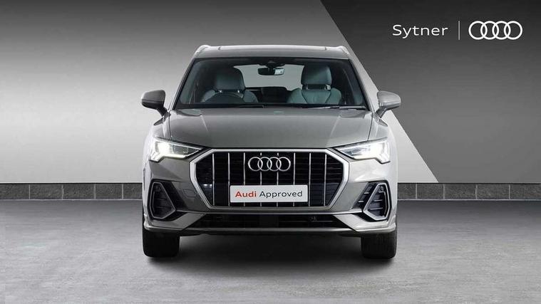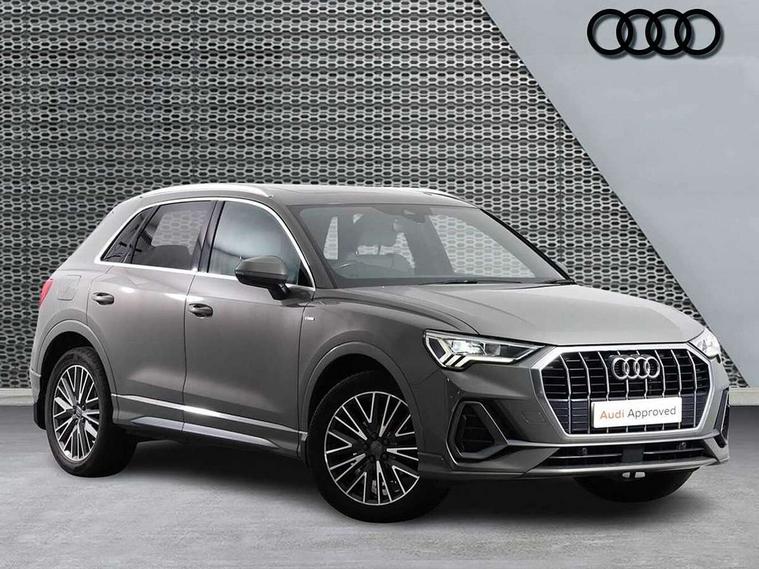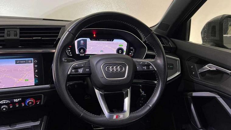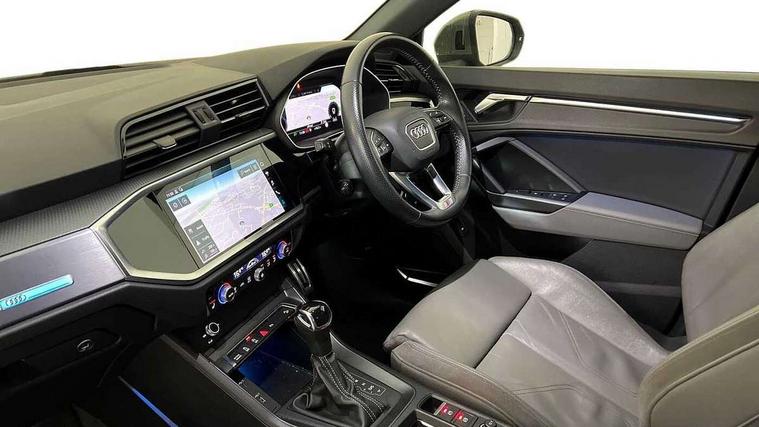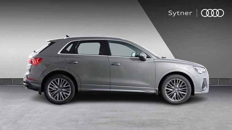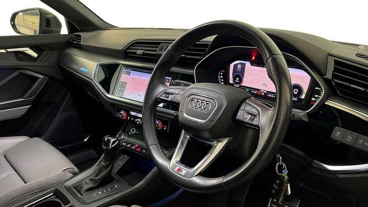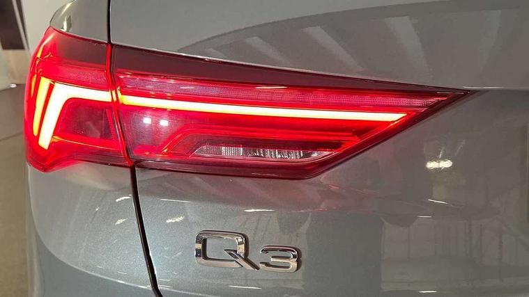 Audi connect safety and service (e-call), Audi drive select, Audi lane departure warning, Audi side assist, Audi smartphone interface includes wireless Apple carplay/Android Auto, Audi Virtual Cockpit - 10.25" display, Bluetooth interface, Camera based traffic sign recognition, MMI Navigation Plus with high resolution 10.1 inch touchscreen colour display, Power operated tailgate, Progressive steering, Service interval indicator, Start stop system with recuperation, Voice control system with natural language interaction, 48V Mild hybrid technology, Sports suspension, 1 x USB type C and 1 USB type A charging points, 6 passive loudspeakers, DAB digital radio module, Acoustic windscreen, Aluminium roof rails, Aluminium window trim, Auto dimming frameless rear view mirror, Body coloured bumpers, Electrically folding, adjustable and heated door mirrors with integrated LED side indicators and kerb view function for passenger side, Front and rear electric windows, Front fog lights, Front side air inlets in matt platinum grey, Front spoiler blade in matt platinum grey, Grille vertical bars in aluminium silver/Matt, High gloss black finish B and C pillars, LED headlights with LED daytime running lights and dynamic rear indicator, LED rear lights, Privacy glass dark tinted rear and rear-side windows (from B-pillar backwards), Rain and light sensors, Rear diffuser strip in matt titanium black, S line badges on front wings, S Line front and rear bumpers, Side skirt insert in matt Platinium grey, Silver chrome grille surround, Titanium black radiator grille, 12V socket in rear centre console, 40:20:40 folding with manual adjustment for 60:40 forwards/backwards position and backrest angle, Adjustable rear seat bench/backrest with centre armrest and cupholder, Black cloth headlining, Dual zone electronic climate control, Front and rear black floor mats with contrast stitching in rock grey, Front and rear headrests, Front and rear roof module including reading lights, Front centre armrest, Glove compartment lighting, Height and reach adjustable steering wheel, Illuminated door sill trims with S logo, ISOFIX child seat mounting for front passenger with airbag deactivation and outer rear seat including top tether attachment point for outer rear seats, Luggage compartment light, Manual front seats with height adjustment, Perforated leather gearknob, Stainless steel luggage compartment sill finisher, Stainless steel pedals, Tool kit, Non smoking pack - Q3, 3x3 point rear seatbelts, 6 airbags - Driver, front passenger, curtain and side windows, Audi pre-sense front with pedestrain and cyclist recognition, Electrically operated child locks on rear doors, Electromechanical parking brake, Electronic stabilisation control including ABS, ASR and EDL, Hill descent control, Hill hold assist, Pre sense basic, Seatbelt monitoring, Tyre pressure warning, Warning triangle and first aid kit, Anti theft alarm, Anti theft wheel bolts, Remote central locking, Dark matt brushed aluminium inlay, Detail dashboard around MMI touch colour display in glass look, black with surround in aluminium look, Leatherette door armrest, Tyre repair kit,