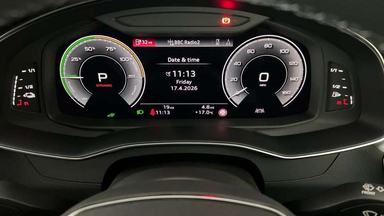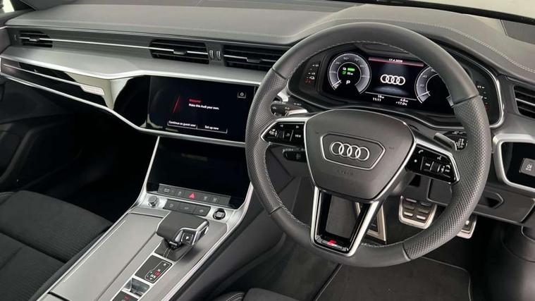 Audi connect safety and service (e-call), Audi connect with Amazon Alexa Integration, Audi drive select, Audi parking system plus - acoustic and visual park assist system for front and rear, Audi virtual cockpit, Automatic start/stop system with coasting functionality, Bluetooth interface, Camera based traffic sign recognition, Lane departure warning system, MMI navigation plus with 10.1" and 8.6" touch screens, Power operated tailgate, Progressive steering, Rear view camera, Service interval indicator, Smartphone interface includes wireless Apple carplay/Android Auto, Voice control system, 3 pin 10 amp domestic charging cable, 52 litre fuel tank, 7.4 kW onboard charger, Compact charging system, Hybrid propulsion system, Industrial connector CEE 32A, 230V, long and straight for the e-tron charging system, Mode 3 charging cable for public charging (AC), Sports suspension, Type 2 socket for AC charging, Audi front music interface, Audi sound system, Auxiliary input socket, DAB Digital radio, USB connection, Aluminium roof rails, Body colour rear roof spoiler, Body coloured door mirrors, Electric front/rear windows, Electrically adjustable heated and folding + automatically dimming exterior mirrors with memory function, Frameless auto dimming interior rear view mirror, Front intermittent wipers, Heat insulating darkened glass in side and rear windows, Heat insulating glass in windshield, LED rear lights with dynamic indicators, LED signature front daytime running light, LED third brake light, Matrix LED headlights, Matt black rear diffuser with diffuser strip and tailpipes in chrome, Matt black side air intake grille with inlay in matt aluminium, Privacy glass, Radiator grille in anthracite black matt, single frame in chrome and horizontal struts in matt aluminium silver, Rain and light sensors, Rear side wing doors, Rear wiper, 3 spoke high multi-function perforated leather steering wheel with contrast stitching and shift paddles, 4 zone deluxe automatic climate control, 40/20/40 split folding 3 rear seat bench in 3 parts with rear centre armrest, Audi phone box light, Black cloth headlining, Electrically adjustable front seats including seat height, fore/aft position, backrest angle and 4-way lumbar with memory for driver's seat, Front and rear floor mats, Front centre armrest, Front head restraints, Heated front seats, Height/reach adjust steering wheel, Illuminated door sill trims with S logo, Illuminated sun visors with vanity mirrors, Leather gear knob, Luggage compartment system, Rear headrests, Single front passenger seat, Stainless steel pedals and foot rest, Tool kit and car jack, LED Interior Ambient Lighting Pack - A6, Non smoking pack - A6, S line exterior style pack - A6, 3 point seatbelts on all seats, Airbags - Front side, front and rear including head, Audi pre-sense front, EBD - Electronic brakeforce distribution, Electromechanical parking brake, Electronic Stability Control (ESC) including ABS, ASR and EDL, Extended pedestrian protection measures, ISOFIX child seat mounting for front passenger seat and ISOFIX child seat mounting with Top Tether for outer rear seats, Manual child proof rear door locks, Seatbelt monitoring, Tyre pressure warning light, Warning triangle and first aid kit, Anti theft alarm with tow away protection, Anti-theft wheel bolts and wheel loosening detection, Immobiliser, Keyless Go, Remote central locking, Matt brushed aluminium inlays, Tyre repair kit,