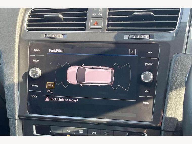 'Lights On' Reminder warning buzzer, 8" touch screen, Adaptive Cruise Control with pedestrian detection and speed limiter, App-Connect, Bluetooth hands free telephone connection, Brake pad wear indicator warning light, Driver alert system, Driver profile selection, Exterior temperature gauge, Instrument cluster in white, Multifunction computer, PAS - speed related, Rev counter, Trip and service interval display, Ultrasonic front and rear optical and audible parking sensors, Warning buzzer and light for front seatbelts unfastened, XDS electronic differential lock, CD/MP3/WMA, USB and SD card reader, aux-in, Composition media system, DAB Digital radio, Auto dimming rear view mirror, Automatic coming/leaving home lighting function, Automatic headlights, Black front air intake and radiator grille with chrome insert, Black rear diffuser, Black roof rails, Body colour bumpers, Body colour door handles, Body colour door mirrors, Electric front windows, Electric rear windows, Electrically adjustable and heated door mirrors, Heated rear windscreen, LED daytime running lights, LED rear lights, Rain sensor, Rear roof spoiler, Rear windscreen washer and wiper with interval delay, 12V socket in luggage compartment, 3 rear headrests, 3 spoke steering wheel, 60/40 split folding rear seat, Bag hook in luggage compartment, Boot lashing points, Cooled glovebox, Courtesy light delay, Cover for storage compartment in centre, Dust/pollen filter, Front and rear reading lights, Front centre armrest with storage box and rear air vents, Front passenger seat height adjust, Front seat back storage pockets, Grab handles, Height/reach adjust steering wheel, Illuminated vanity mirrors, Isofix preparation for 2 rear child seats, Load through provision with rear centre armrest and cupholders x2, Luggage compartment cover, Luggage compartment lighting, Multifunction leather steering wheel with leather gear knob/handbrake grip, Overhead storage box, Pearl grey headlining, Storage compartments in doors, Sun visors, Variable boot floor, height adjustable and removable, Mirror pack - Golf, 3 point height adj front seatbelts + pretensioners, 3 rear 3 point seatbelts, ABS, Automatic post collision braking, Child locks on rear doors, Driver/Front Passenger airbags, Driver/Passenger whiplash optimised head restraints, Drivers knee airbag, Electronic parking brake with auto hold, ESP with EDL + ASR, Front and rear curtain airbags, Front assist including city emergency braking, Front passenger airbag deactivation, Front side airbags, Pre crash system, Tyre pressure monitor, Alarm with interior protection, Electronic engine immobiliser, Locking wheel bolts, Remote central locking with 2 remote folding keys, Brushed dark metal decorative inserts in dash and front door panels, Chrome-plated light switch surround, Polar night black centre console, Steel space saver spare wheel,